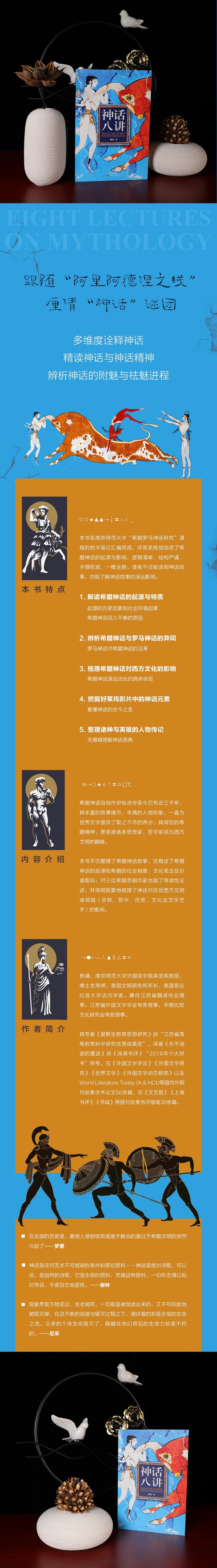 本书前半部分自希腊神话的起源述至现今的神话影视改编,溯原初、演流变、融现代。对神话母题进行阐释的时候,或从城邦制度谈起,揭示古希腊人的价值观;或对比希伯来文明,突显古希腊的人文精神。至近代人文主义复兴,诸学科(哲学、心理、文学)对神话解释及化用,亦有简要概括。zui后,结合现代思想,对改编自希腊神话的电影,也有所点评。 本书的后半部分是作者整理的神话人物小传。