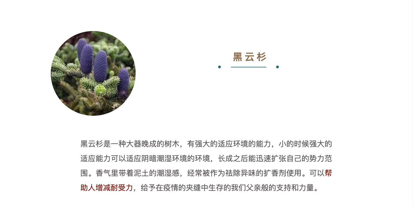 黑云杉、广藿香等气味清爽、久闻不腻的精油