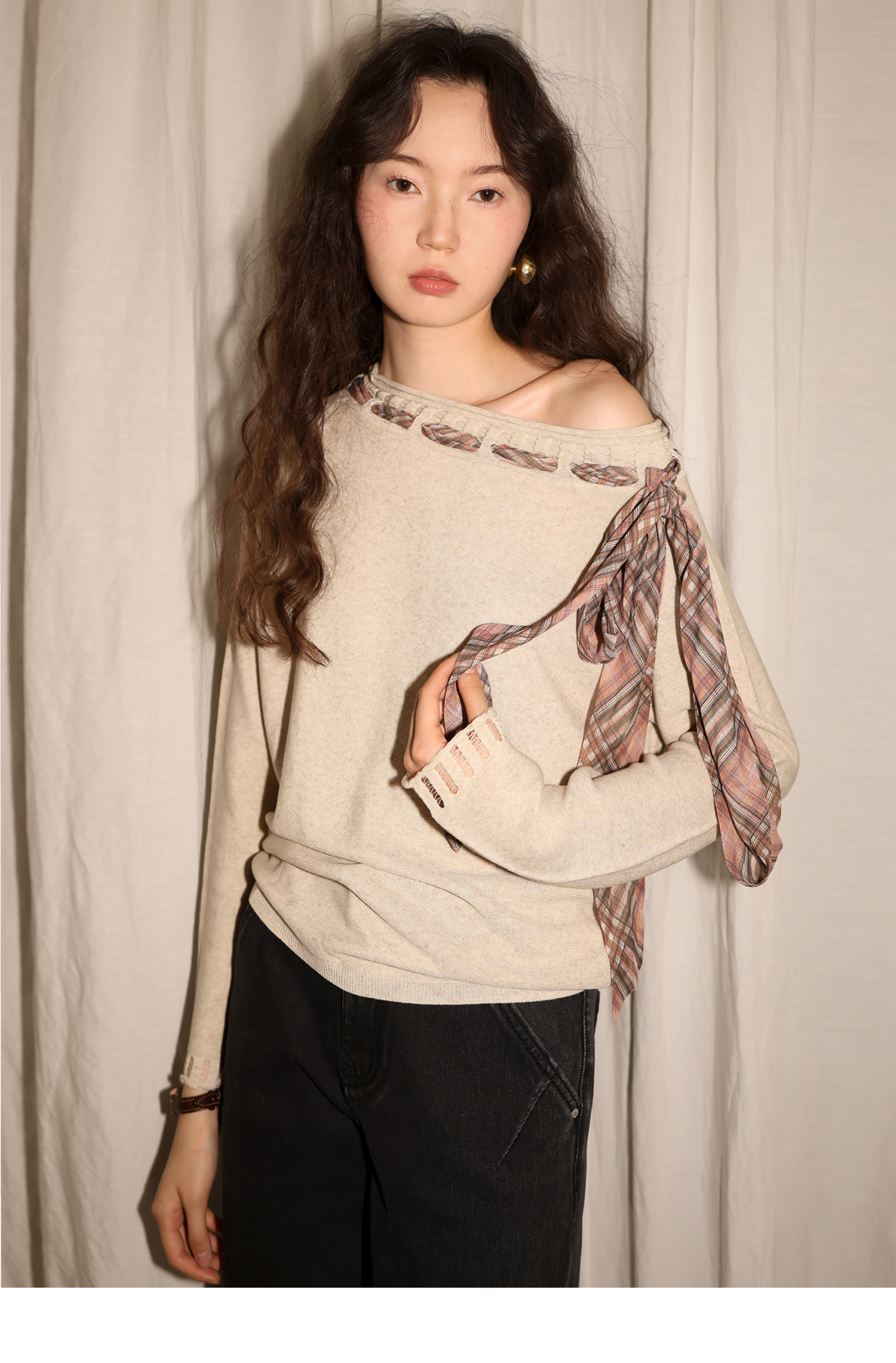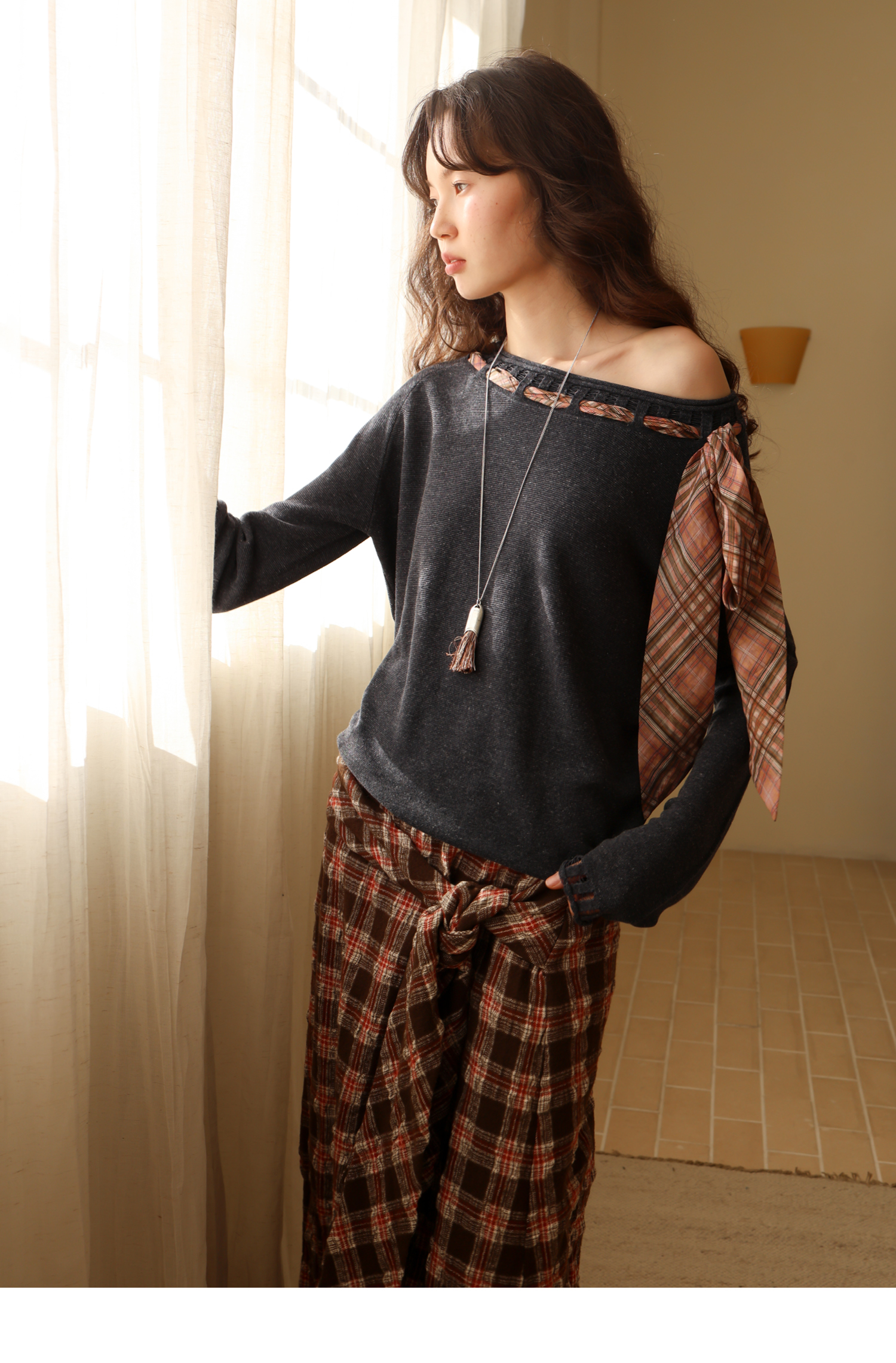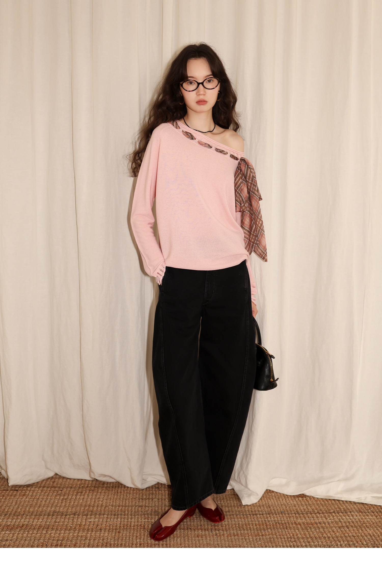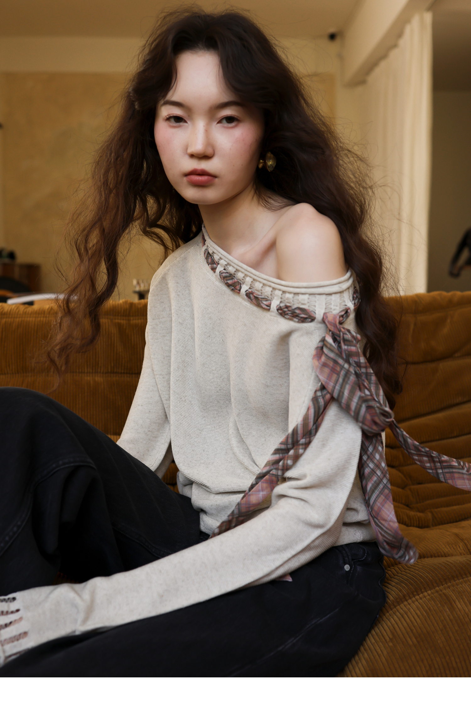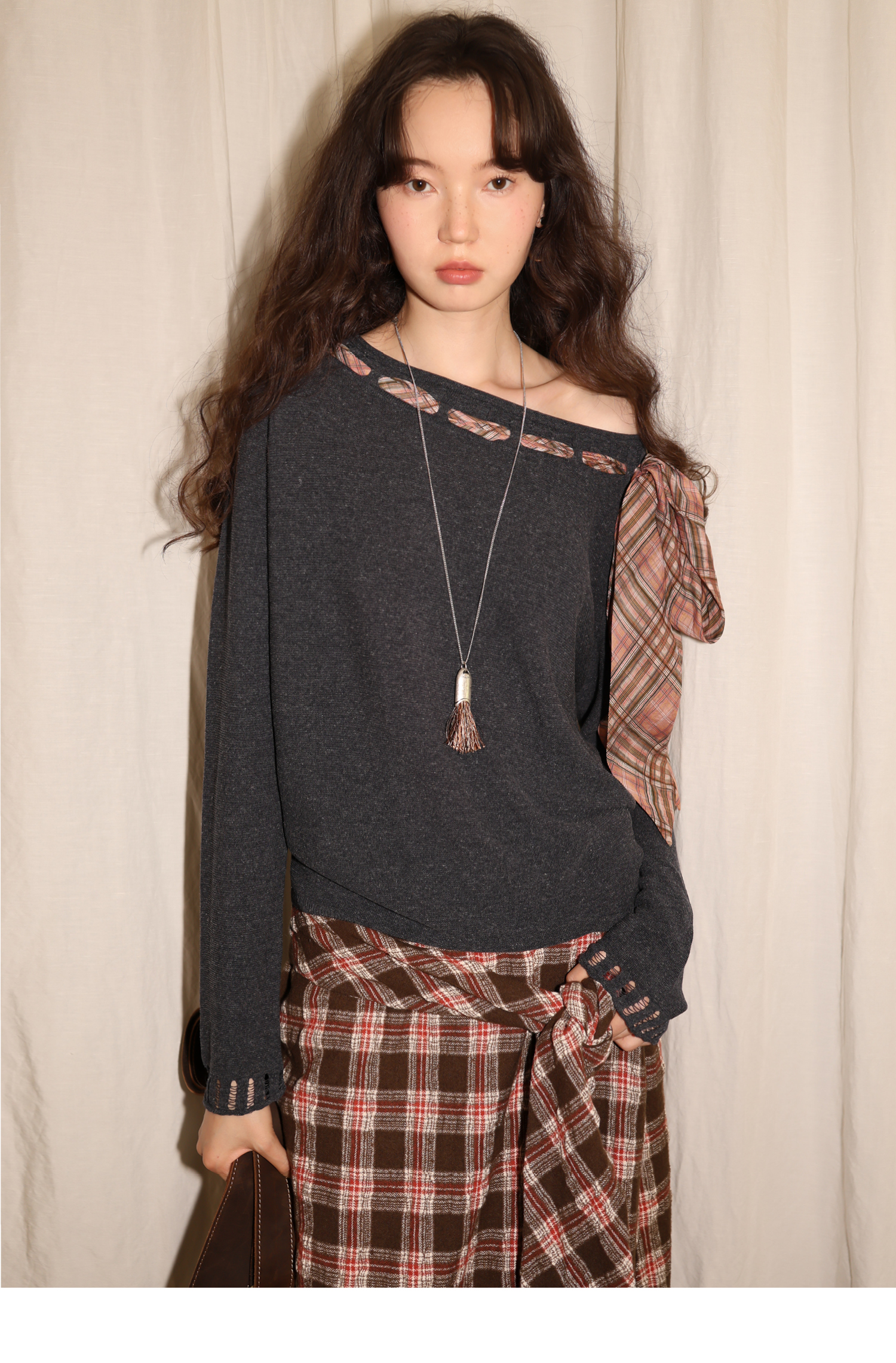 素舶 双层卷边斜肩一字领镂空针织亚麻肌理格纹丝带长袖套衫