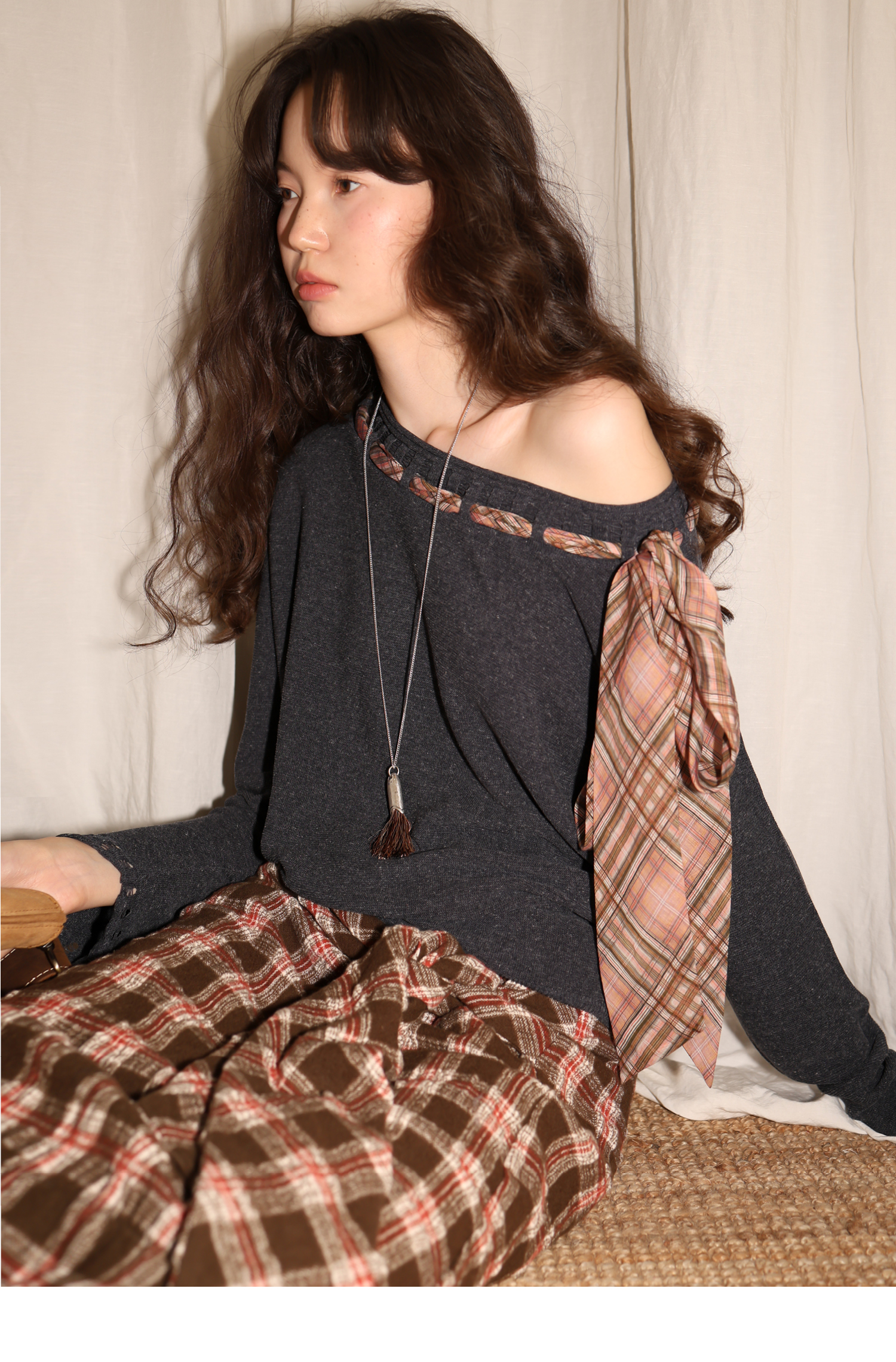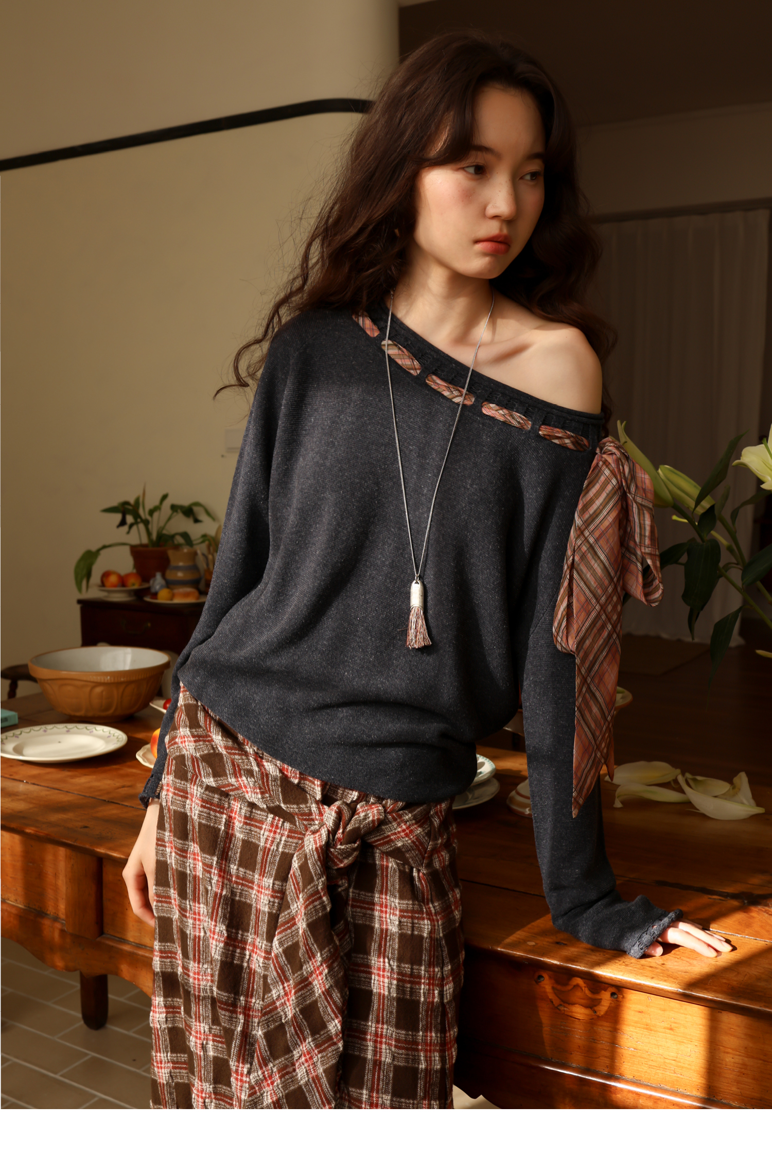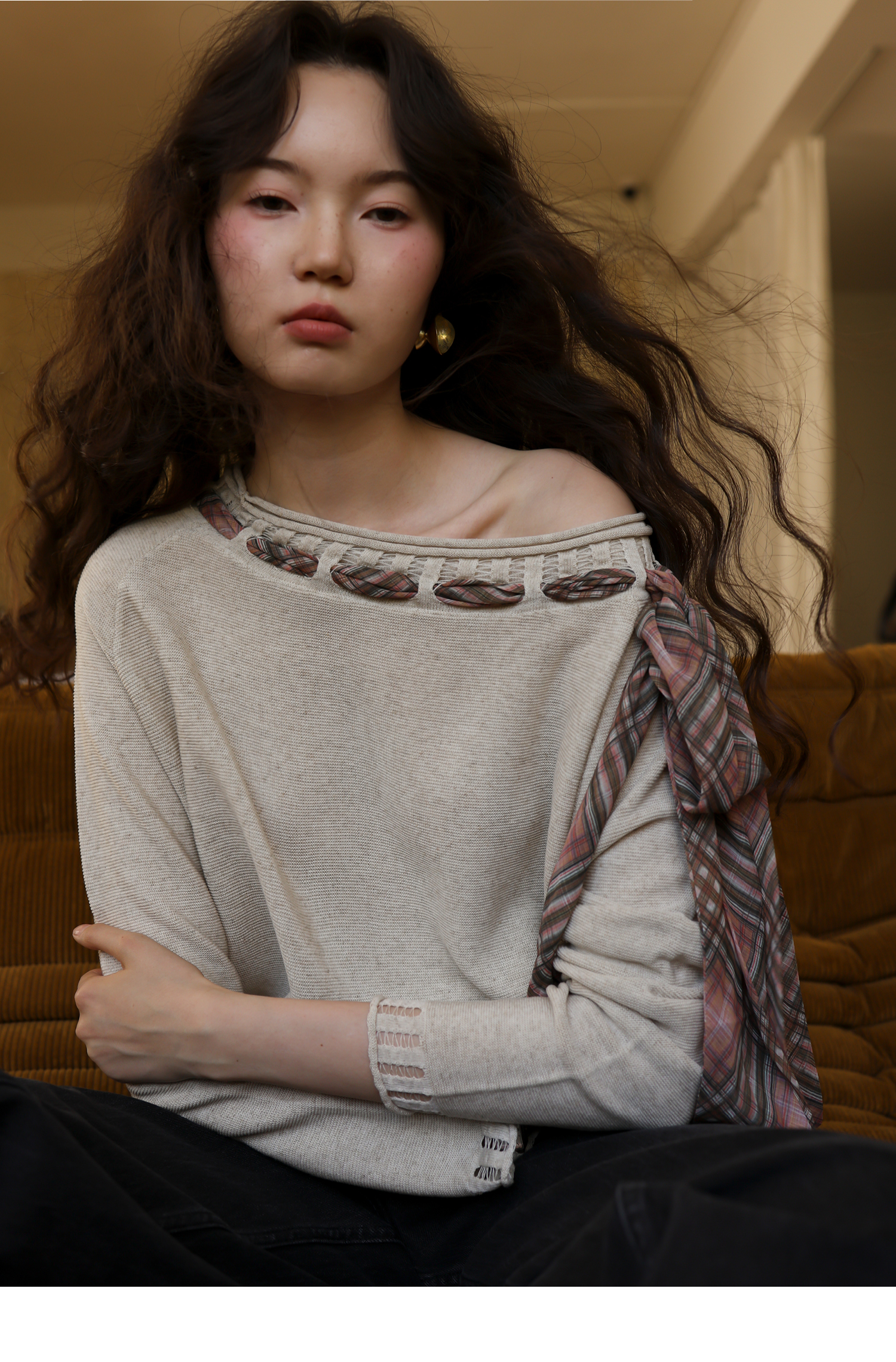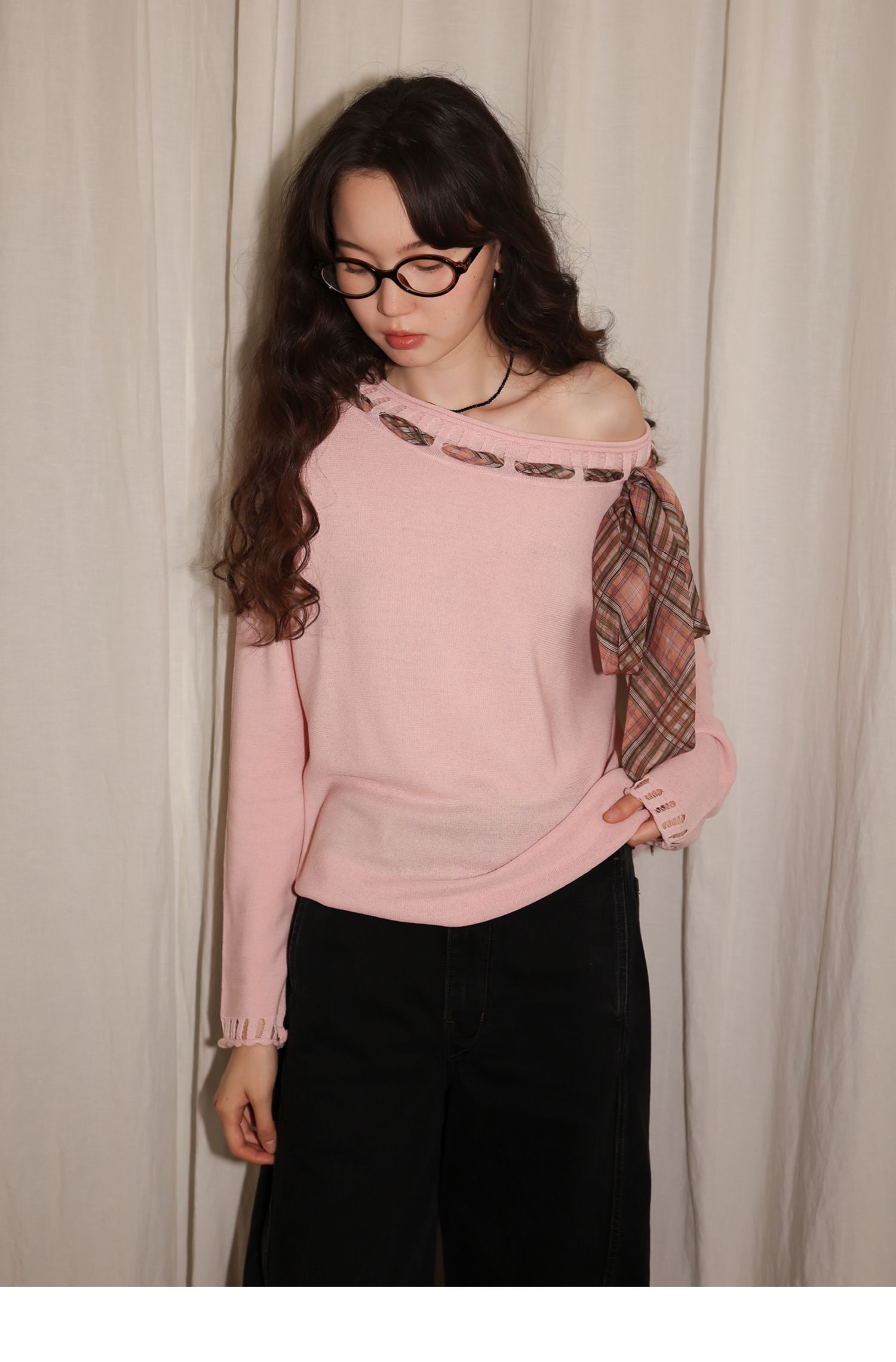 素舶 双层卷边斜肩一字领镂空针织亚麻肌理格纹丝带长袖套衫