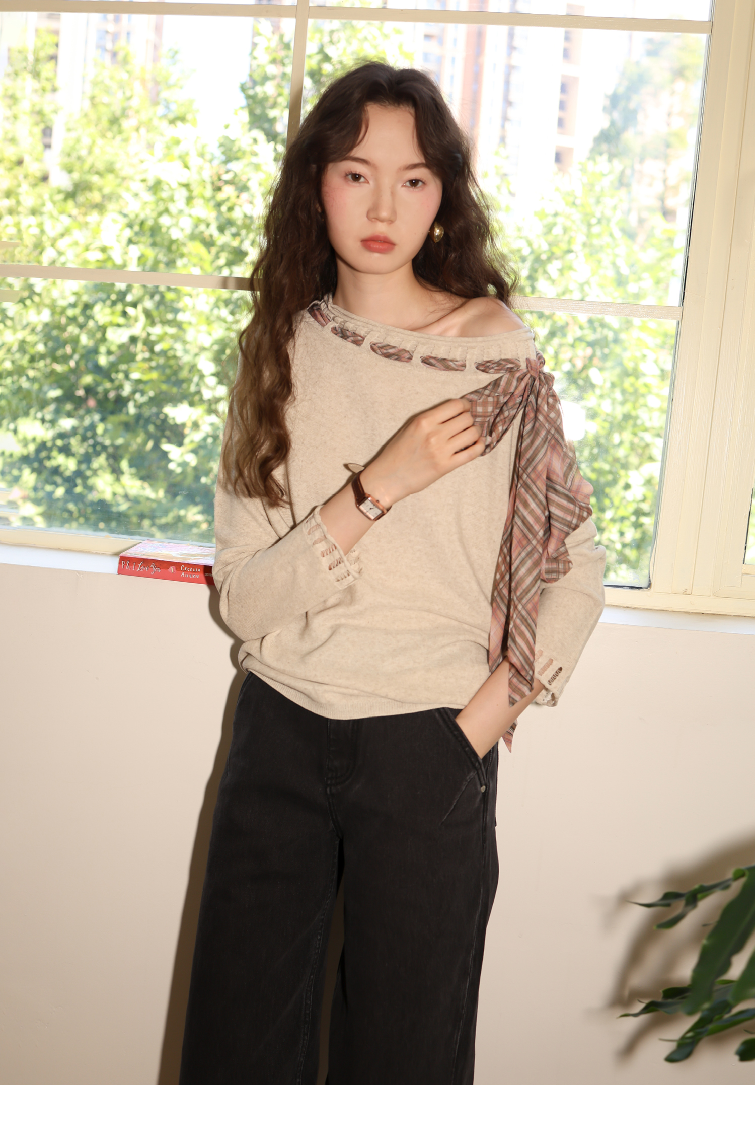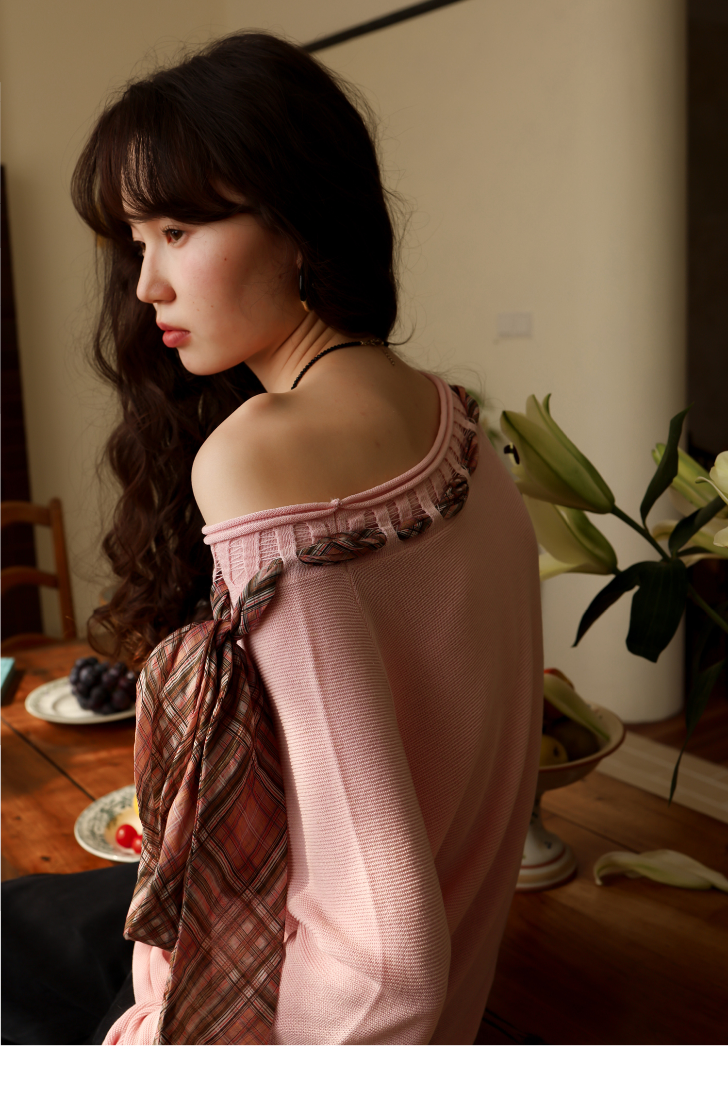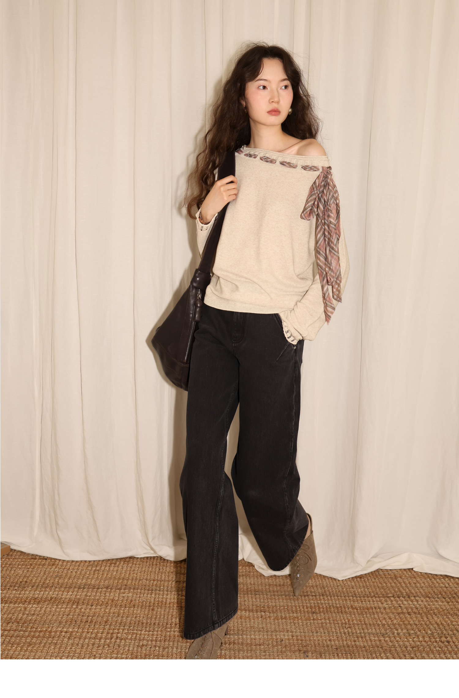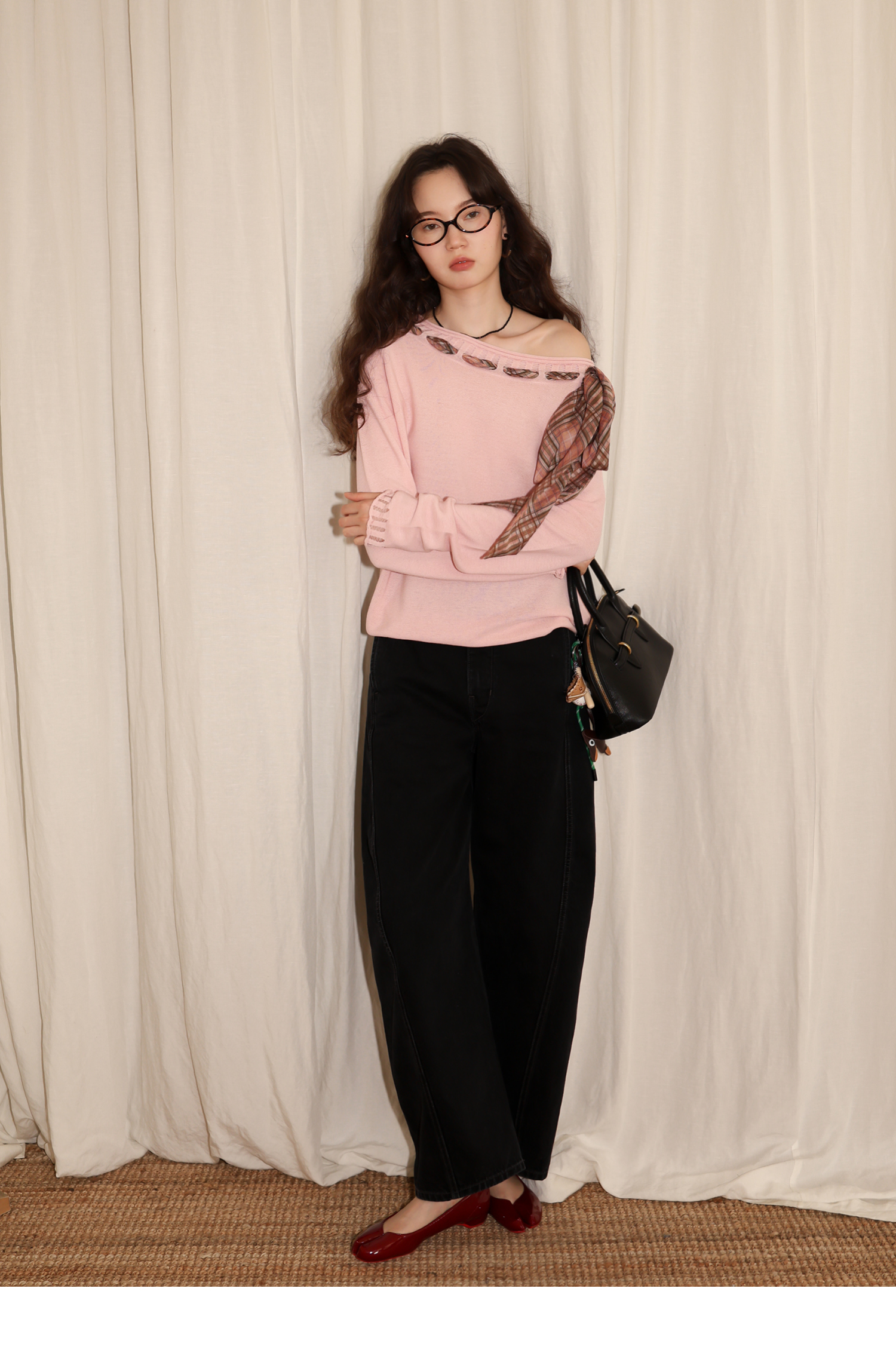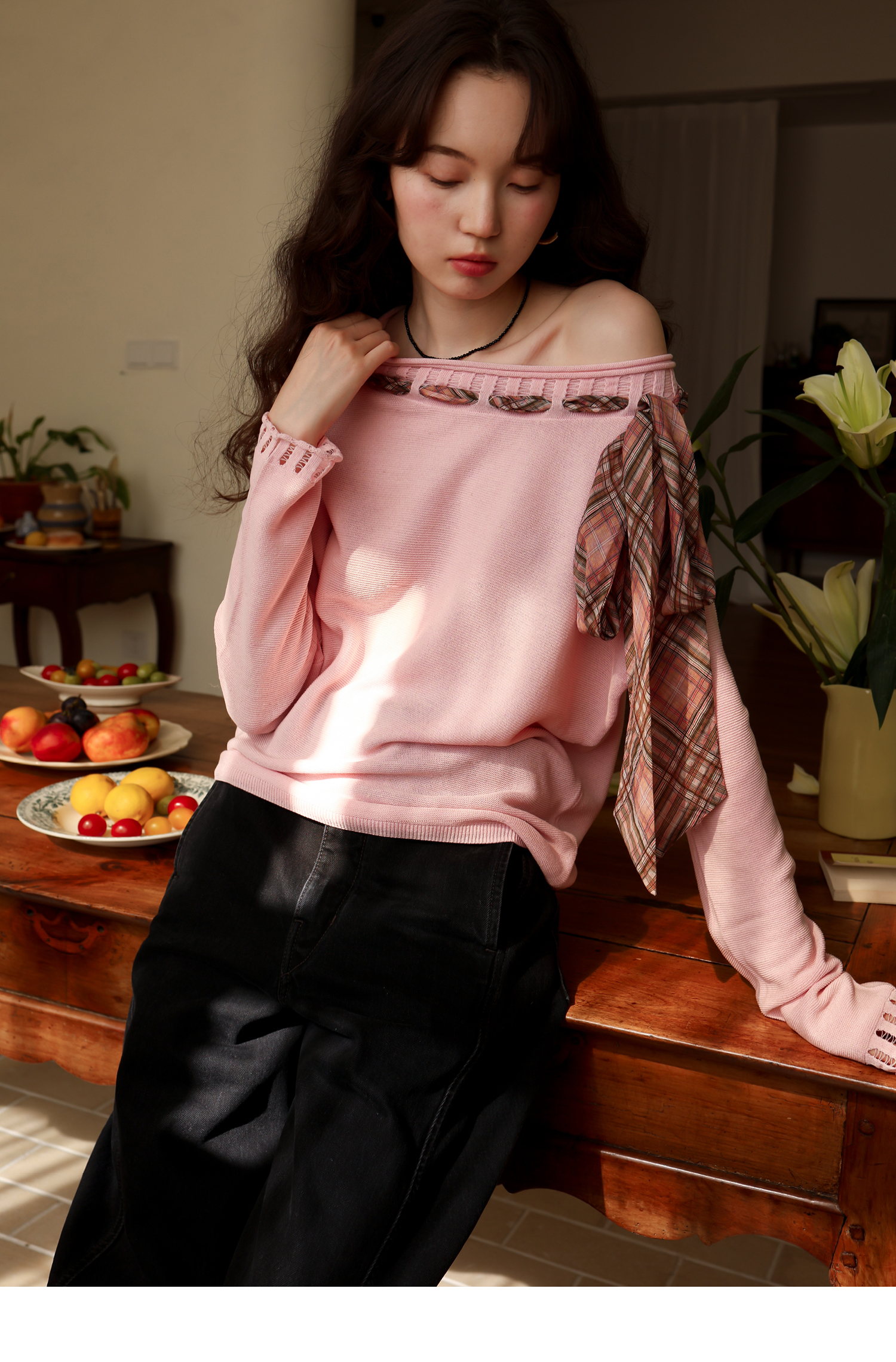 素舶 双层卷边斜肩一字领镂空针织亚麻肌理格纹丝带长袖套衫