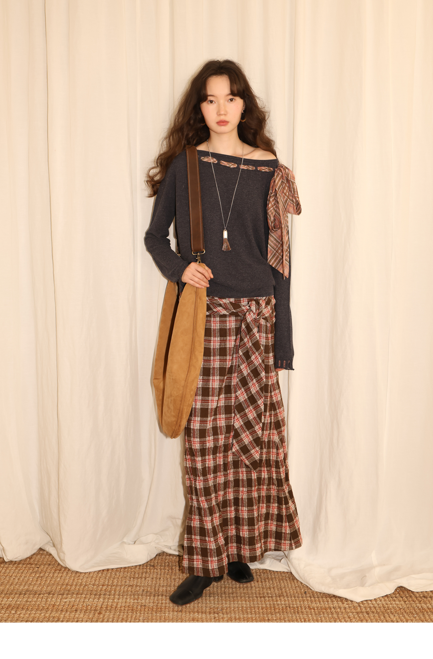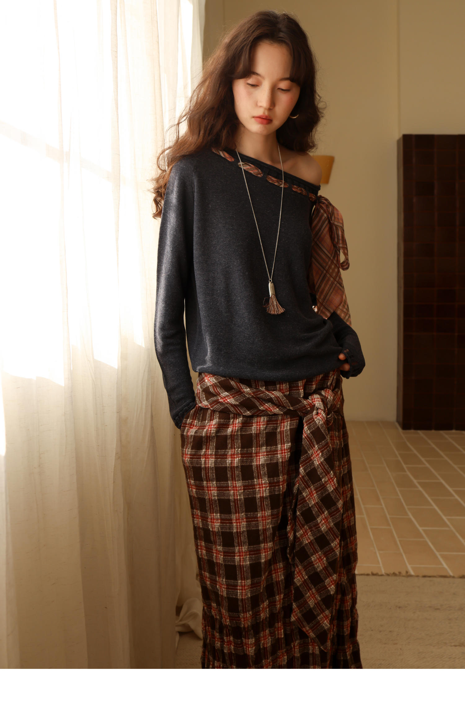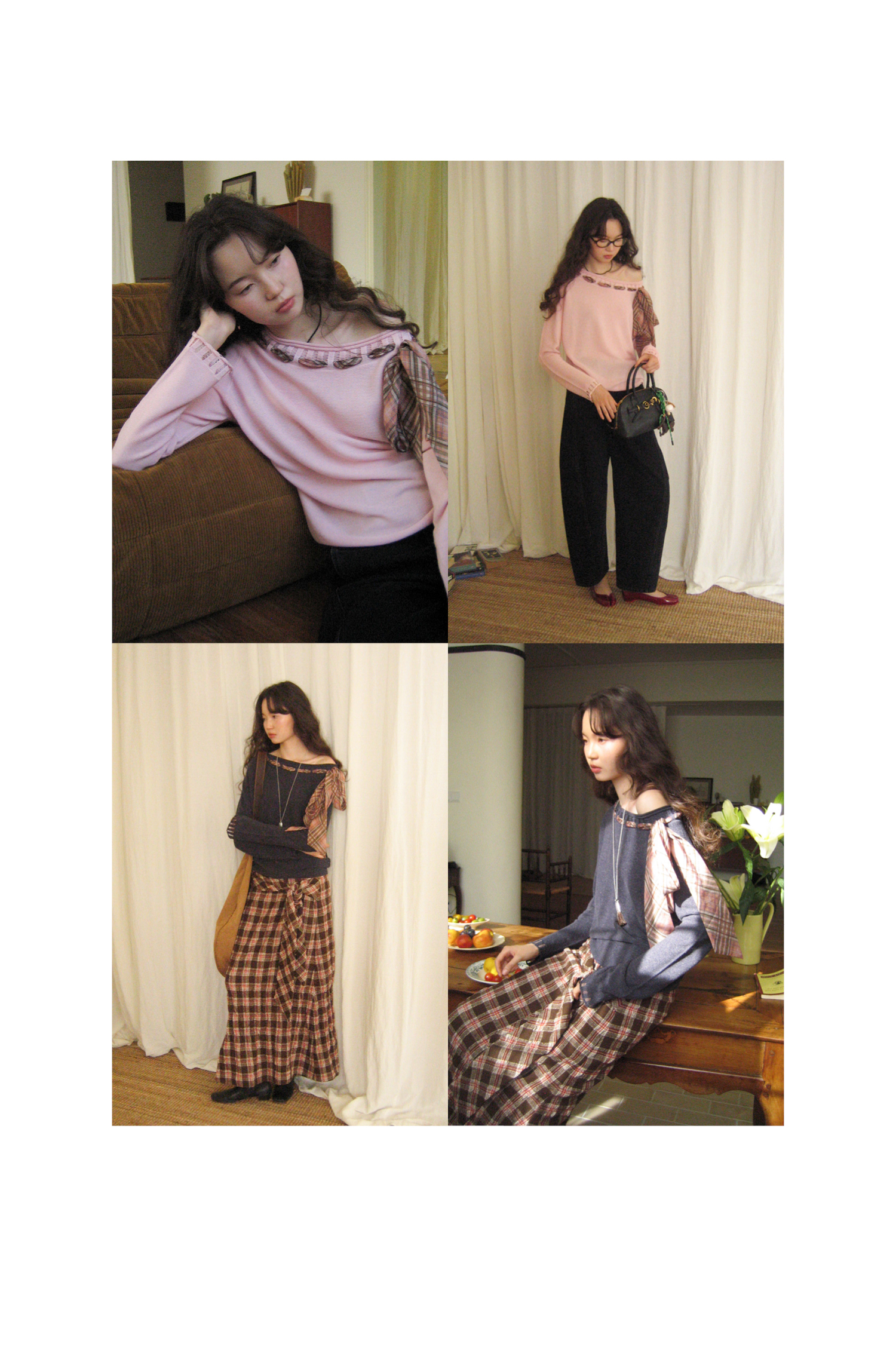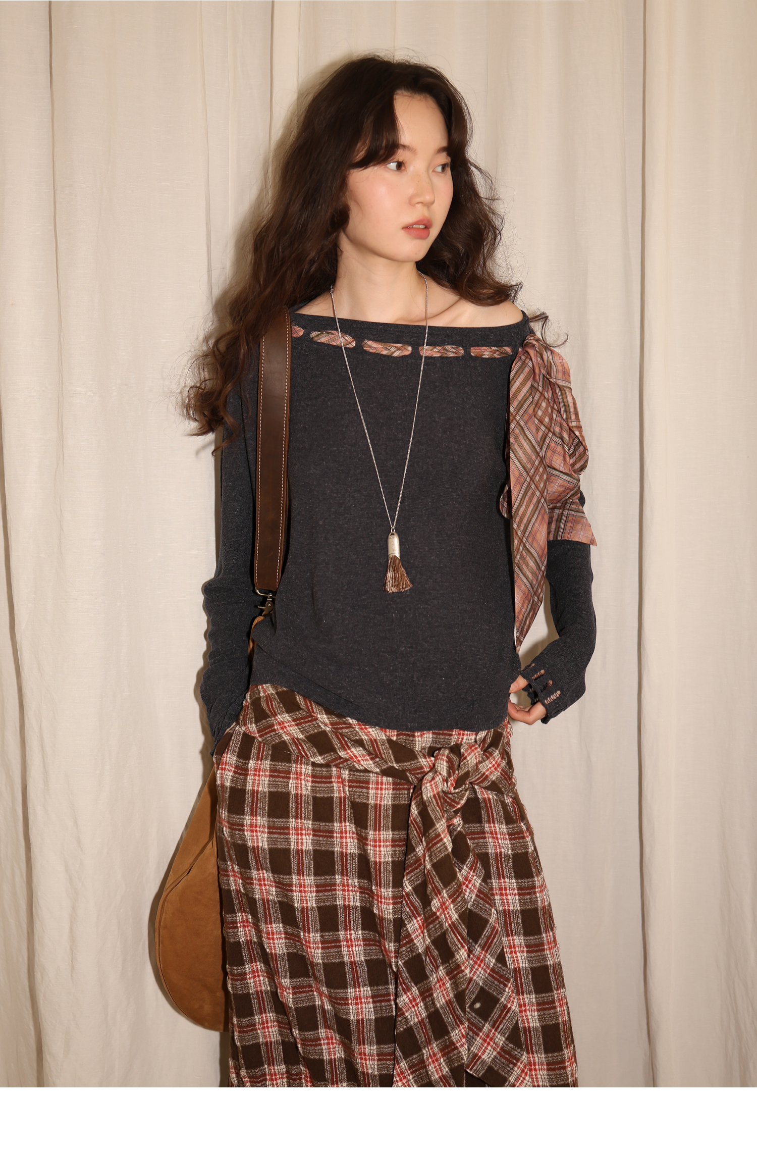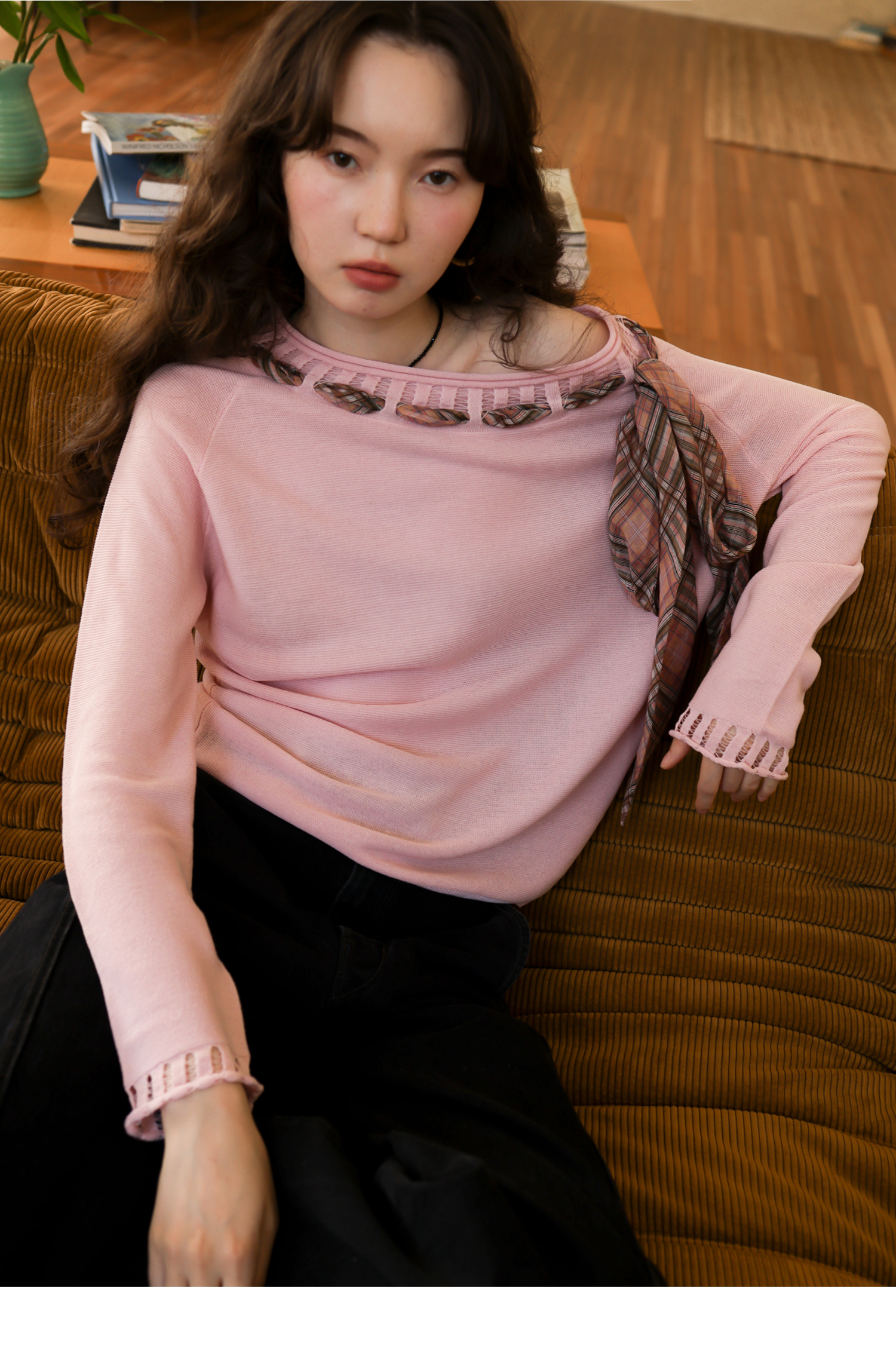 素舶 双层卷边斜肩一字领镂空针织亚麻肌理格纹丝带长袖套衫