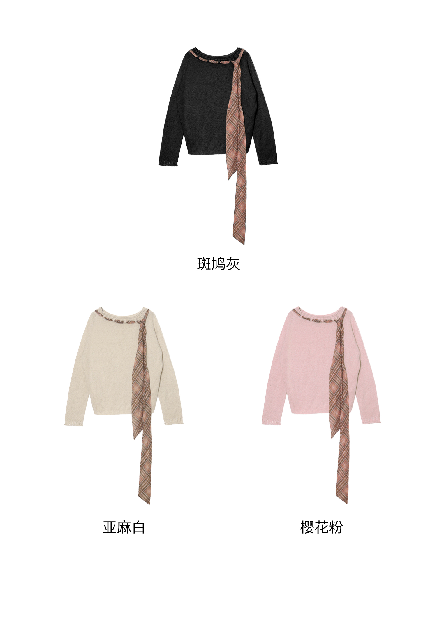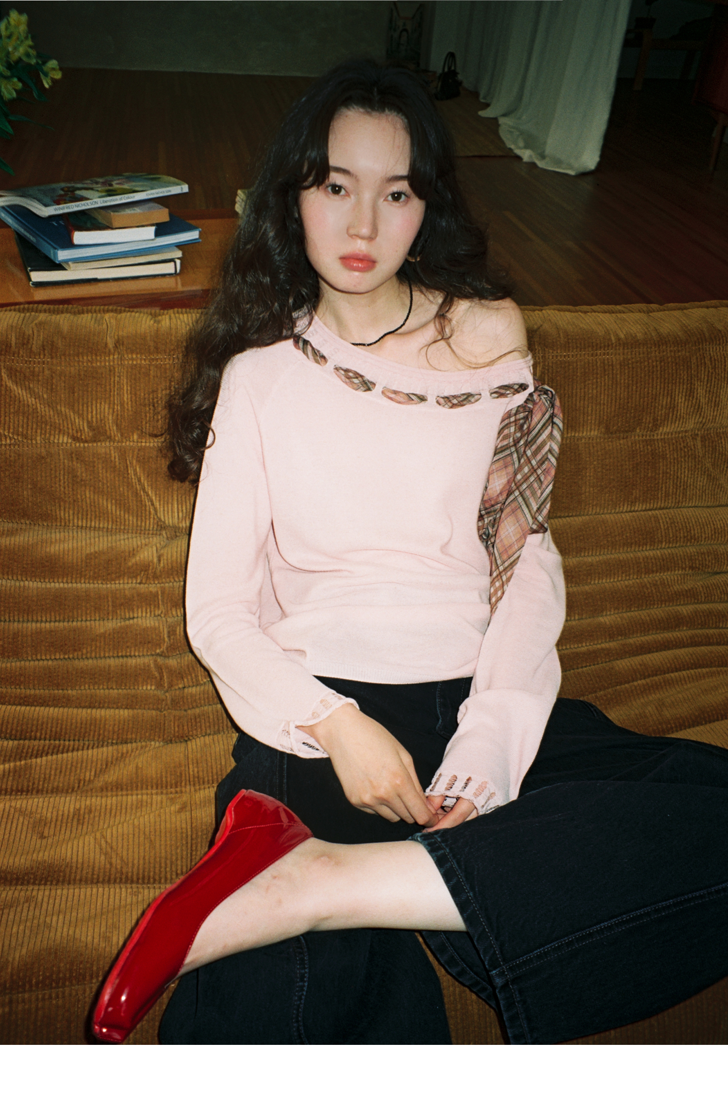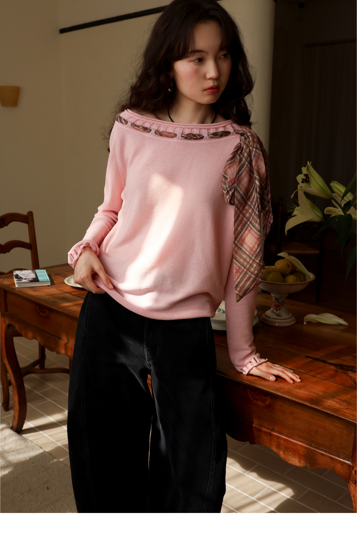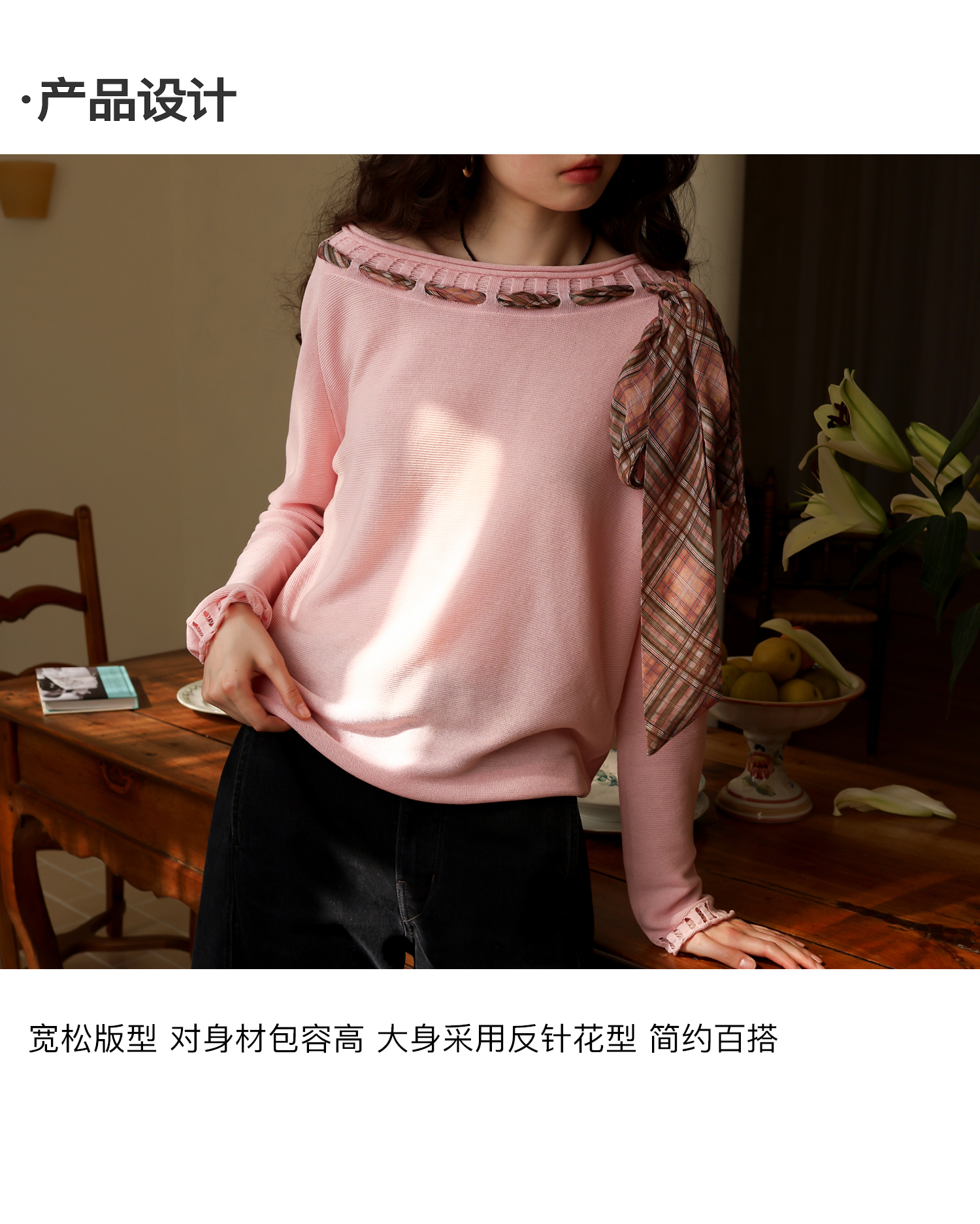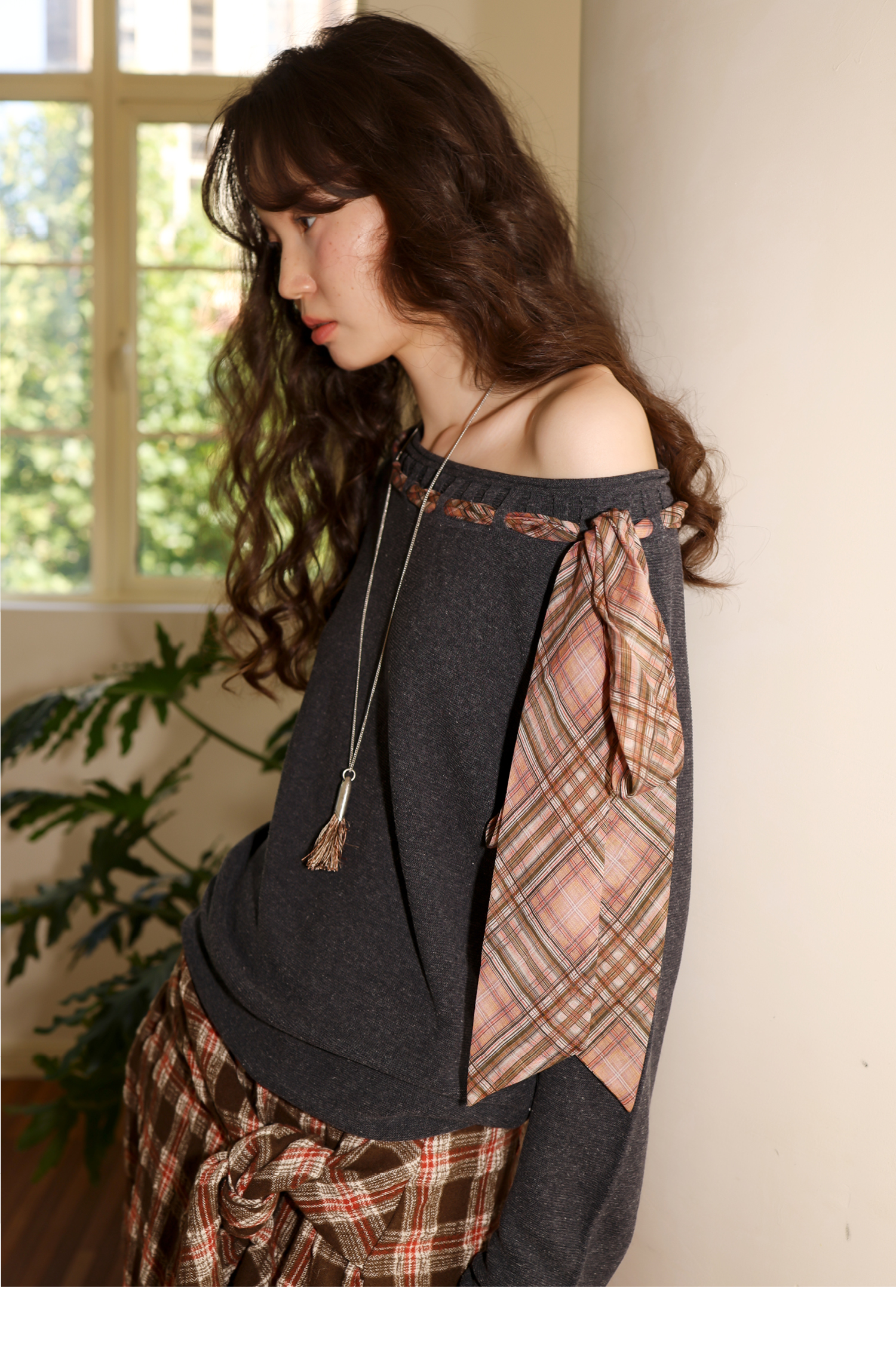 素舶 双层卷边斜肩一字领镂空针织亚麻肌理格纹丝带长袖套衫