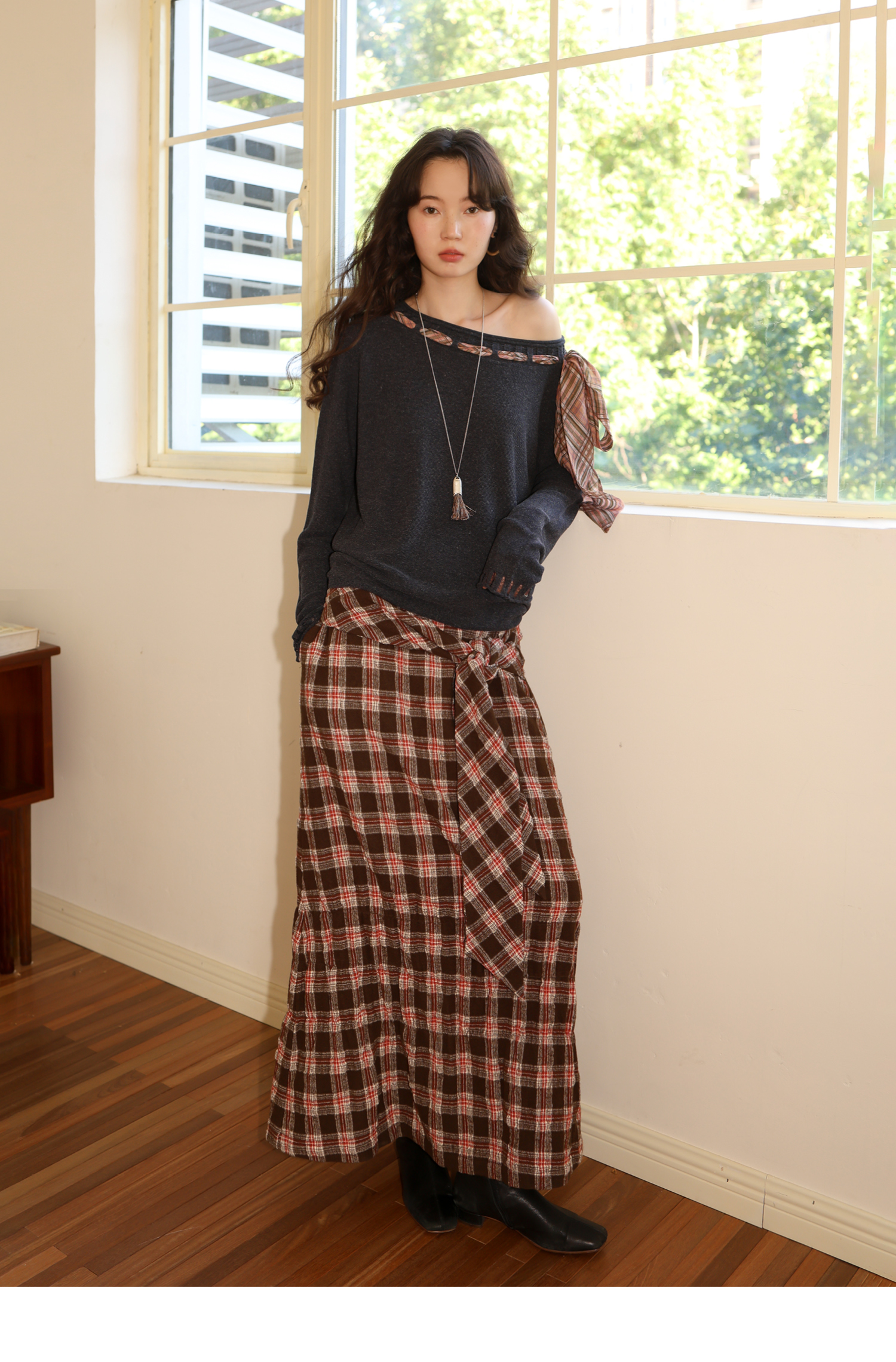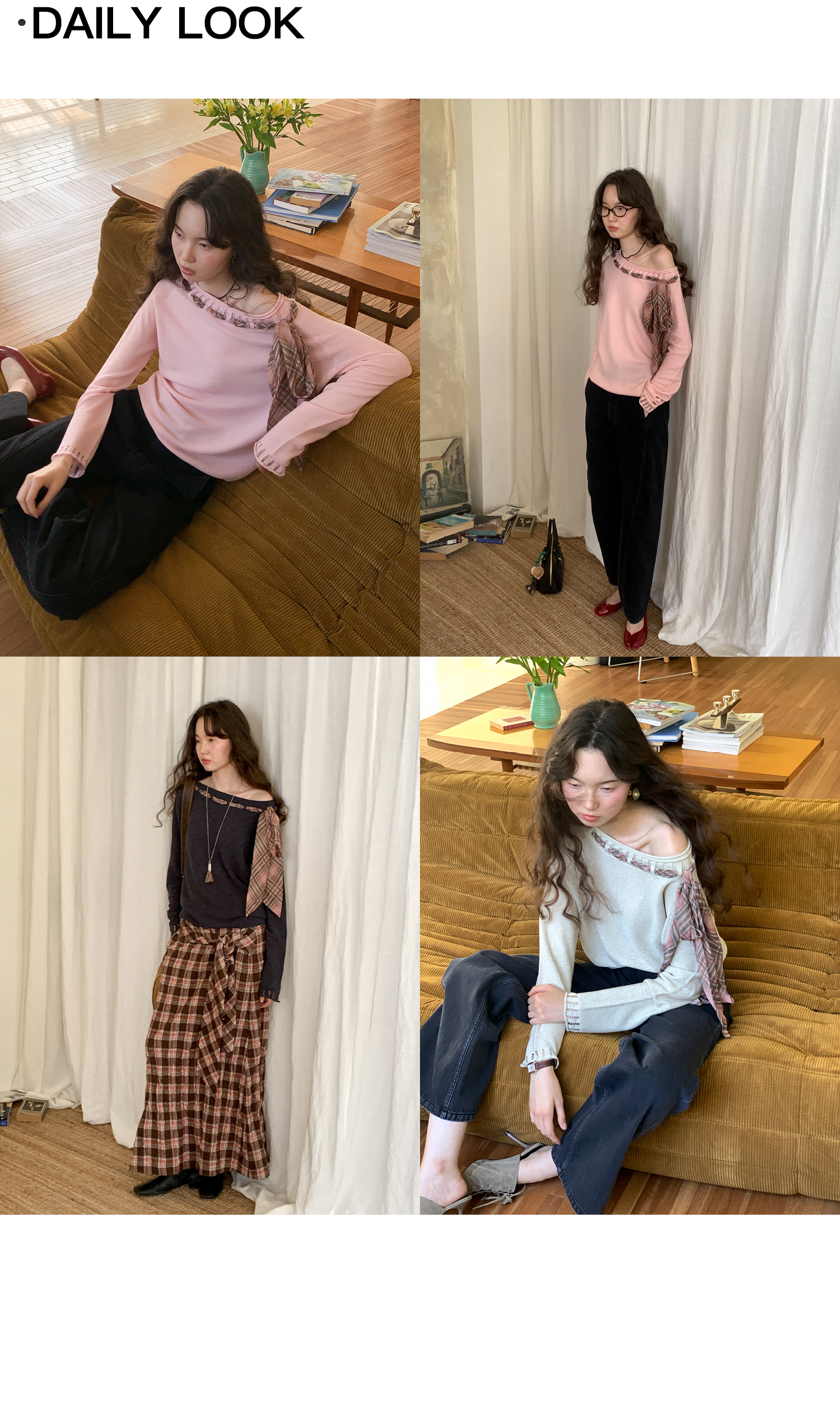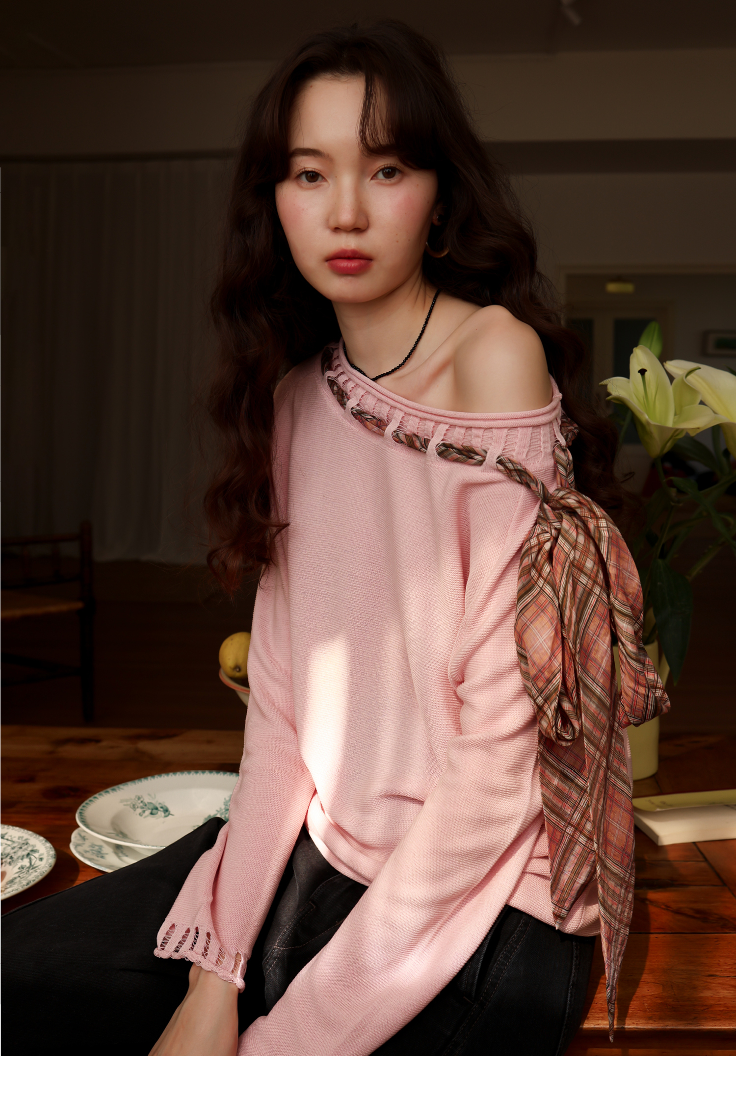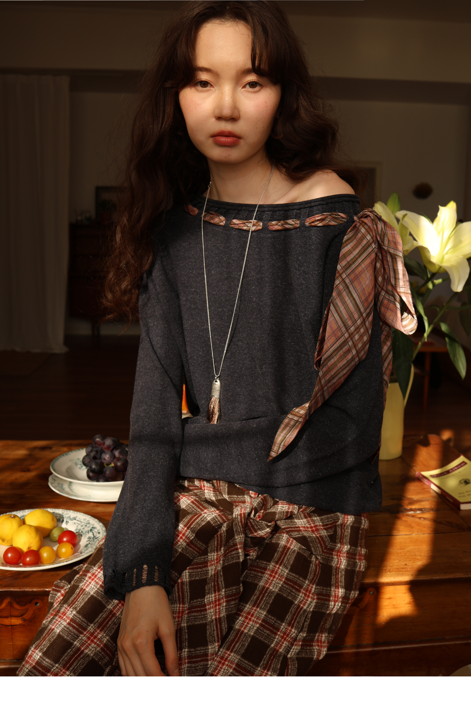 素舶 双层卷边斜肩一字领镂空针织亚麻肌理格纹丝带长袖套衫