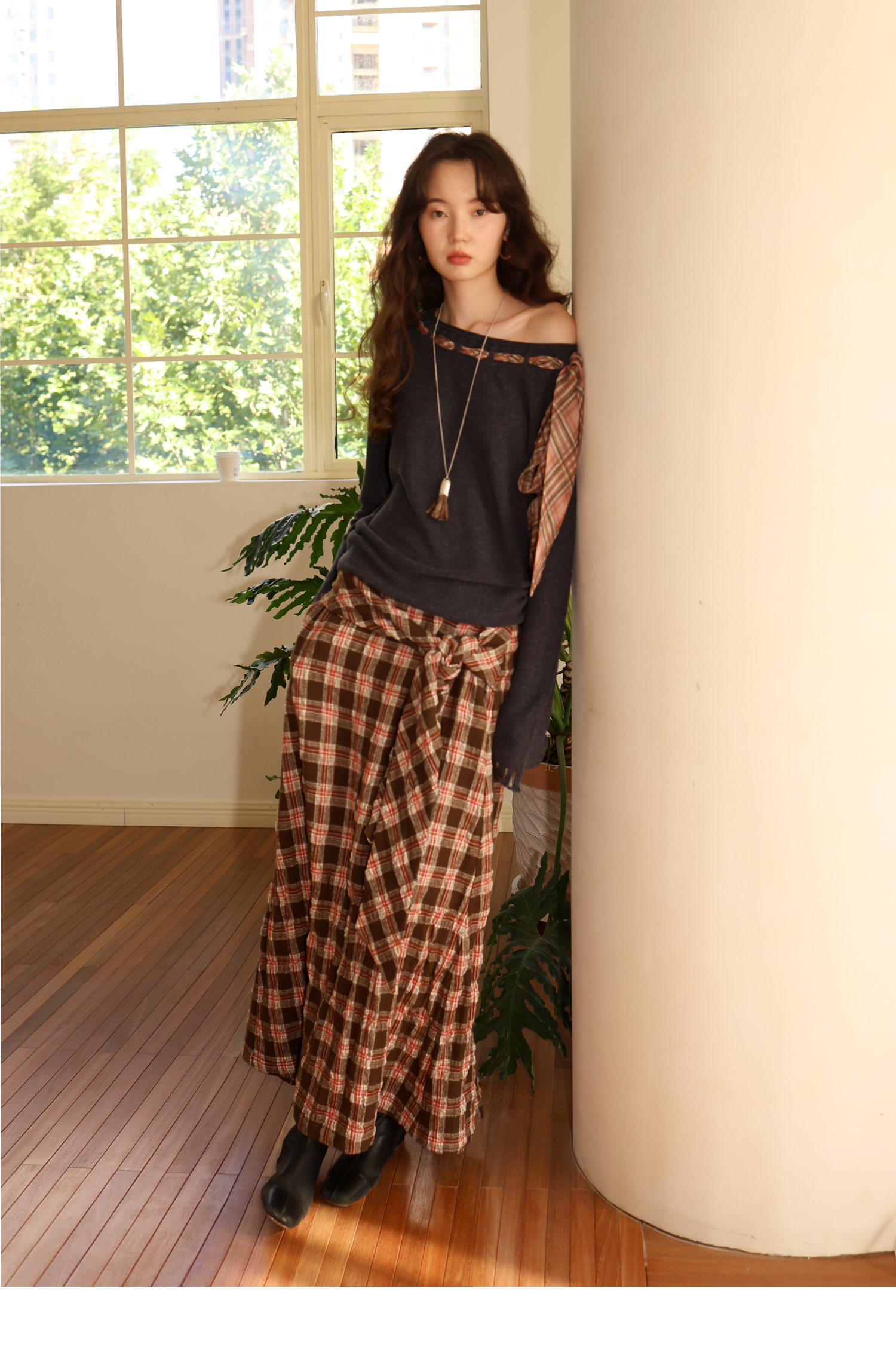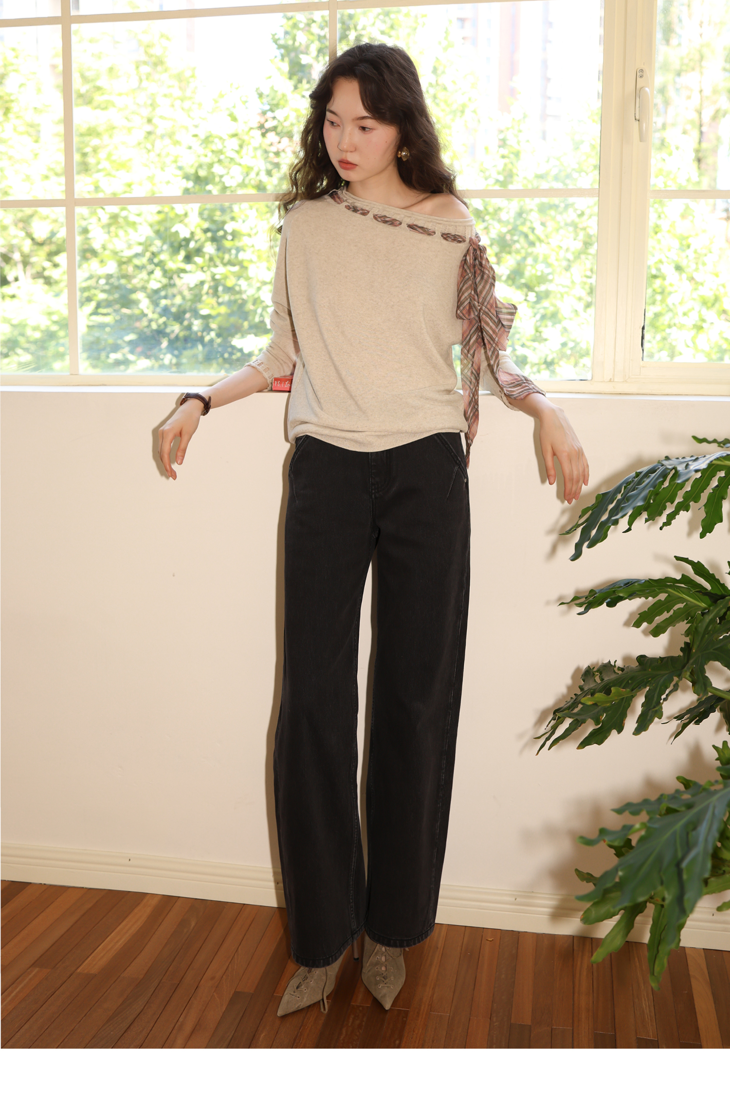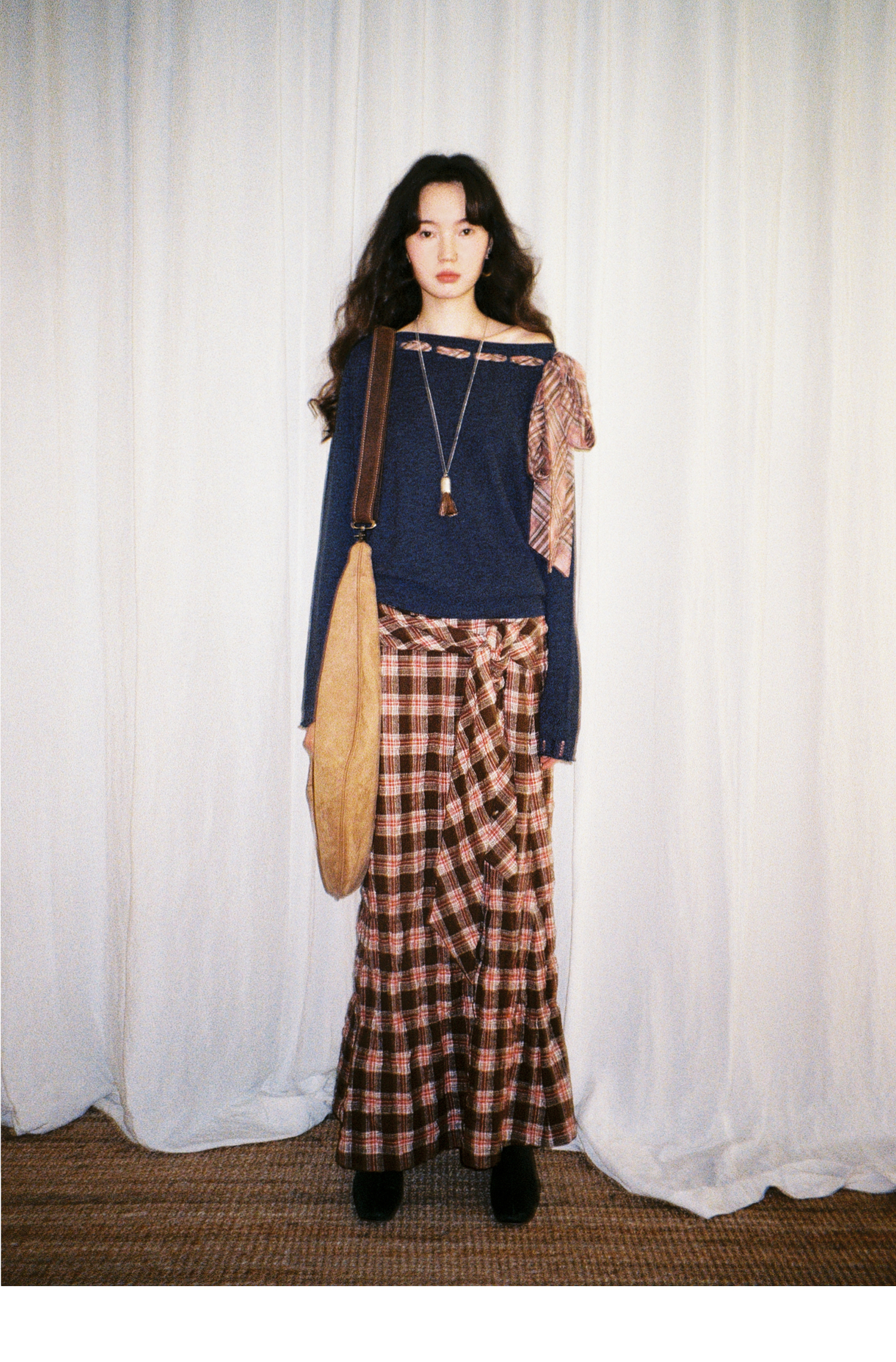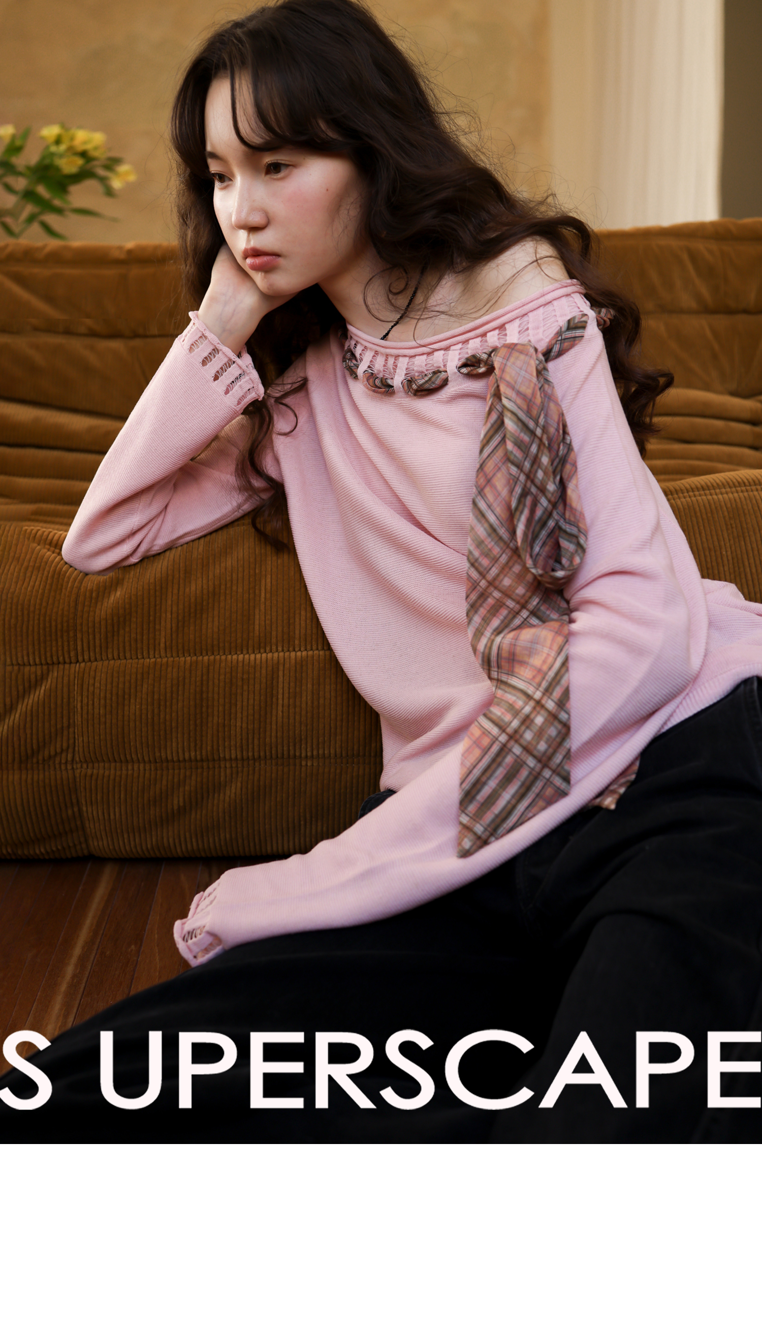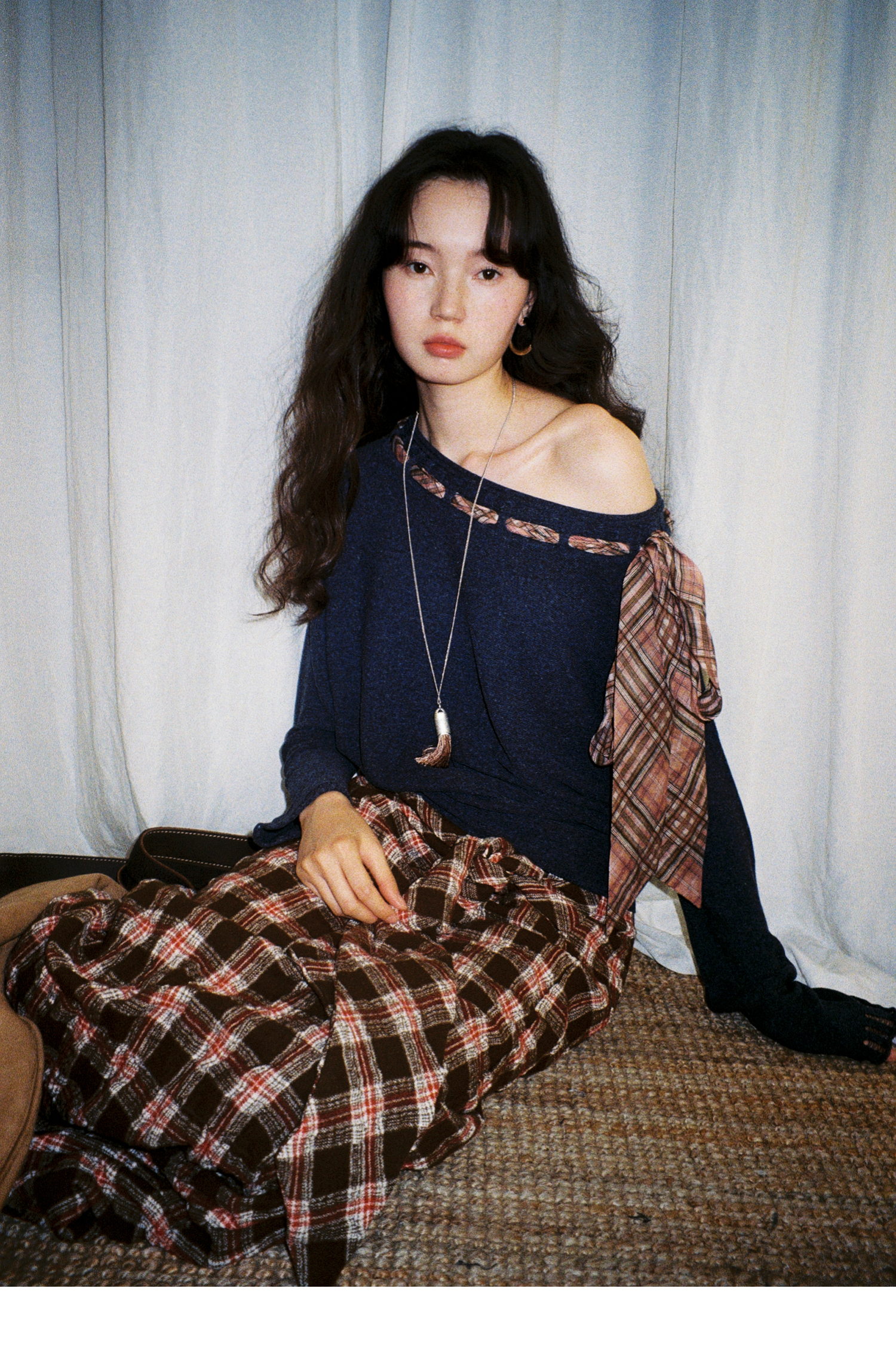 素舶 双层卷边斜肩一字领镂空针织亚麻肌理格纹丝带长袖套衫