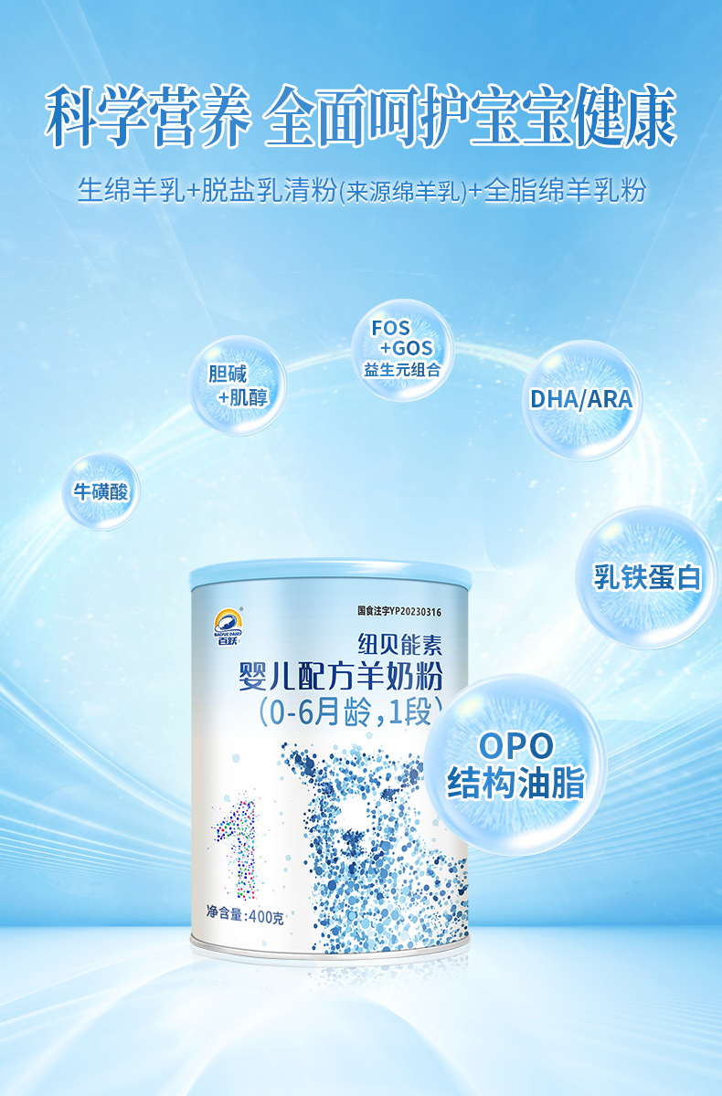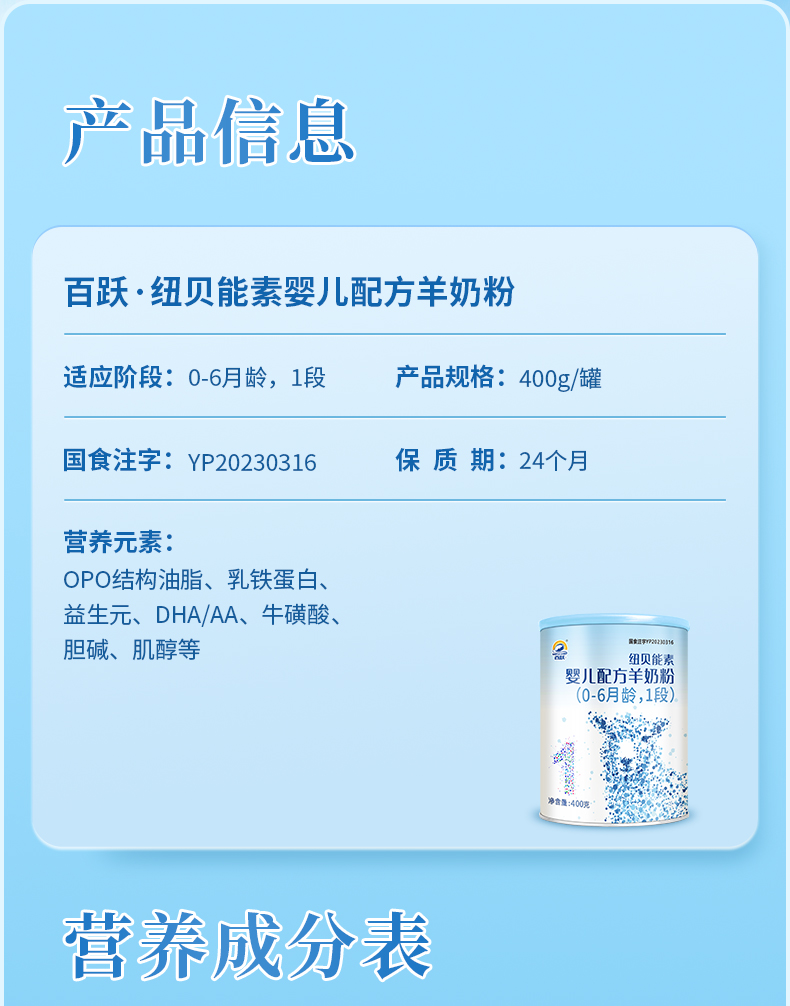 百跃纽贝能素1段婴幼儿配方羊乳粉400g (0-6个月)新生儿宝宝