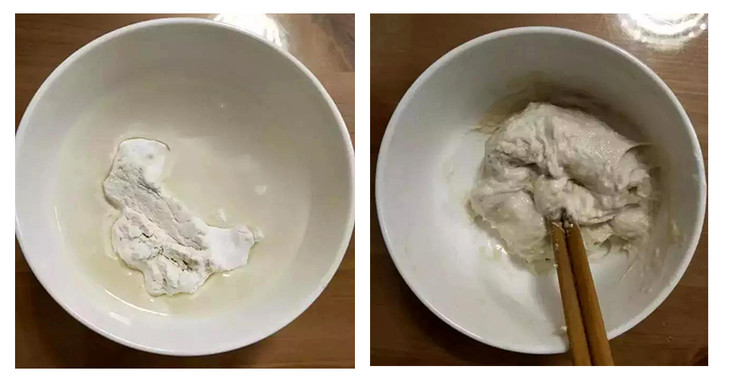 1.筷子稍加搅拌,成一个比较硬的面团。开始搅,或放一会再开始,我的经验,放15-30分钟再搅拌会更顺手。