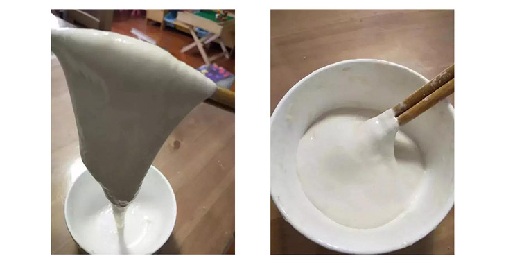 3.不加水醒面:搅到第三张图那样,可以把面团放大约15-30分钟,这个过程称为醒面,继续沾水搅,让面团更软。