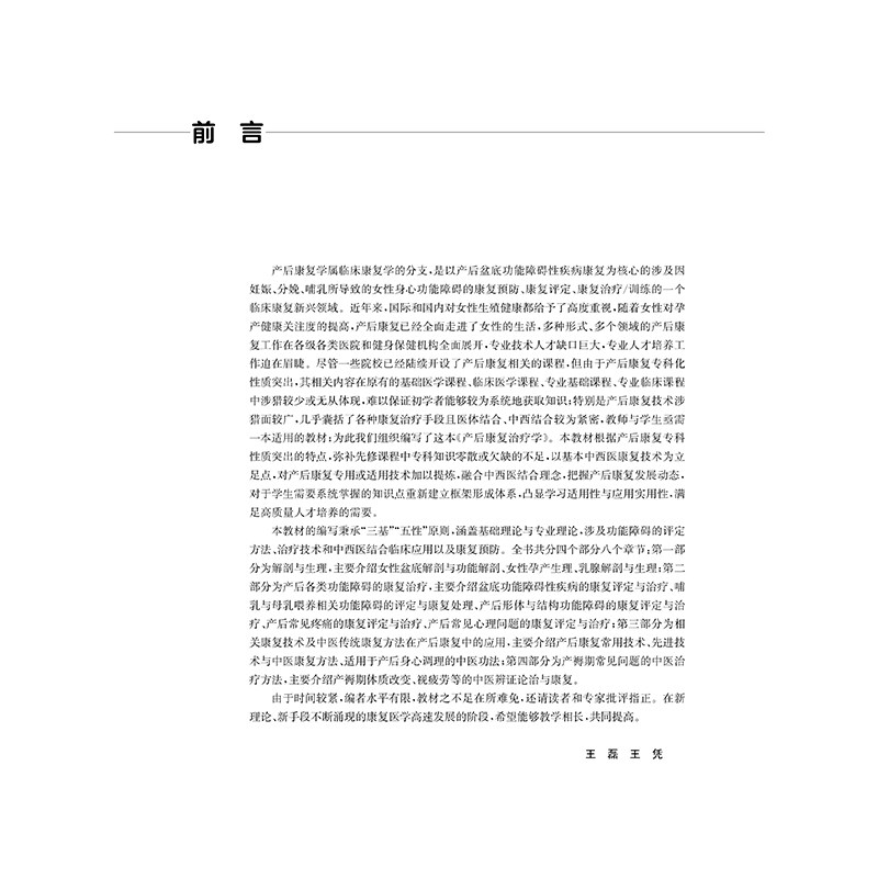 本教材的编写秉承"三基""五性"原则,涵盖基础理论与专业理论,涉及功能障碍的评定方法、治疗技术和中西医结合临床应用以及康复预防。全书共分四个部分八个章节,第一部分为解剖与生理,主要介绍女性盆底解剖与功能解剖、女性孕产生理、乳腺解剖与生理;第二部分为产后各类功能障碍的康复治疗,主要介绍盆底功能障碍性疾病的康复评定与治疗、哺乳与母乳喂养相关功能障碍的评定与康复处理、产后形体与结构功能障碍的康复评定与治疗、产后常见疼痛的康复评定与治疗、产后常见心理问题的康复评定与治疗;第三部分为相关康复技术及中医传统康复方法在产后康复中的应用,主要介绍产后康复常用技术、先进技术与中医康复方法、适用于产后身心调理的中医功法;第四部分为产褥期常见问题的中医治疗方法,主要介绍产褥期体质改变、视疲劳等的中医辨证论治与康复。