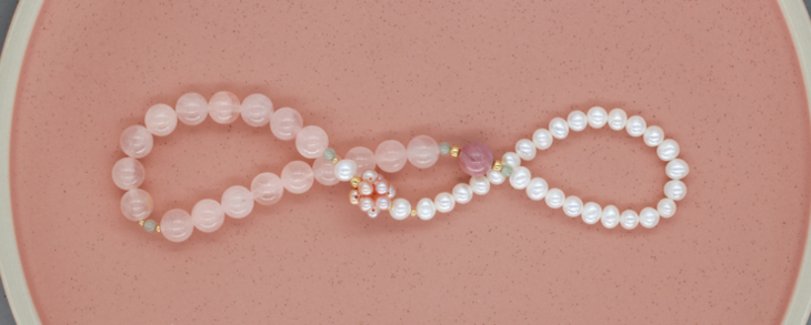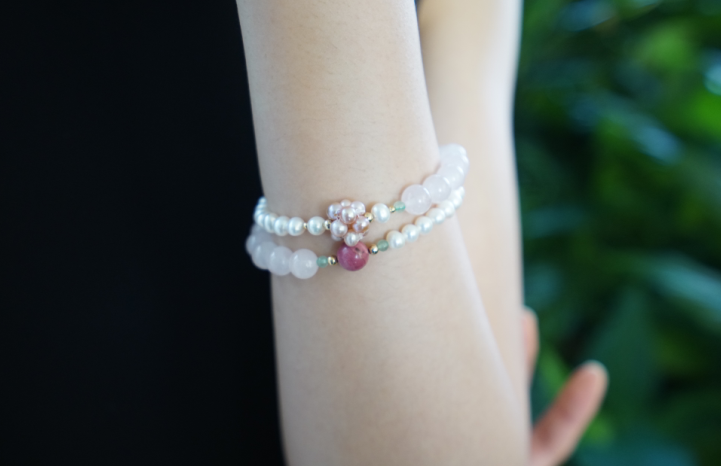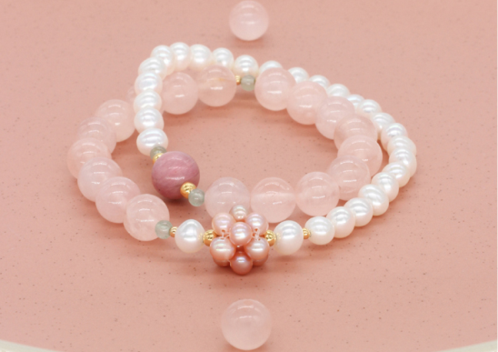 选用代表爱情的粉水晶作为主珠,寓意招桃花,淡水珍珠寓意“你最珍贵”,双圈的设计,让爱紧紧包围。