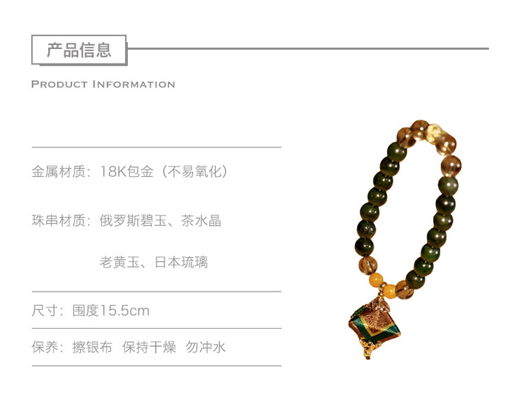 石材:俄罗斯碧玉、茶水晶、老黄玉莲花珠、日本进口琉璃米珠