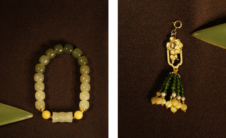 选用和田玉青玉老型桶珠,渐变色温润典雅,手工雕刻的和田玉竹节,寓意“祝福”,用碧玉、珍珠、黄贝穿制的流苏挂坠,可摘取,可以挂在不同的位置。