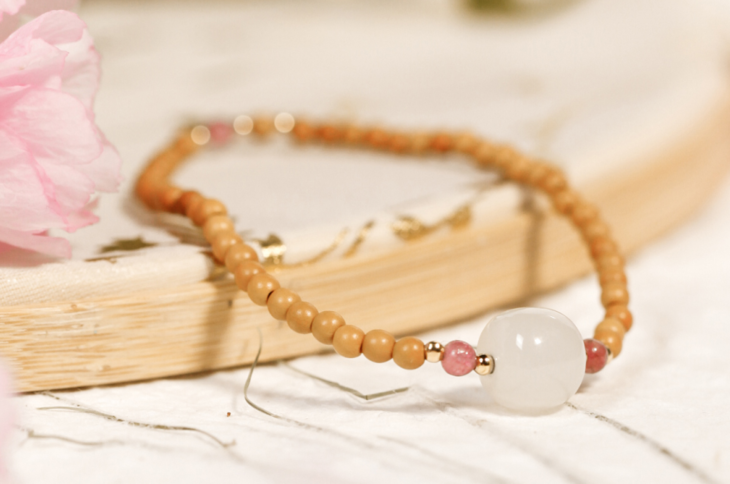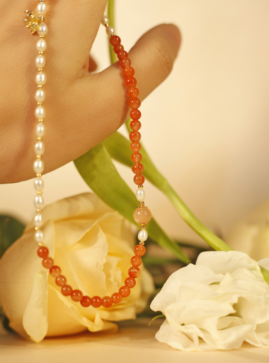 选用南红玛瑙和淡水珍珠作为主珠,汇聚能量的粉橙色太阳石作为点缀,配色极具温柔,用一朵梅花装饰,凸显女性柔美气质。