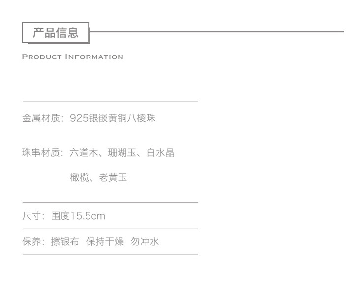 古色古香的设计,也穿插了现代时髦的元素。选用六道木作为主珠,珊瑚玉、老黄玉、白水晶作为搭配,整体配色文艺素净。