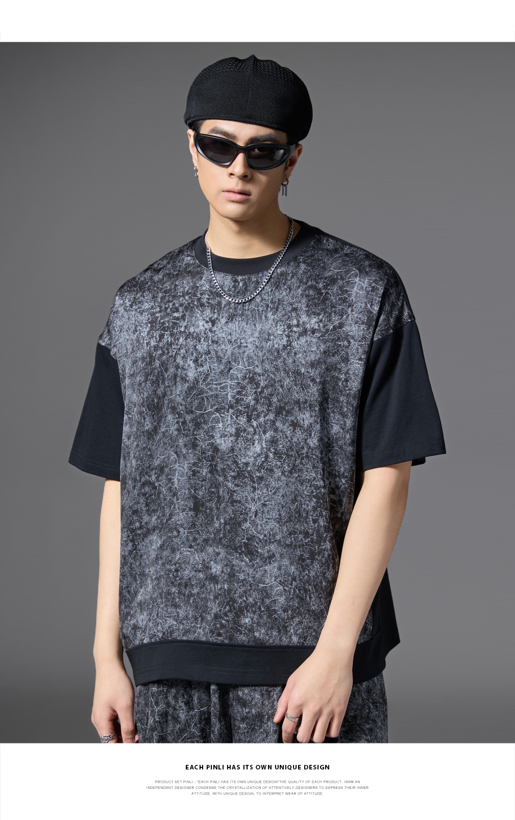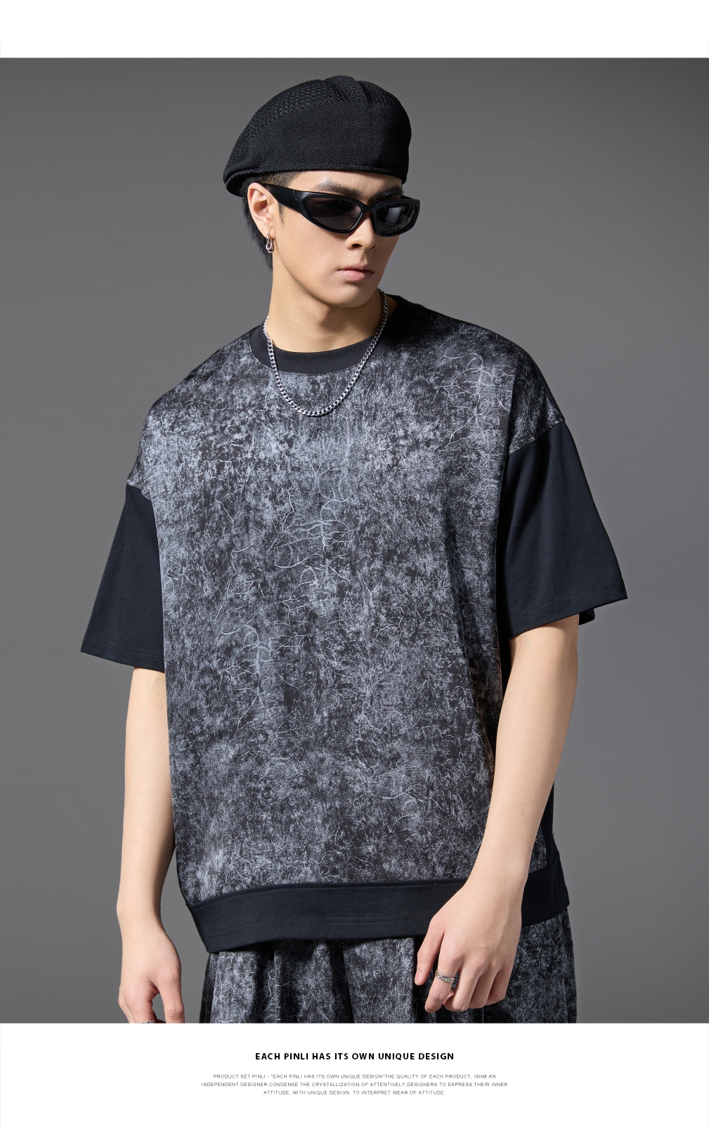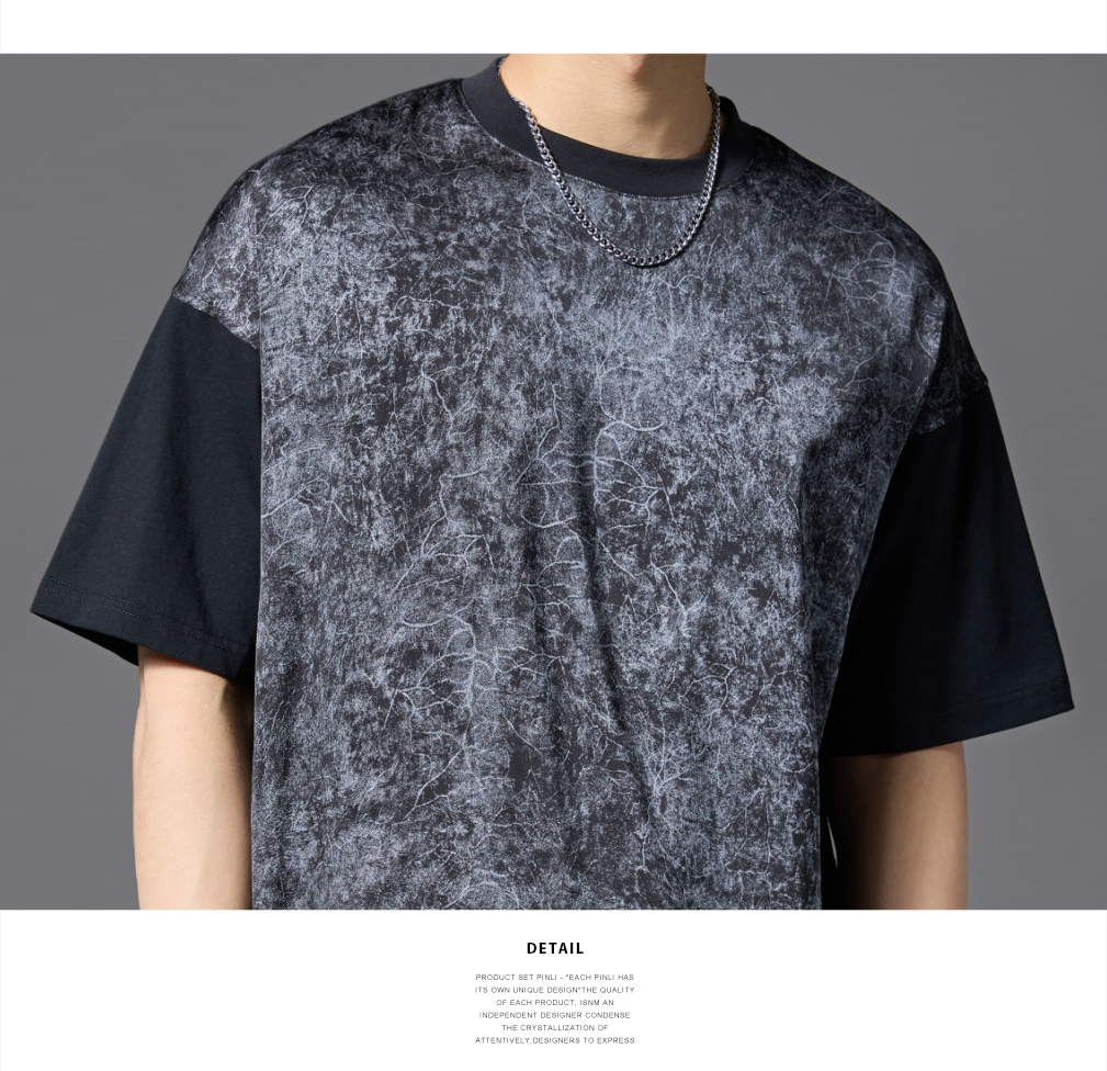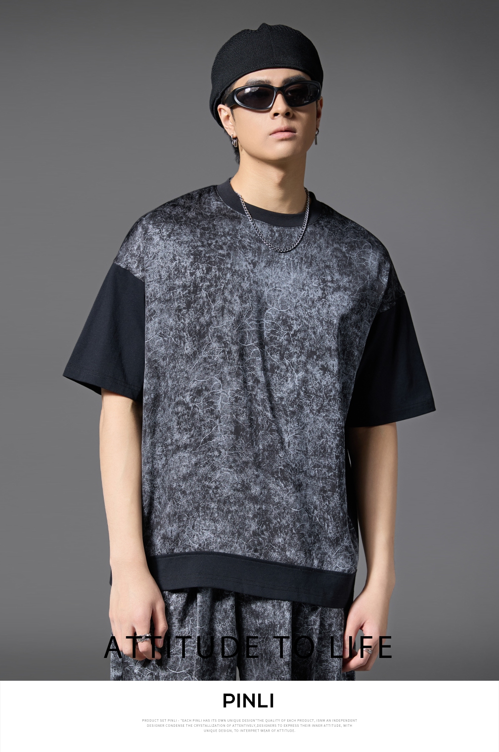 PINLI品立2025春夏新款晕染印花宽松T恤男士国潮休闲拼接短袖上衣B252111006