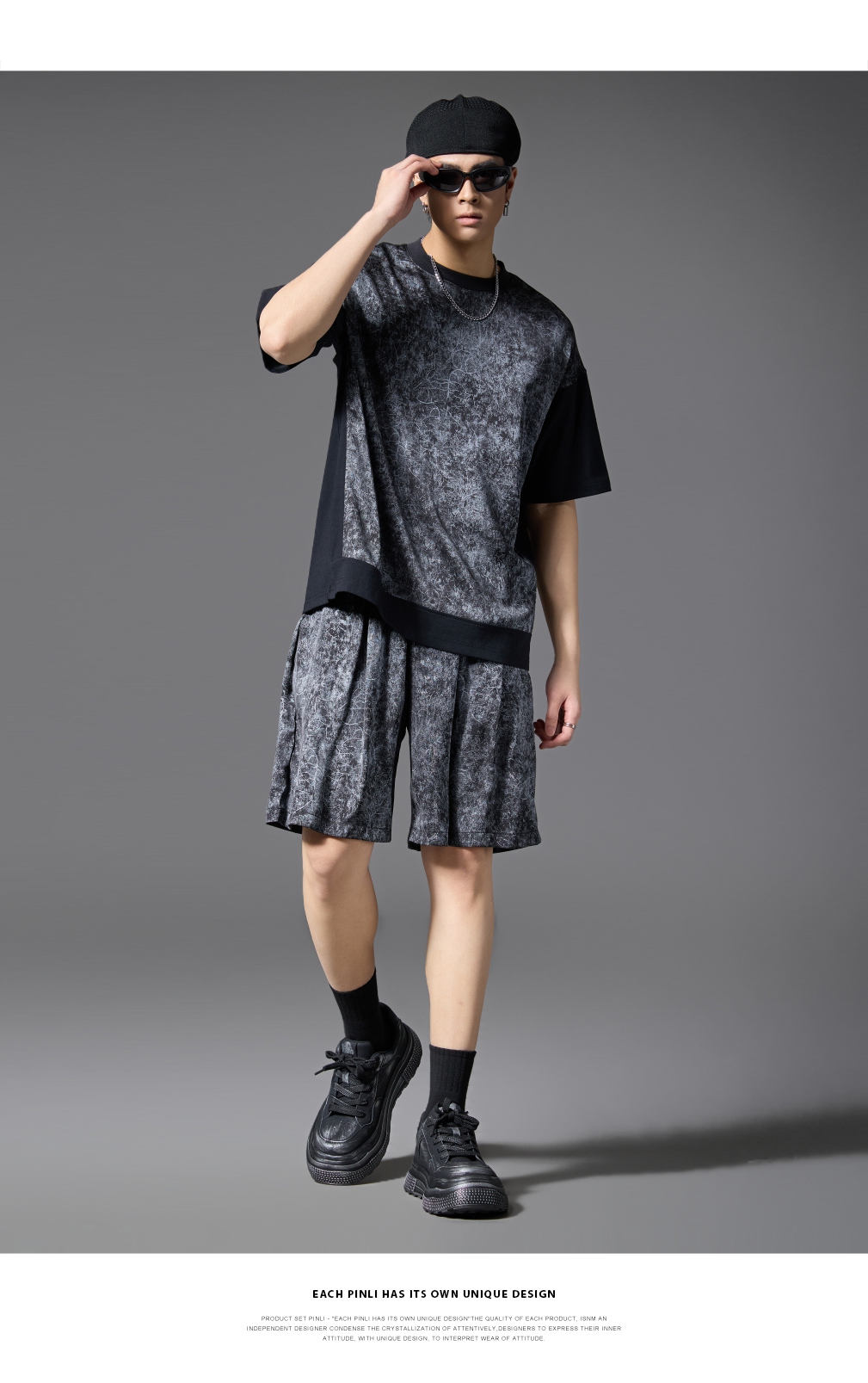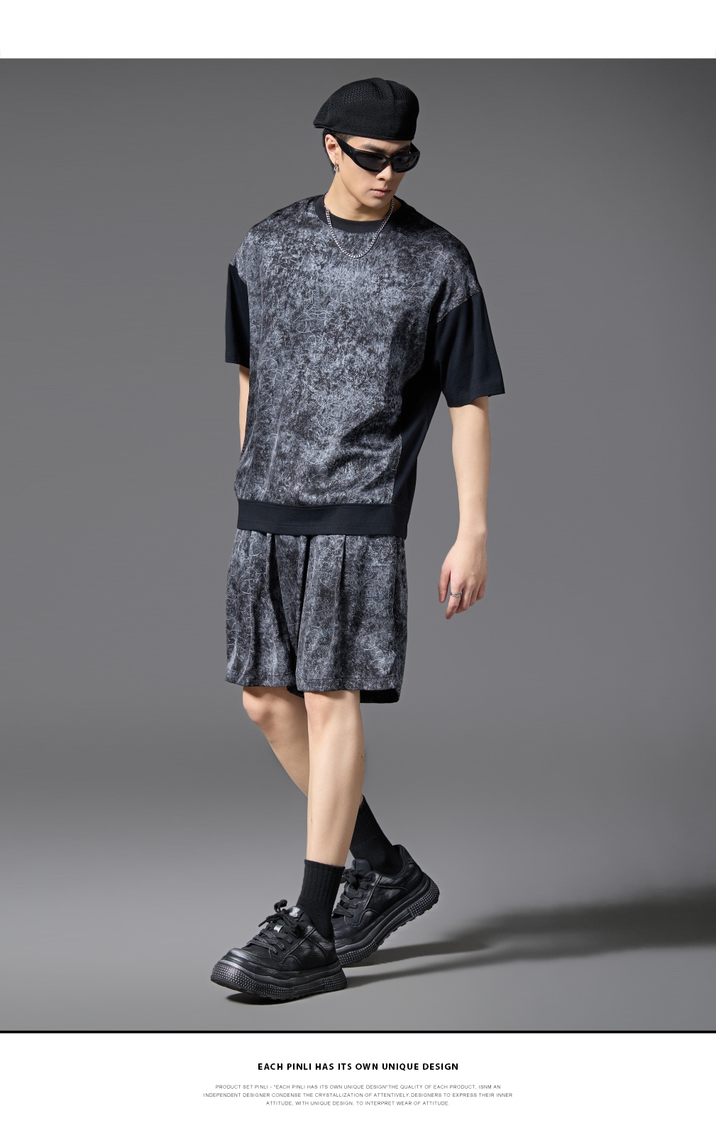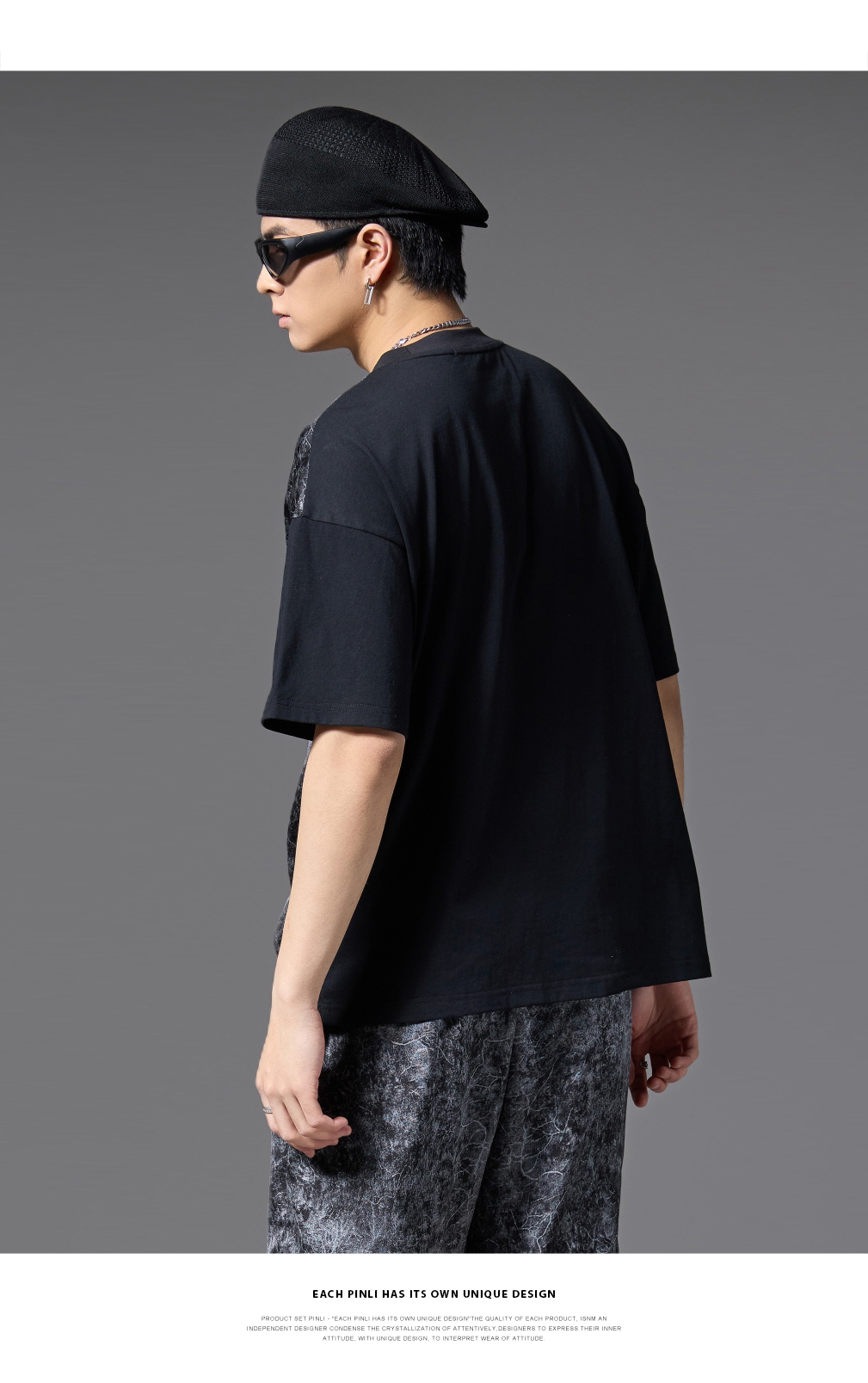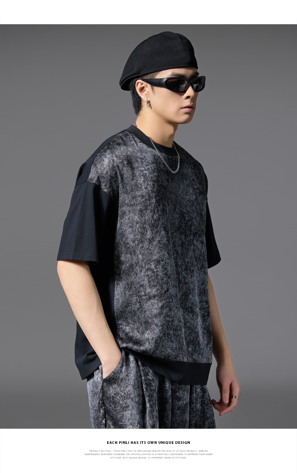 PINLI品立2025春夏新款晕染印花宽松T恤男士国潮休闲拼接短袖上衣B252111006