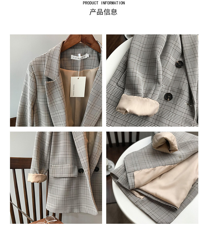 经典的西装领,保留了原本的气息,两侧的口袋增添了实用度,棕咖色系的小线条堆砌而成的格纹,里衬也挑了经典的香槟色。