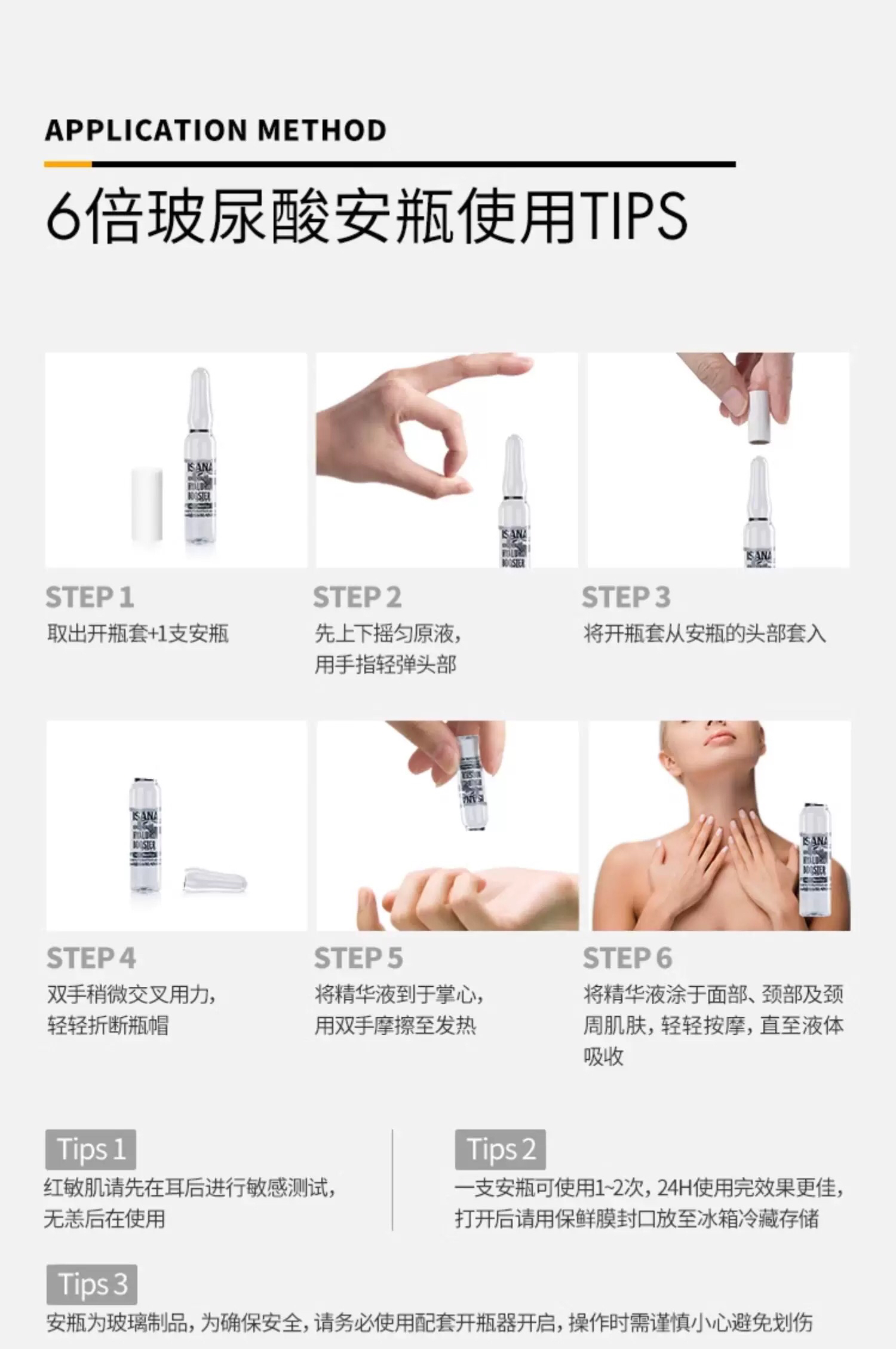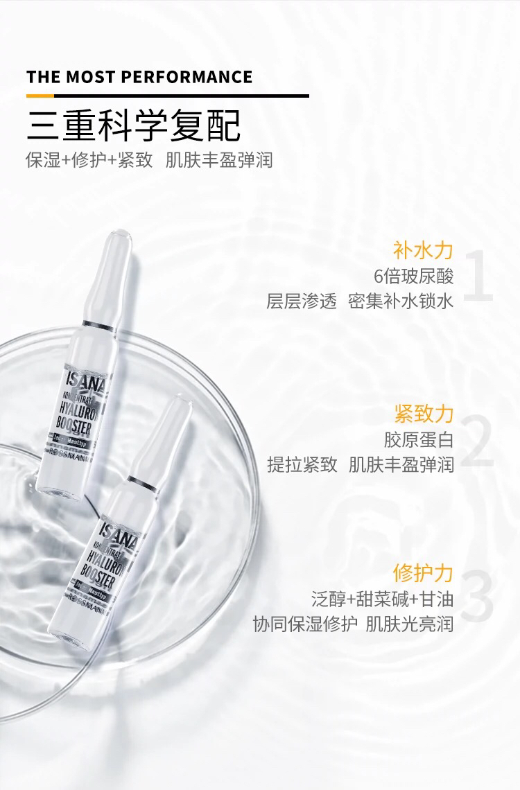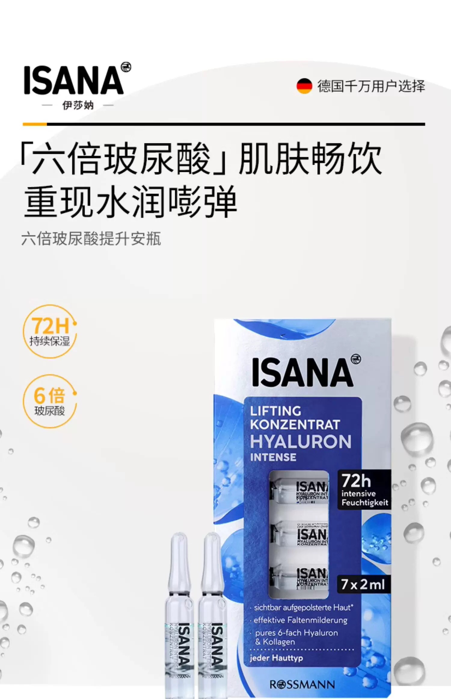 「至3/31,加赠1个佛手柑与岩兰草马卡龙香氛蜡烛」新版6倍玻尿酸 · 德国ISANA玻尿酸安瓶 涂抹式补水保湿精华 2ml * 6盒