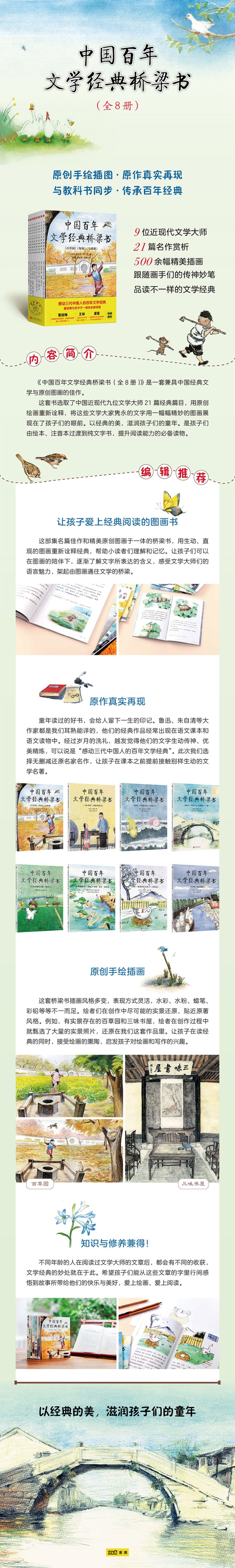 《中国百年文学经典桥梁书(全8册)》是一部兼具经典文学与中国原创图画的杰作。本套书选取了中国近现代九位文学大师的作品共21篇,包括中国的文学家、思想家、革命家鲁迅先生的作品《从百草园到三味书屋》《故乡》《社戏》《风筝》;近代文学家、散文家、学者朱自清先生的《春》《匆匆》《荷塘月色》《背影》;近代教育家叶圣陶先生的《稻草人》《古代英雄的石像》等众位大师的传世名篇。