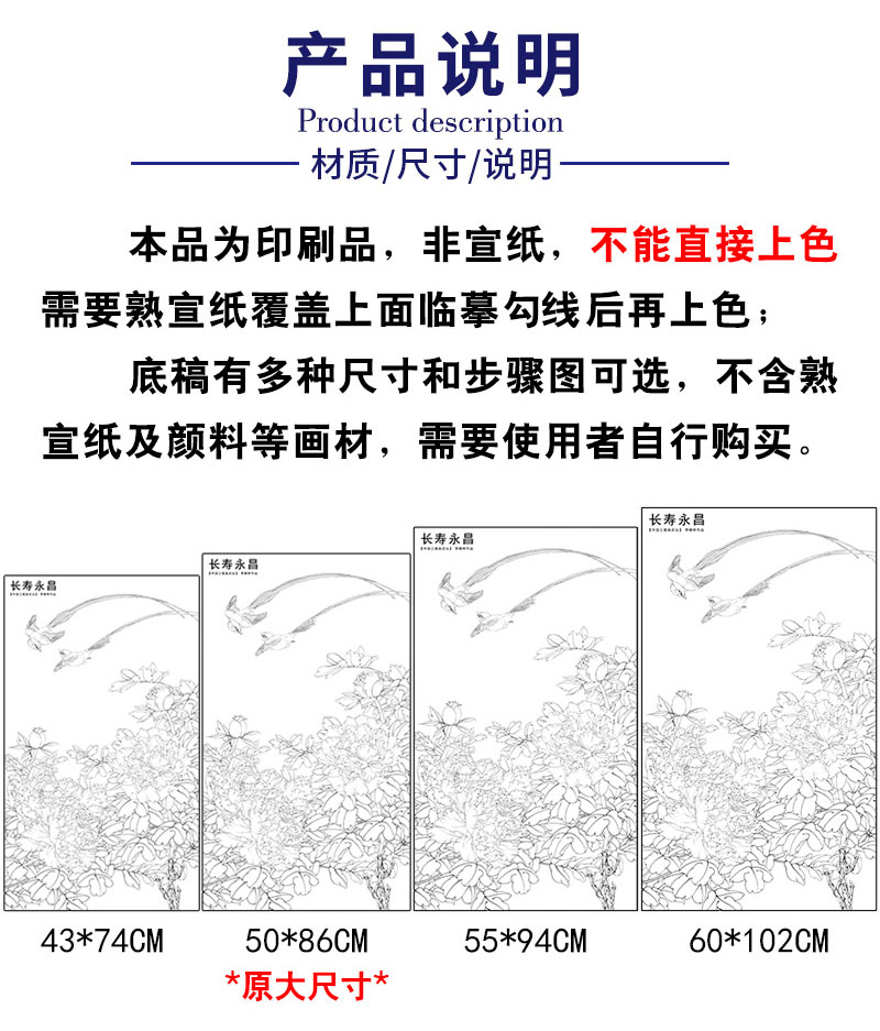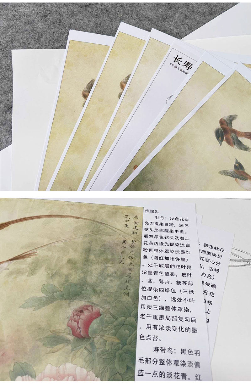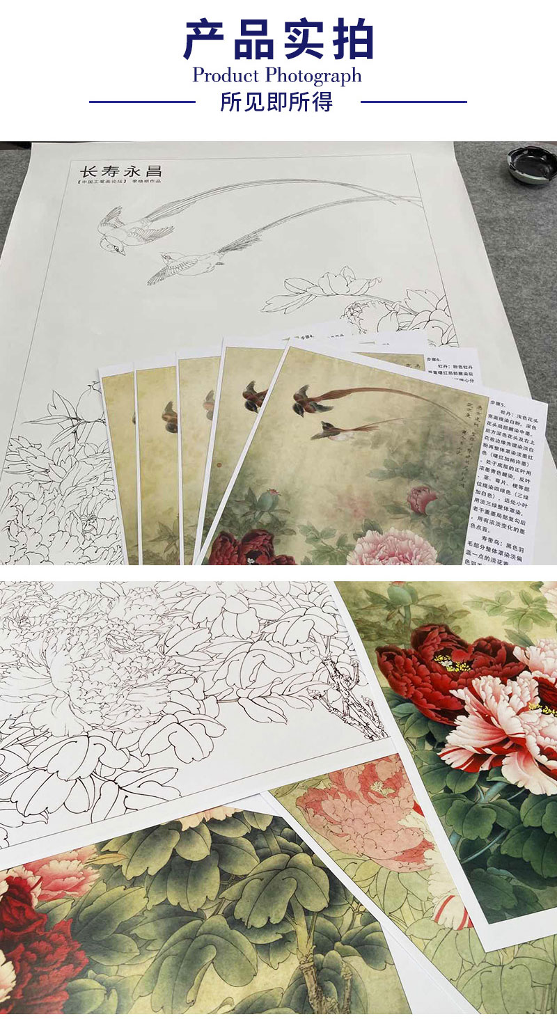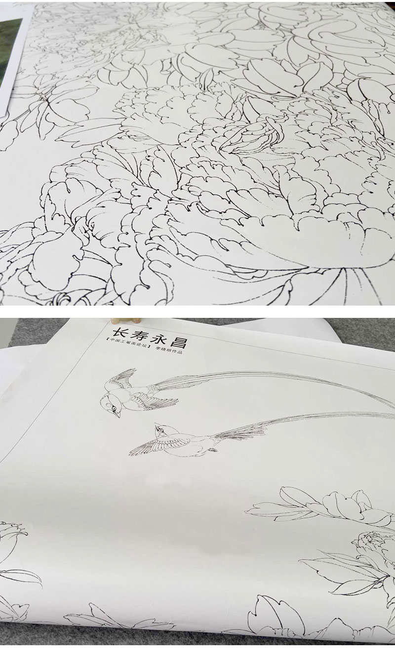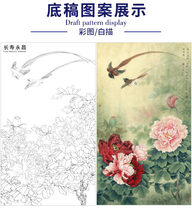 【有步骤、大彩图】李晓明工笔画白描底稿《长寿永昌》牡丹寿带鸟初学者临摹花鸟线稿KD24