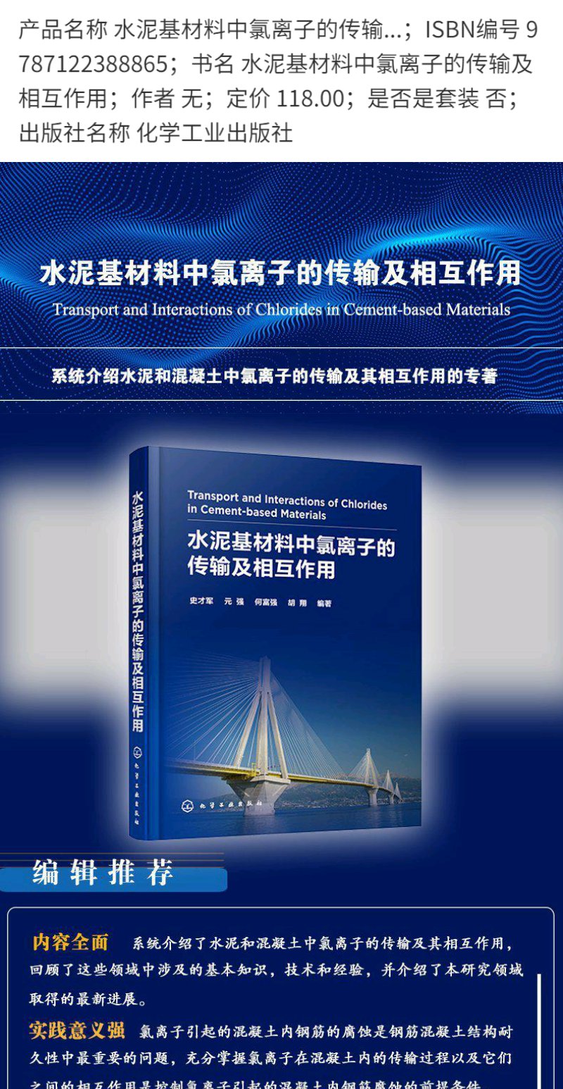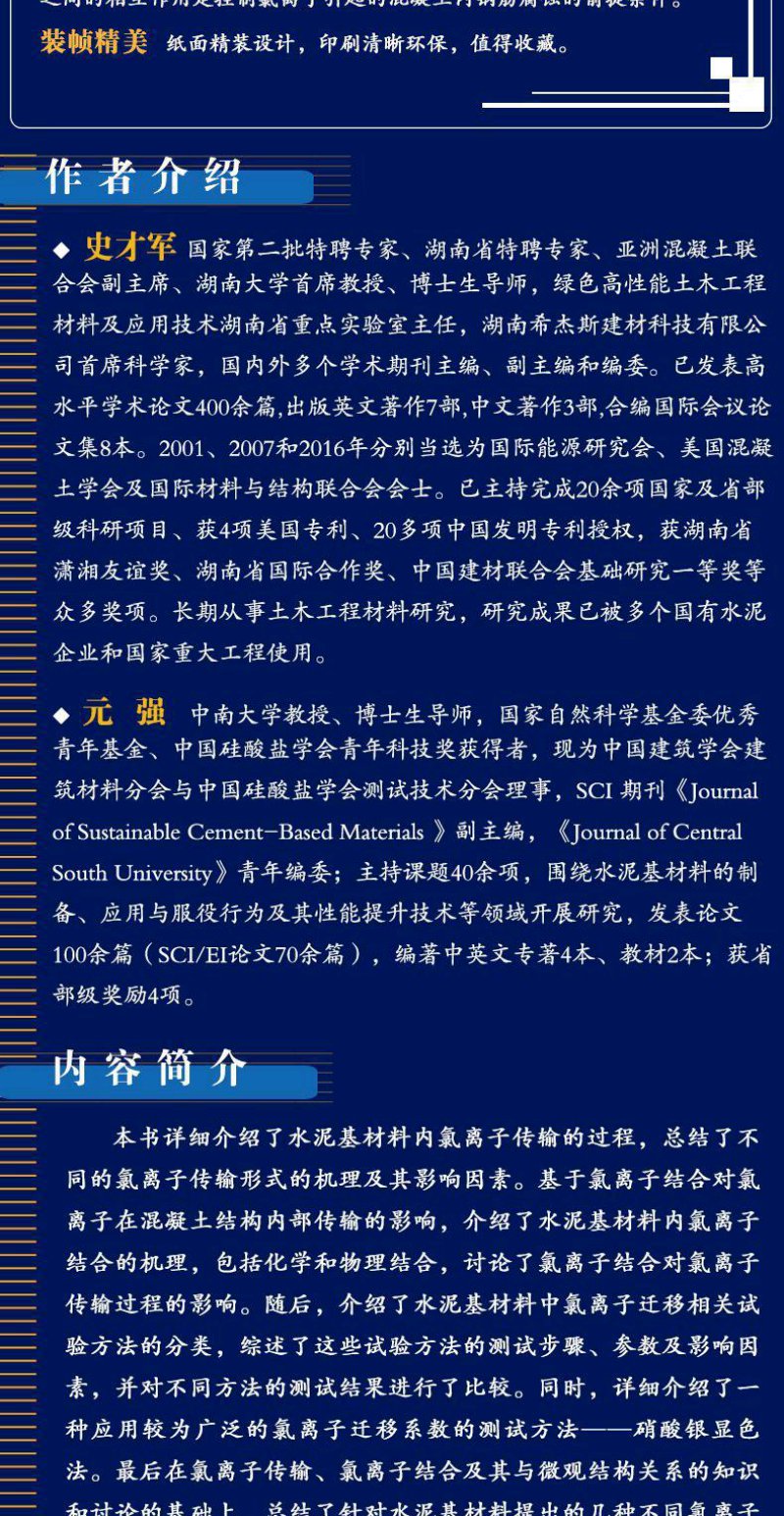 正版 水泥基材料中氯离子的传输及相互作用 水泥混凝土材料 钢筋