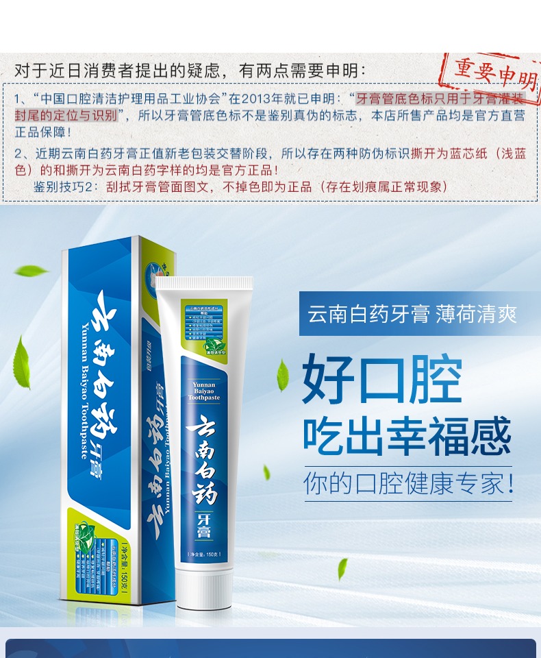 云南白药牙膏 冬青香型单支装 洁齿165g