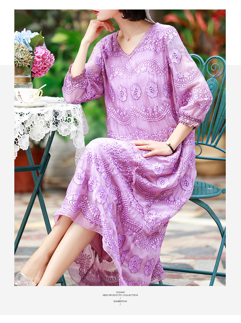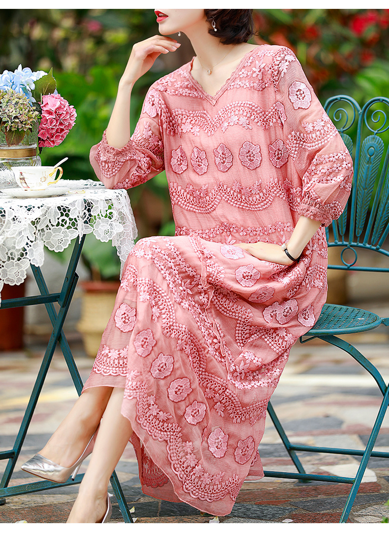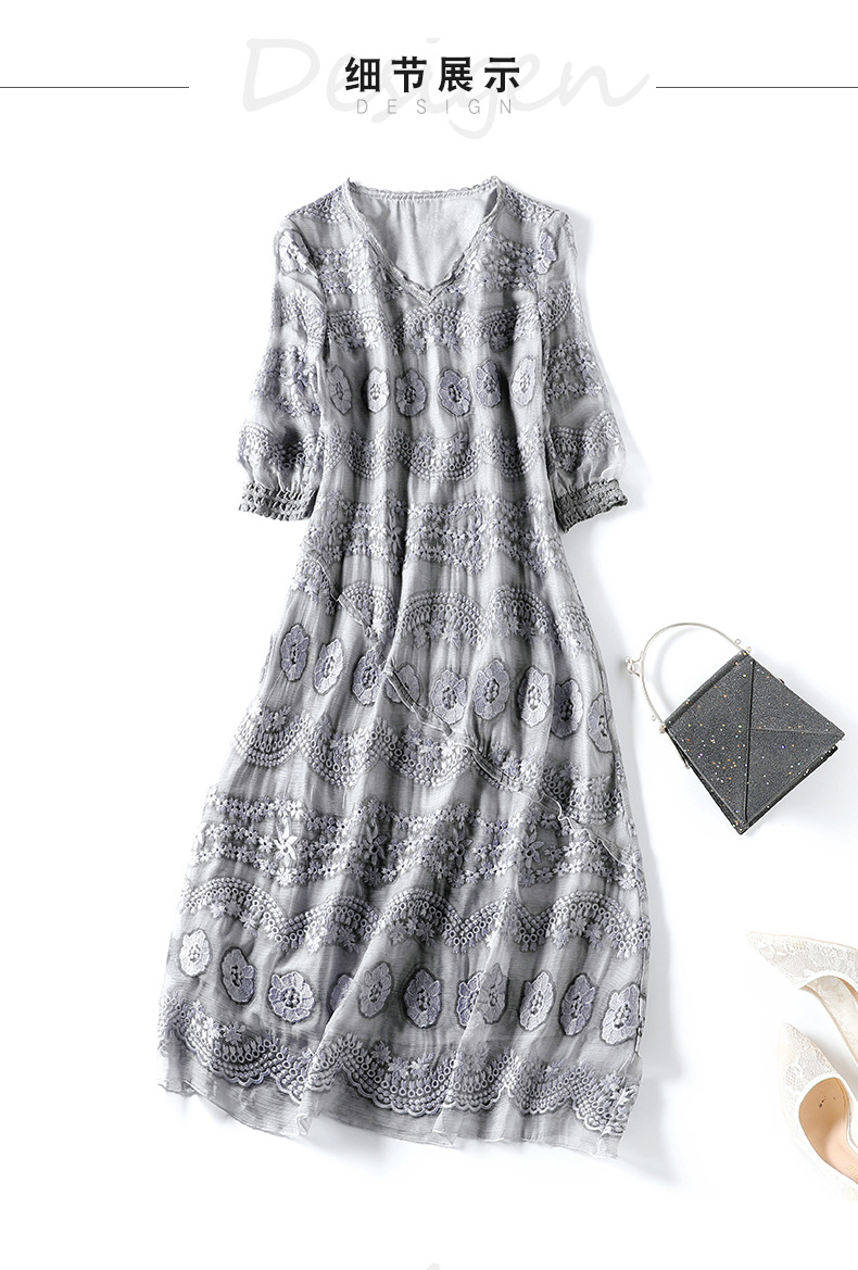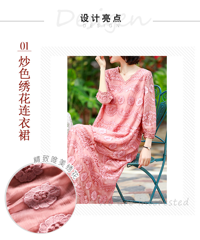 NYT-20011新款七分袖绣花纯色打底裙气质V领重工刺绣连衣裙