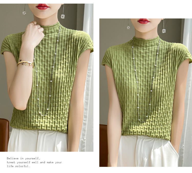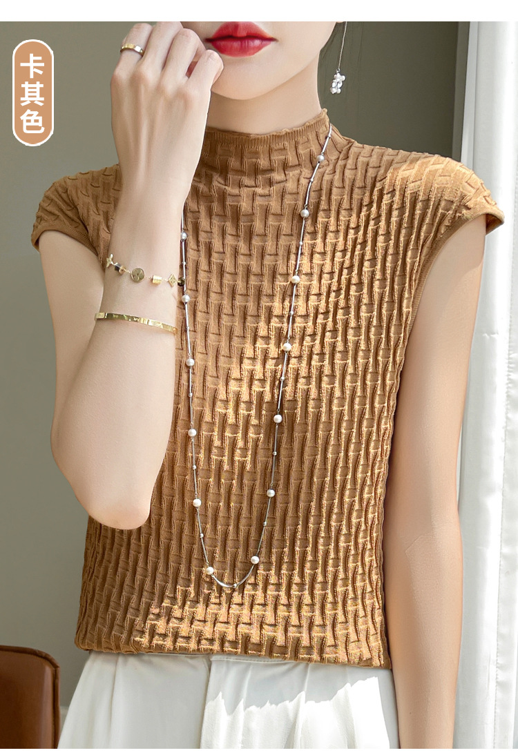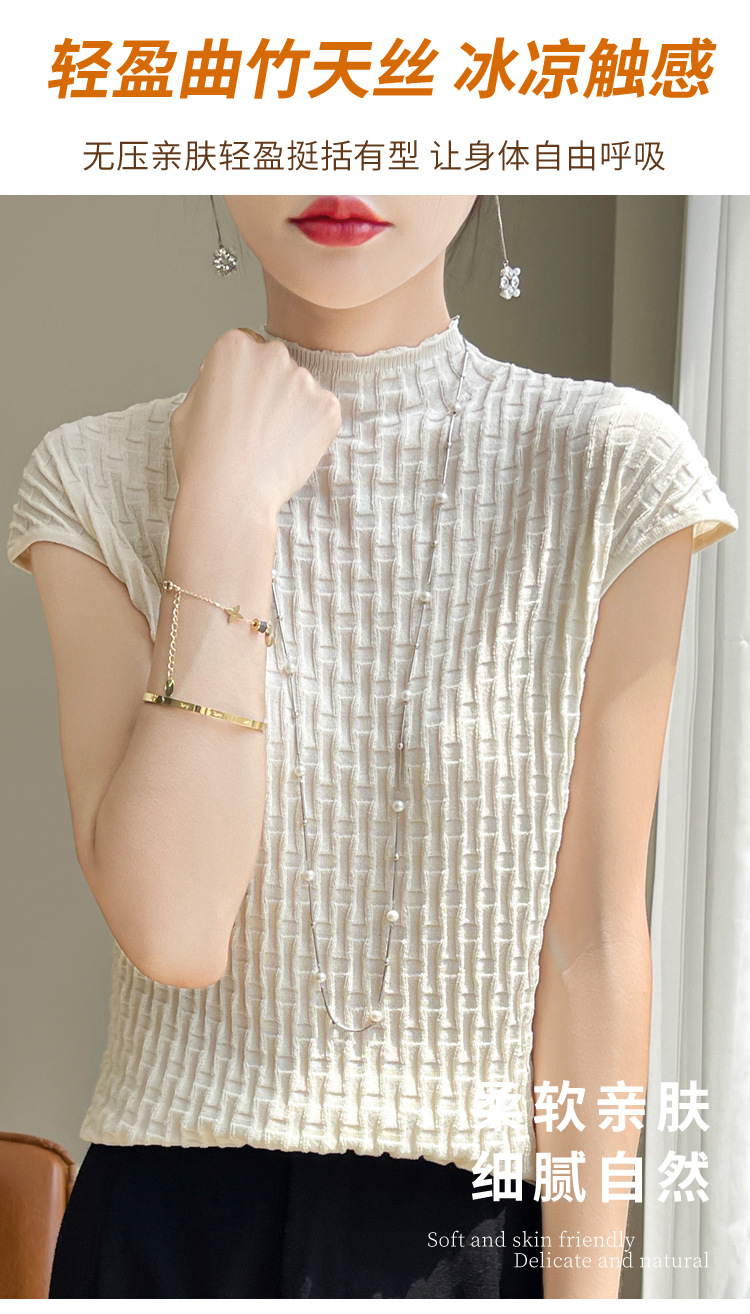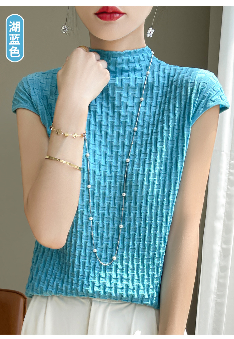 QHJY-JY1188夏季冰丝无袖针织背心半高领纯色修身显瘦上衣立体压褶短袖体恤女