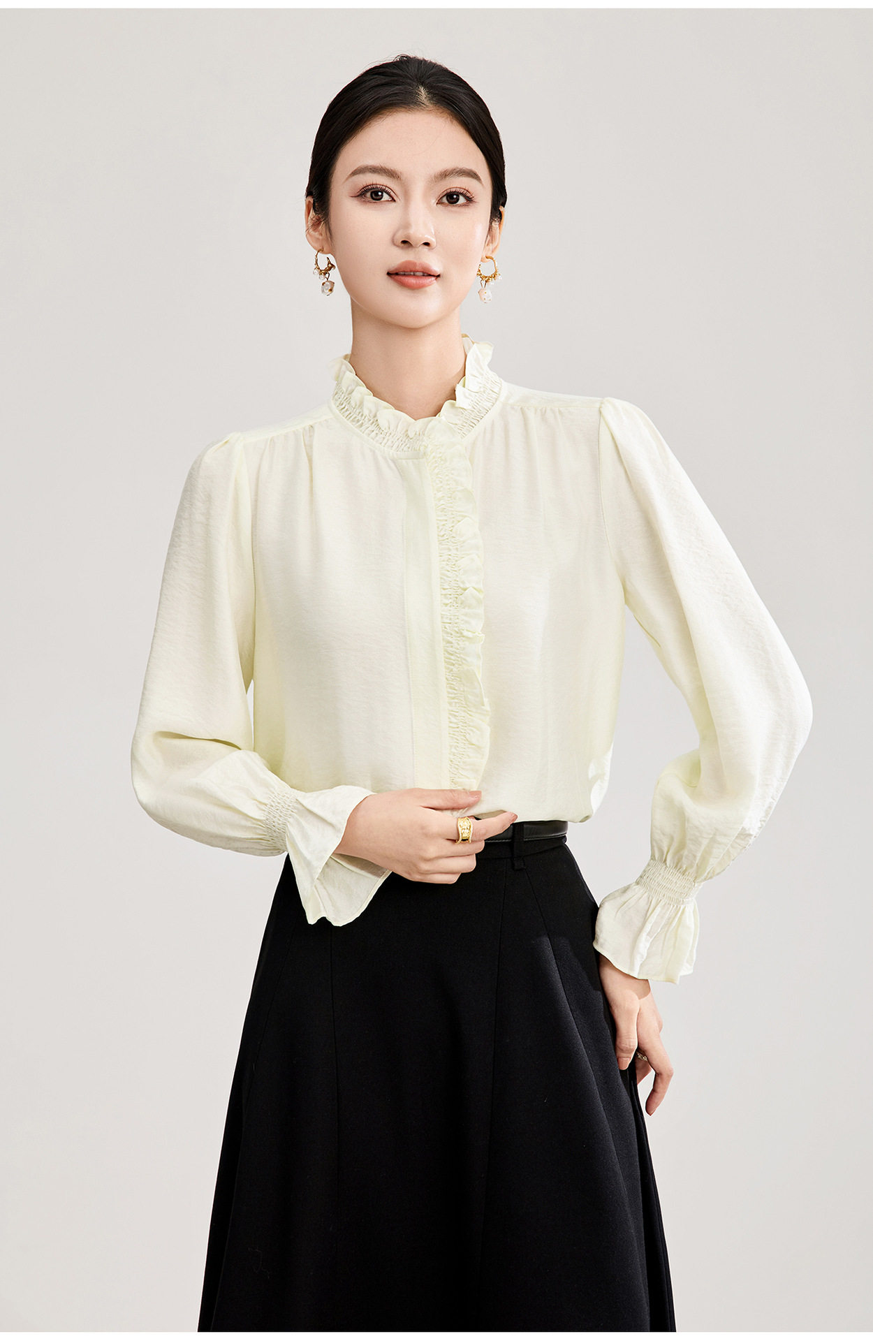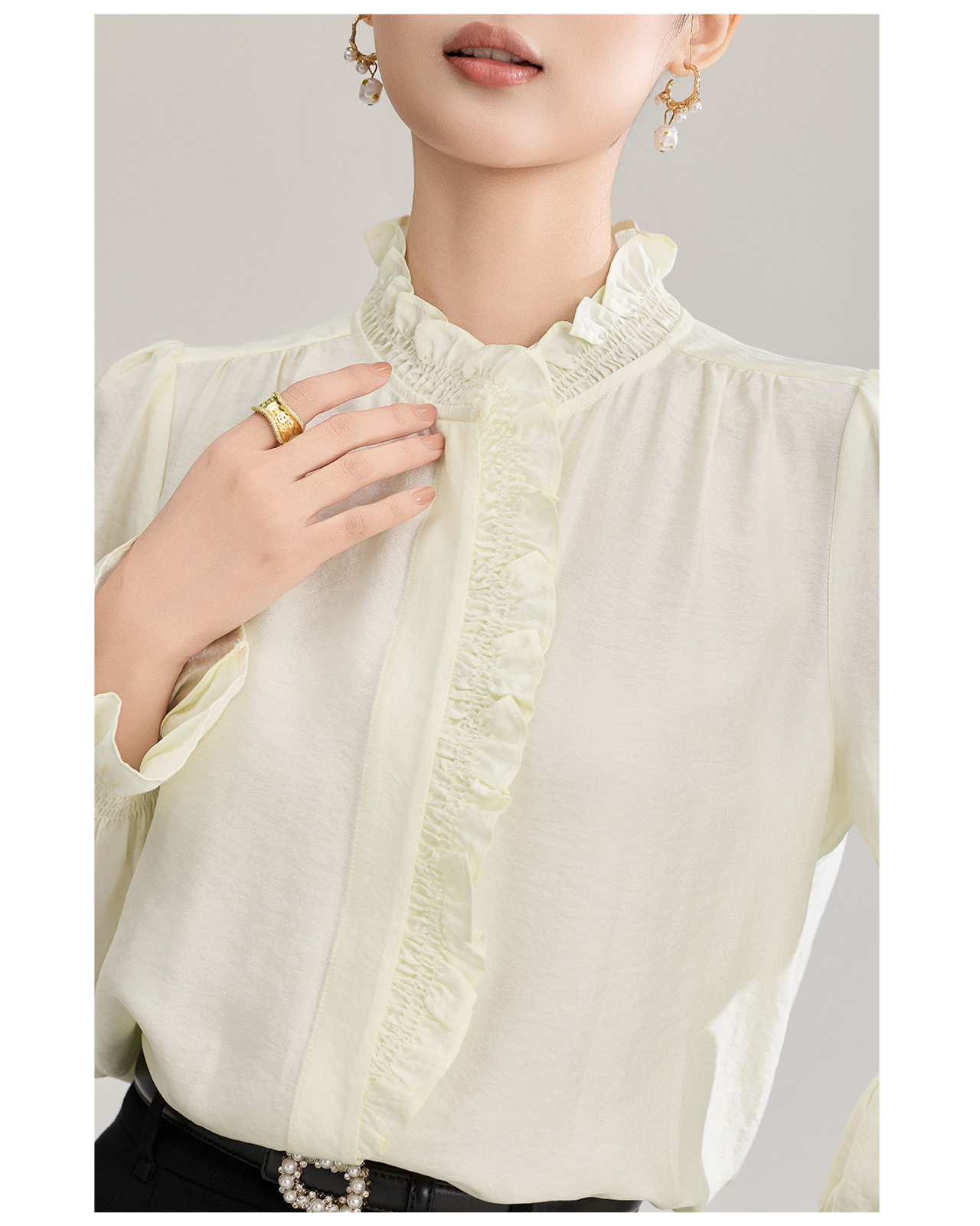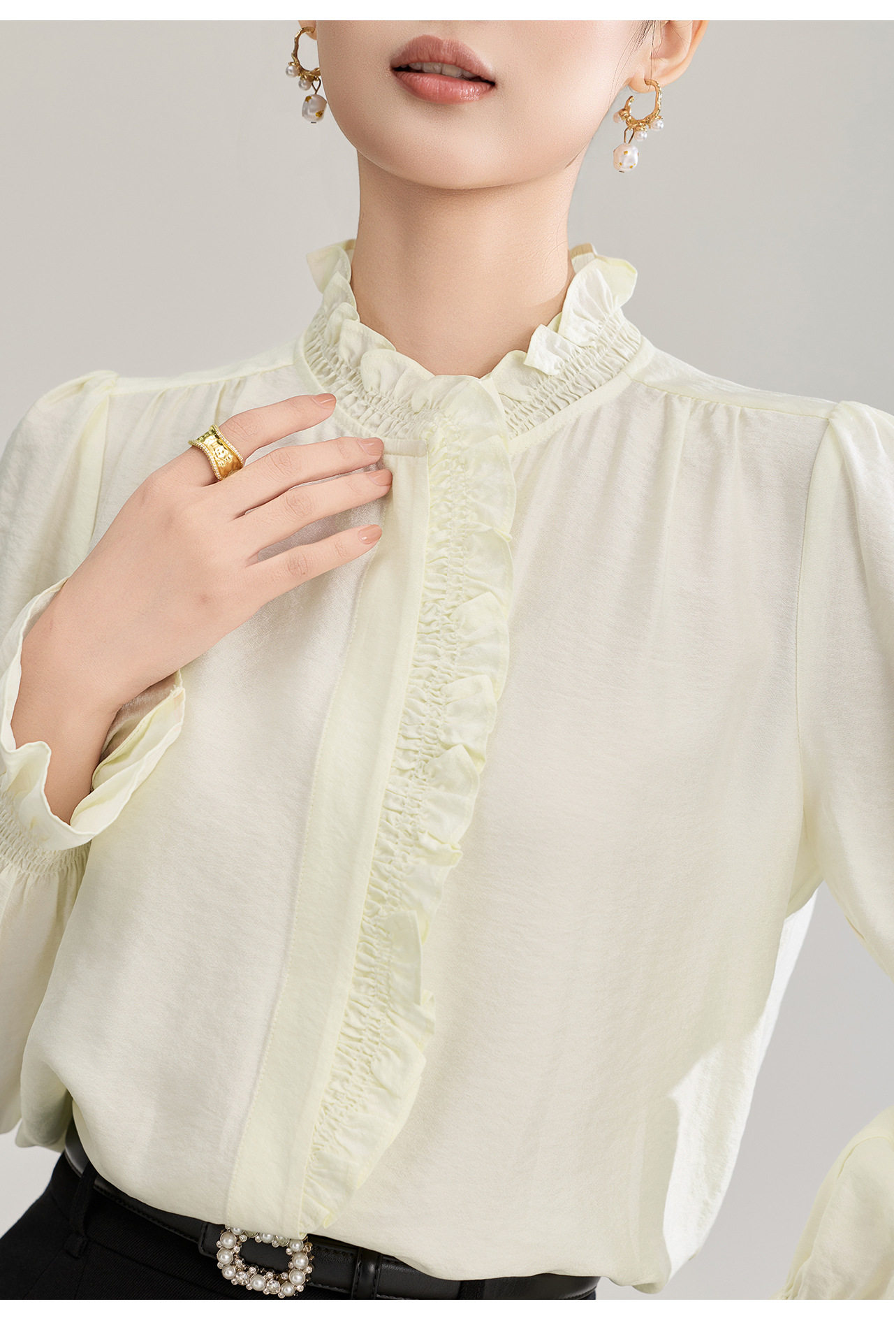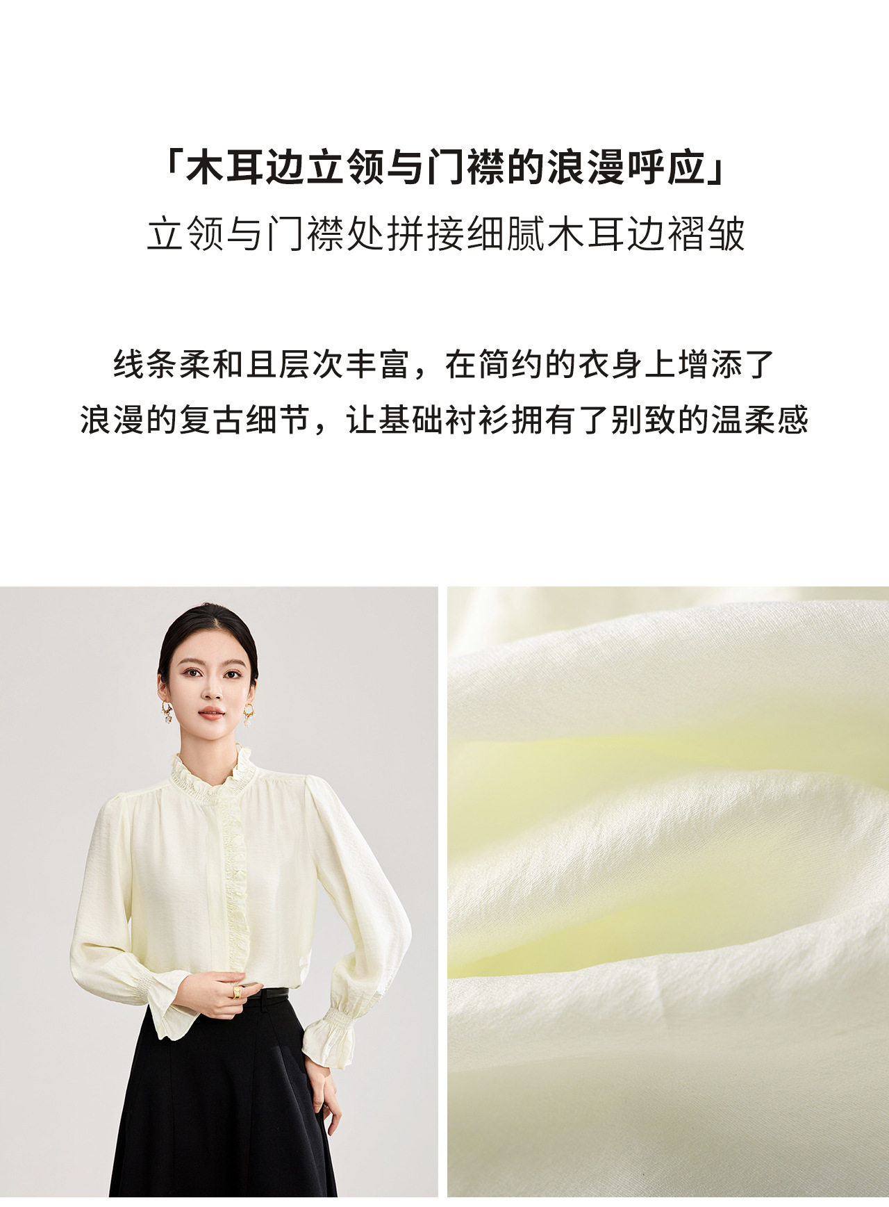 「高货wl」全新升级【铂金会员247/天猫329/差价82】(01839)洛诗琳宫廷风木耳边立领上衣2026春季新款洋气雅致肌理绉感天丝衬衫女