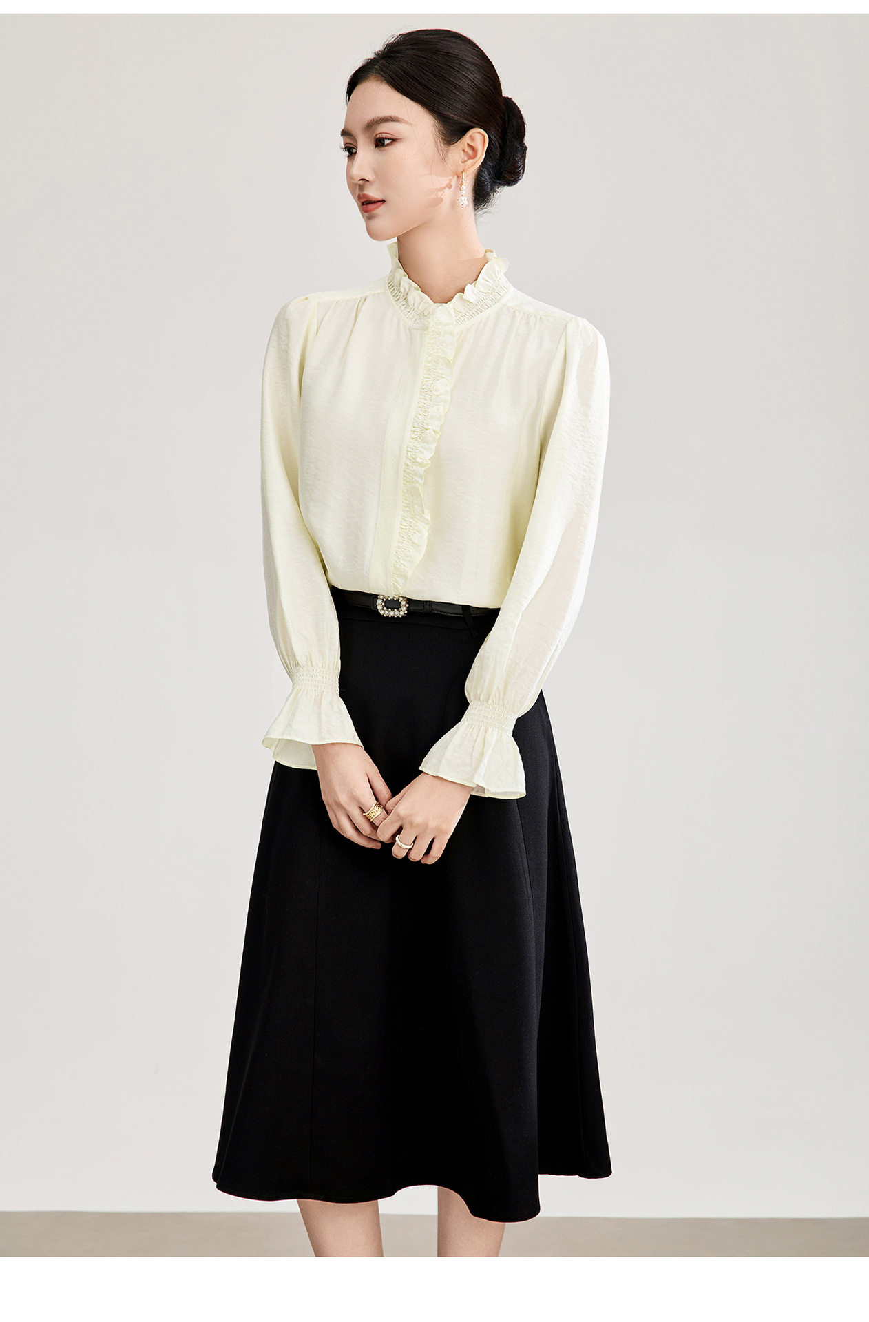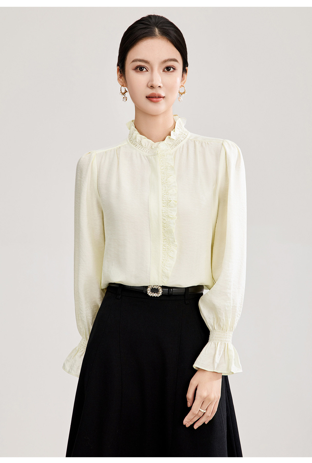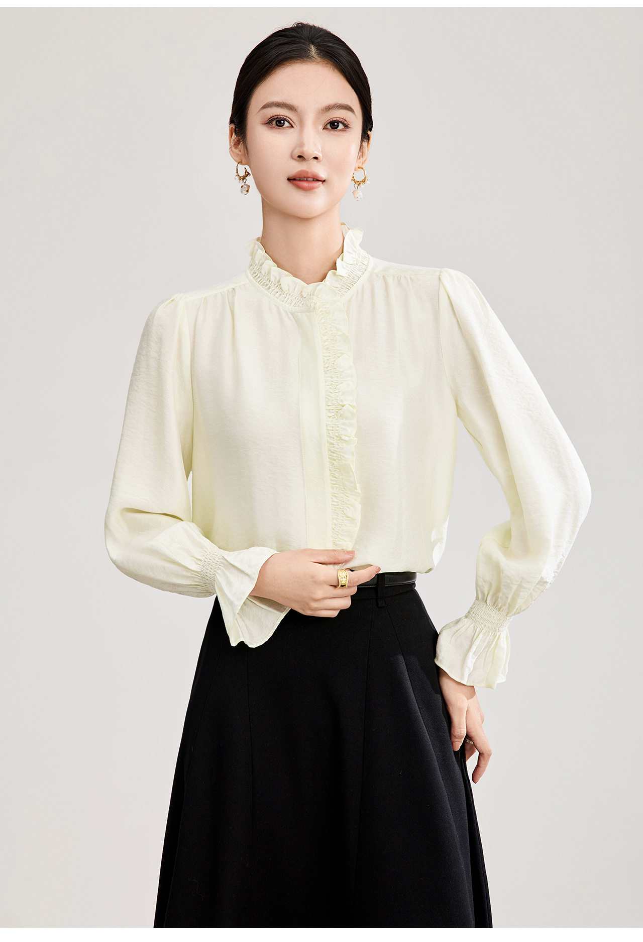 「高货wl」全新升级【铂金会员247/天猫329/差价82】(01839)洛诗琳宫廷风木耳边立领上衣2026春季新款洋气雅致肌理绉感天丝衬衫女