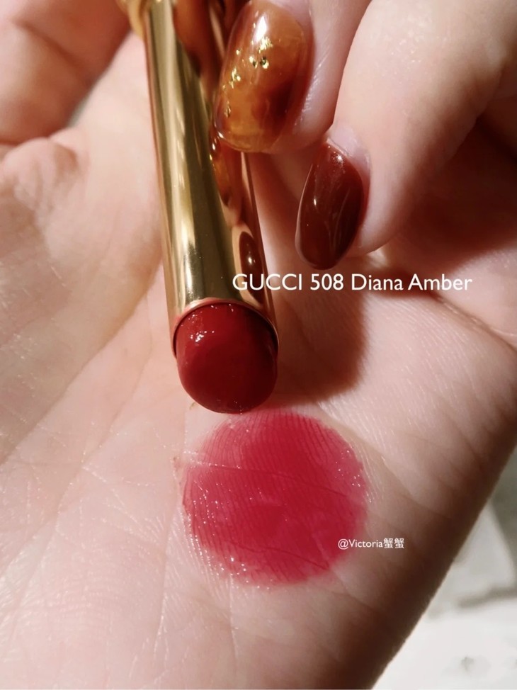 👑Gucci 细管口红#508👍戴安娜琥珀。🍒草莓酱和树莓酱被不小心打翻了,两者混合在一起的颜色,水红和紫红呈现出来,带了点紫调🍇,降低了红色的饱和度,透透的水嫩很纯欲💋,不会太扎眼,多了份高级感,不挑肤色超水润!外壳设计很有复古感💄,少女心炸裂了~