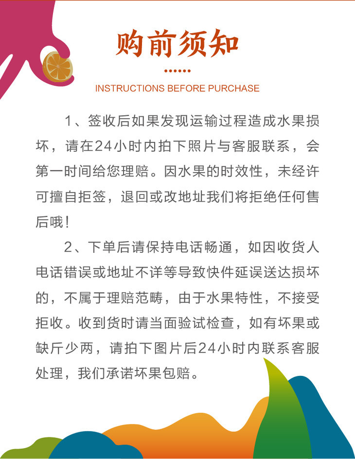 ②因生鲜产品具有特殊性和相关规定,下单时请一定认真确认收件信息,因客户原因导致转寄、延派、误派、口感问题等不在理赔范围,生鲜产品不支持拒收、退货,如遇包装受损等问题需签收反馈售后。