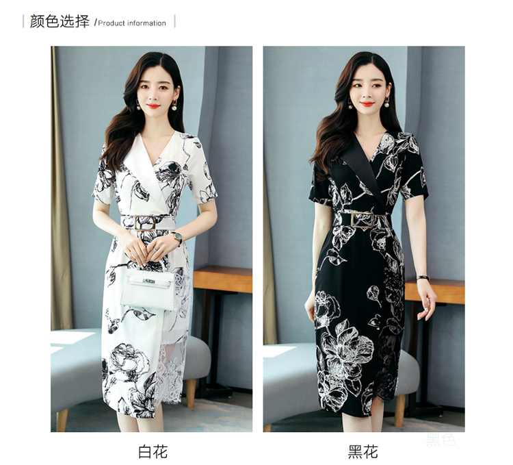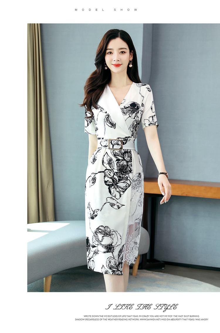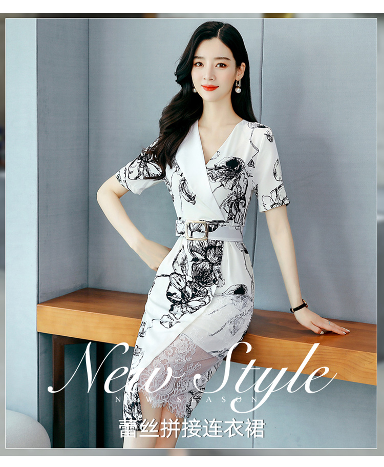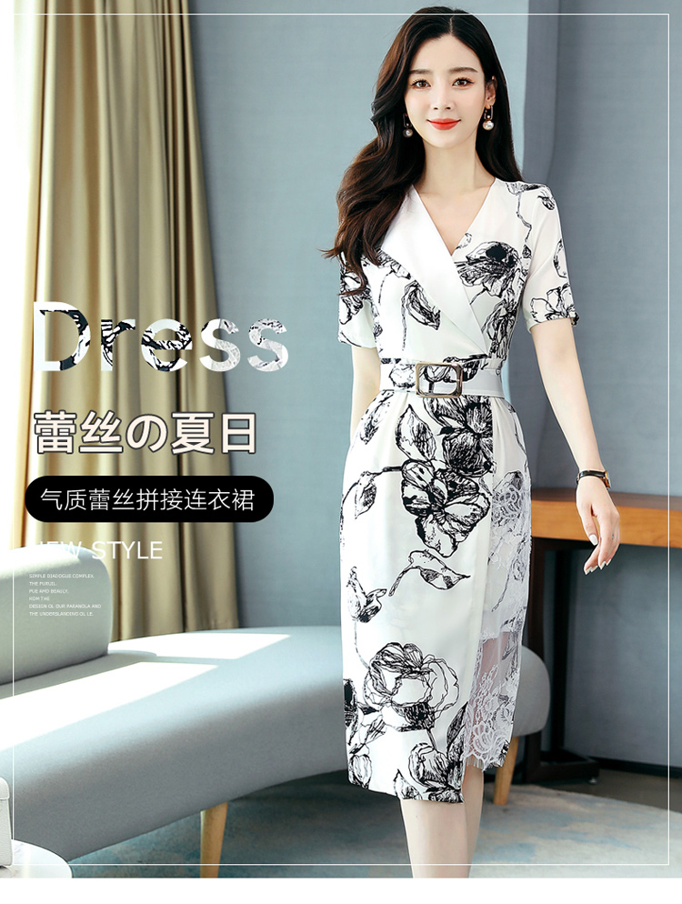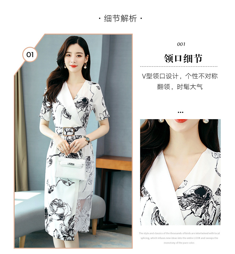 WZNH-8106夏季碎花V领松紧腰韩版不规则短袖中长款连衣裙