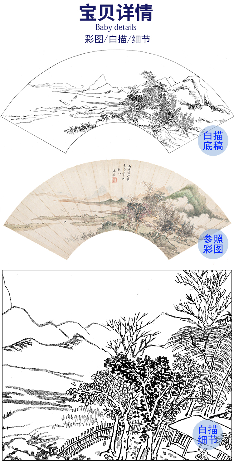 工笔画白描底稿 扇面小品 清 王鉴 山水图 SR41