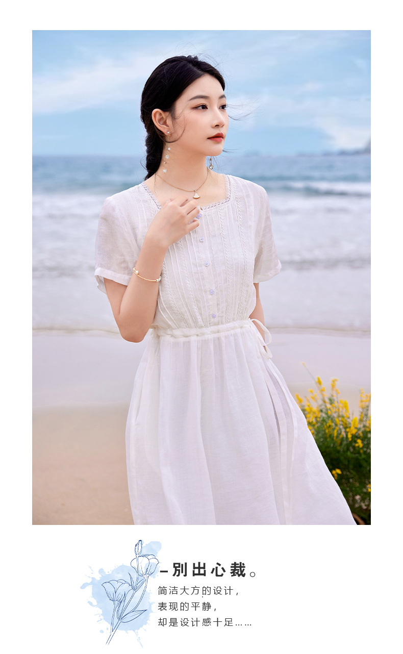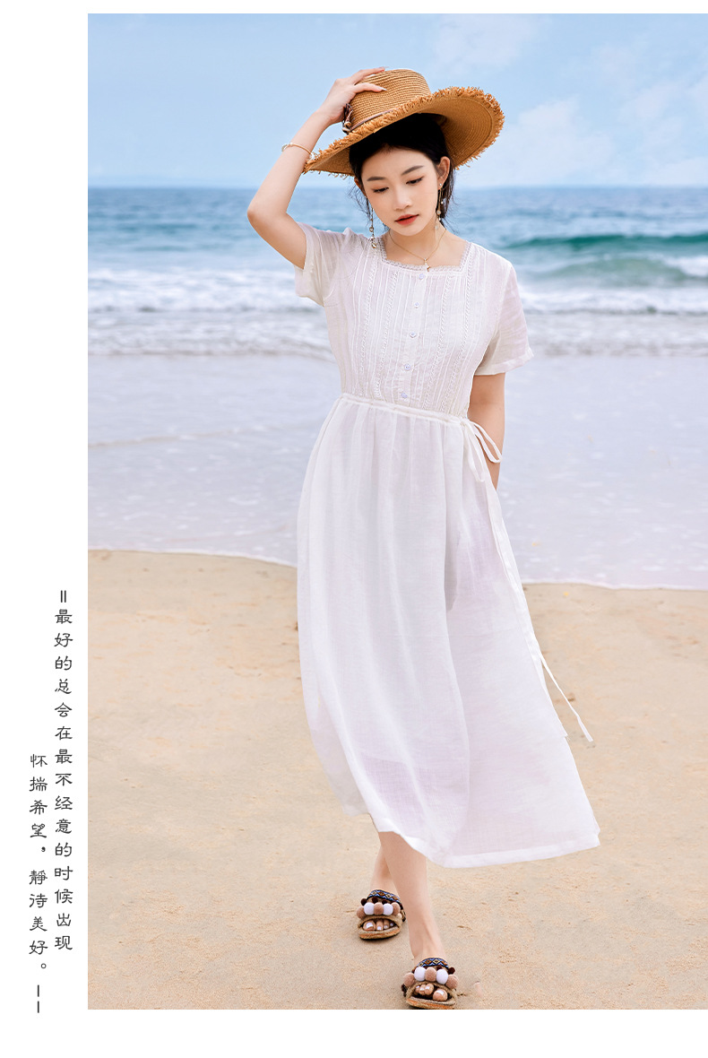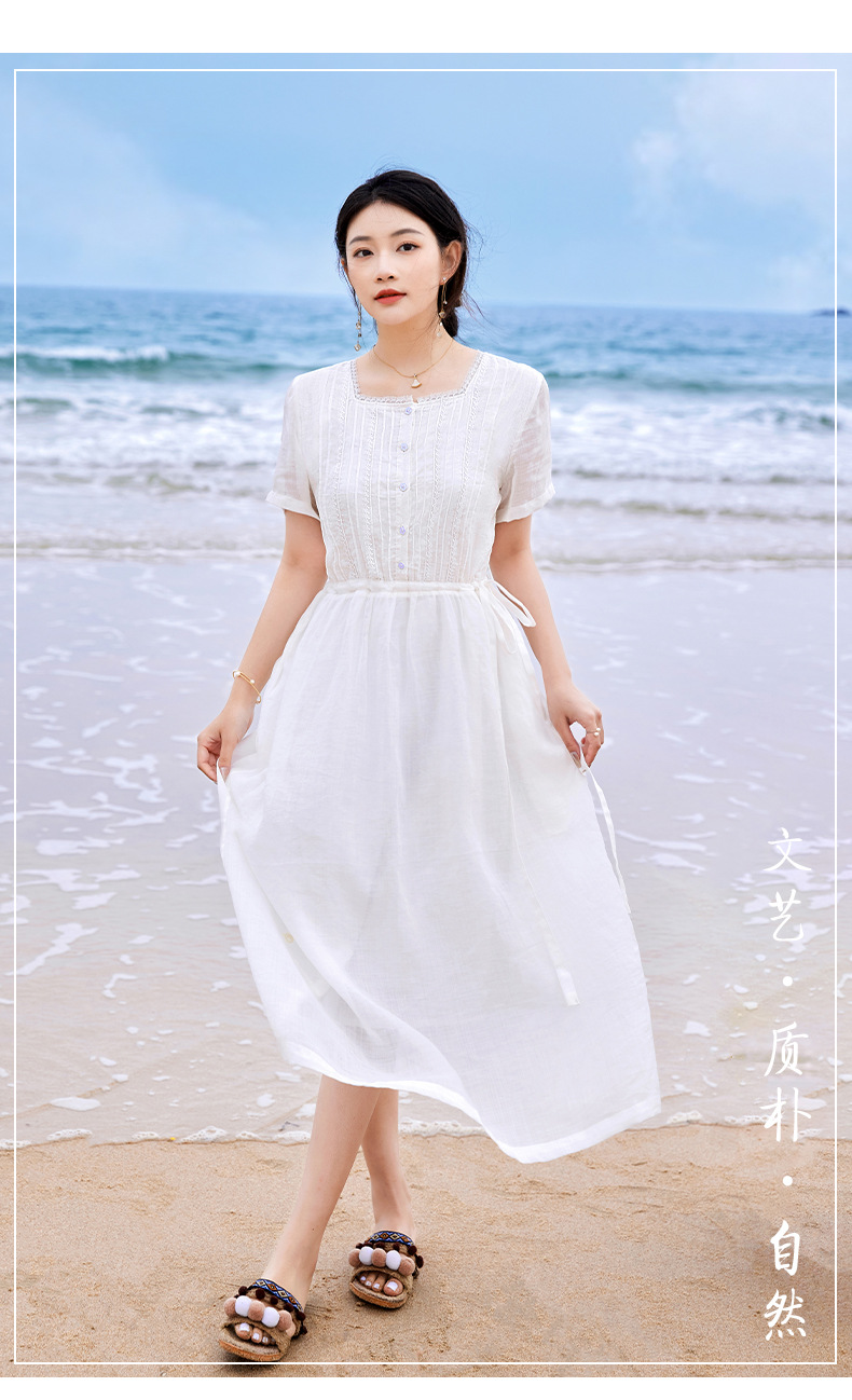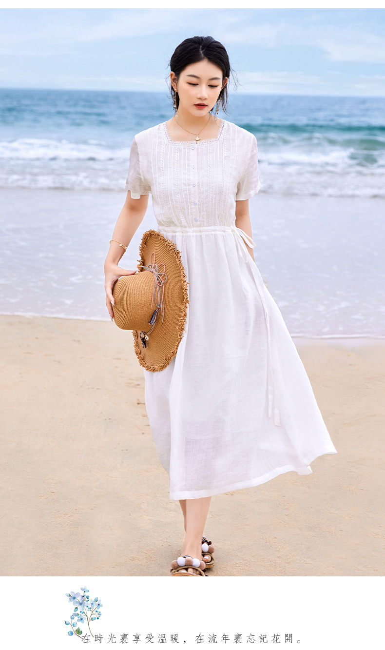 HM-S349夏季新款短袖苎麻法式飘逸花边文艺旅行方领系带白色度假风连衣裙