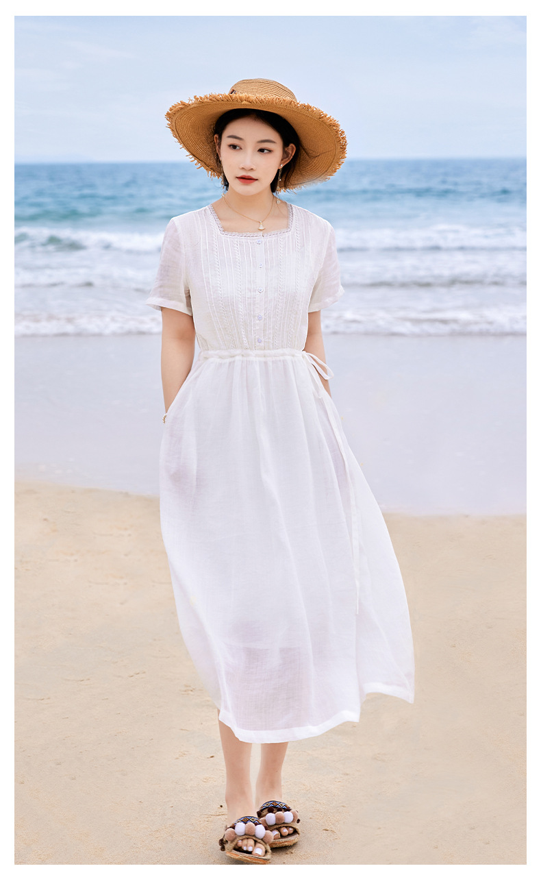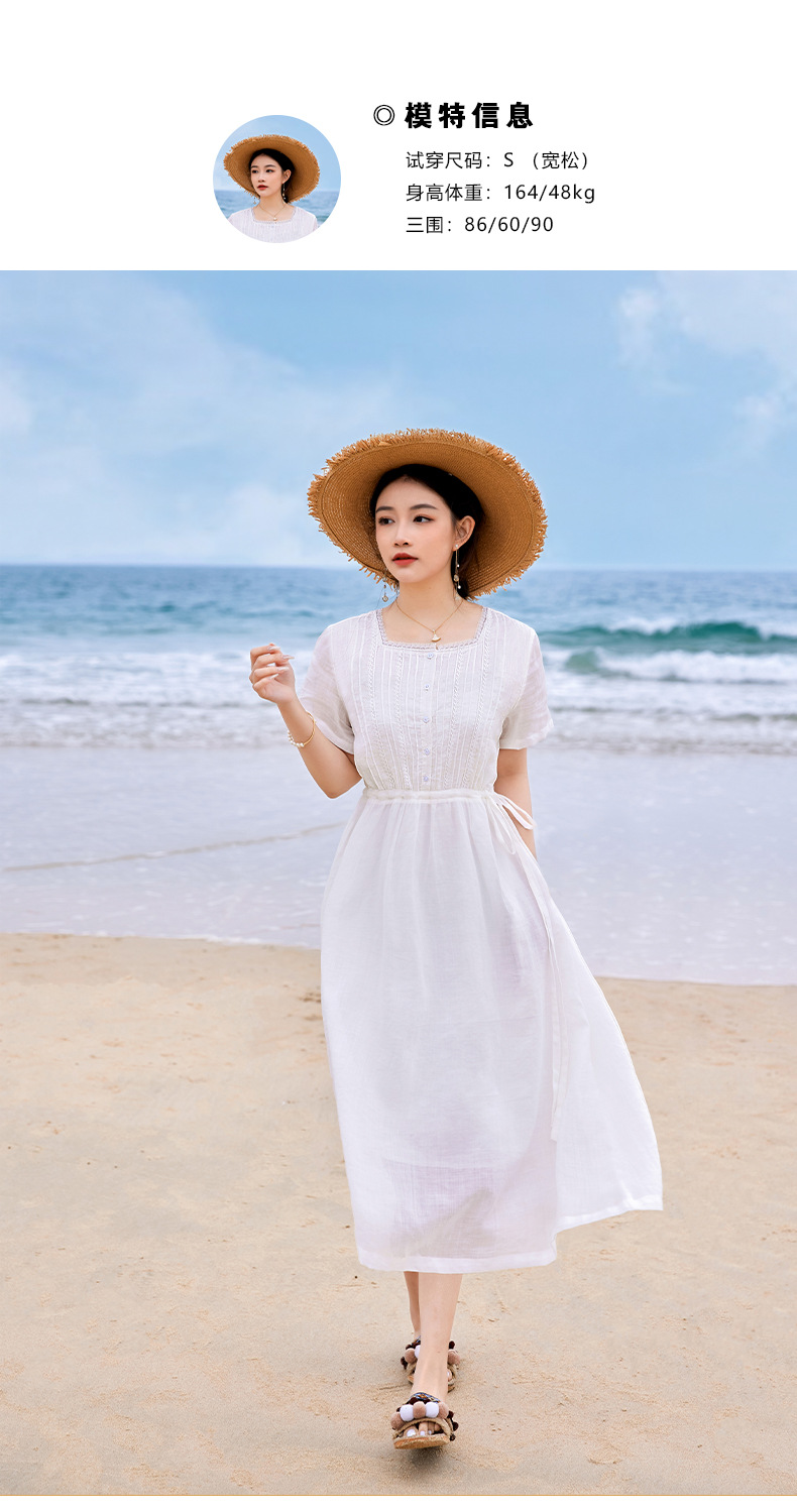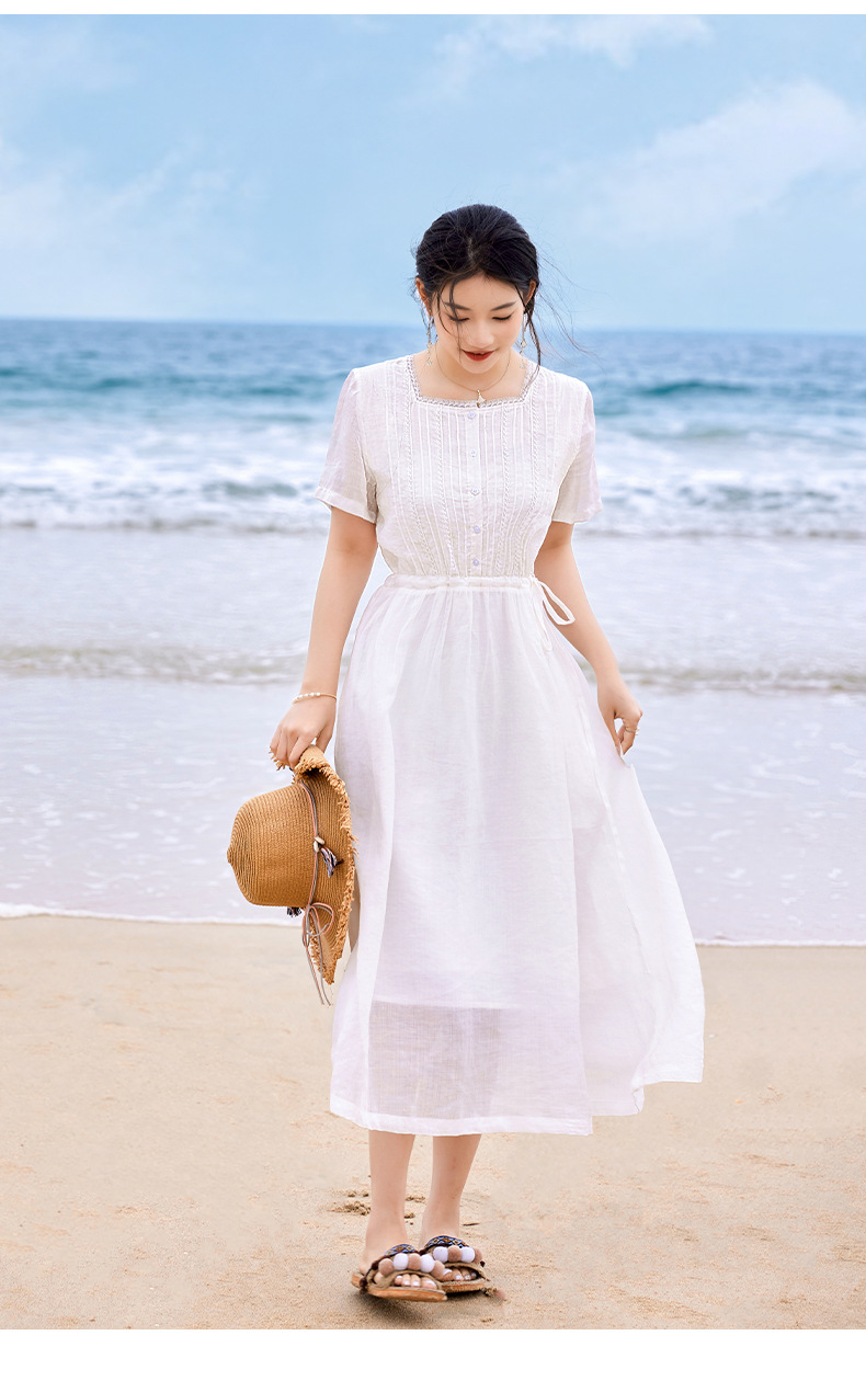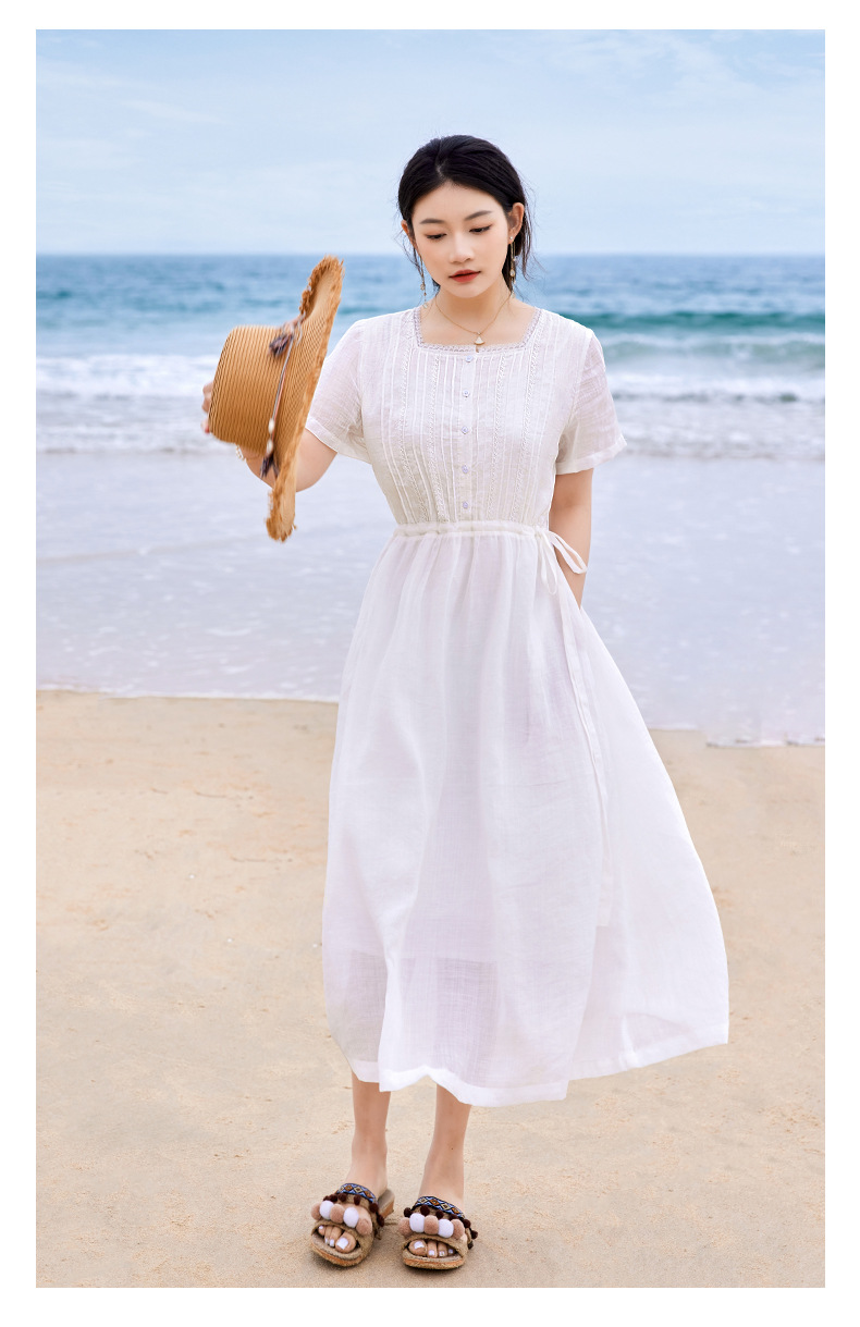 HM-S349夏季新款短袖苎麻法式飘逸花边文艺旅行方领系带白色度假风连衣裙