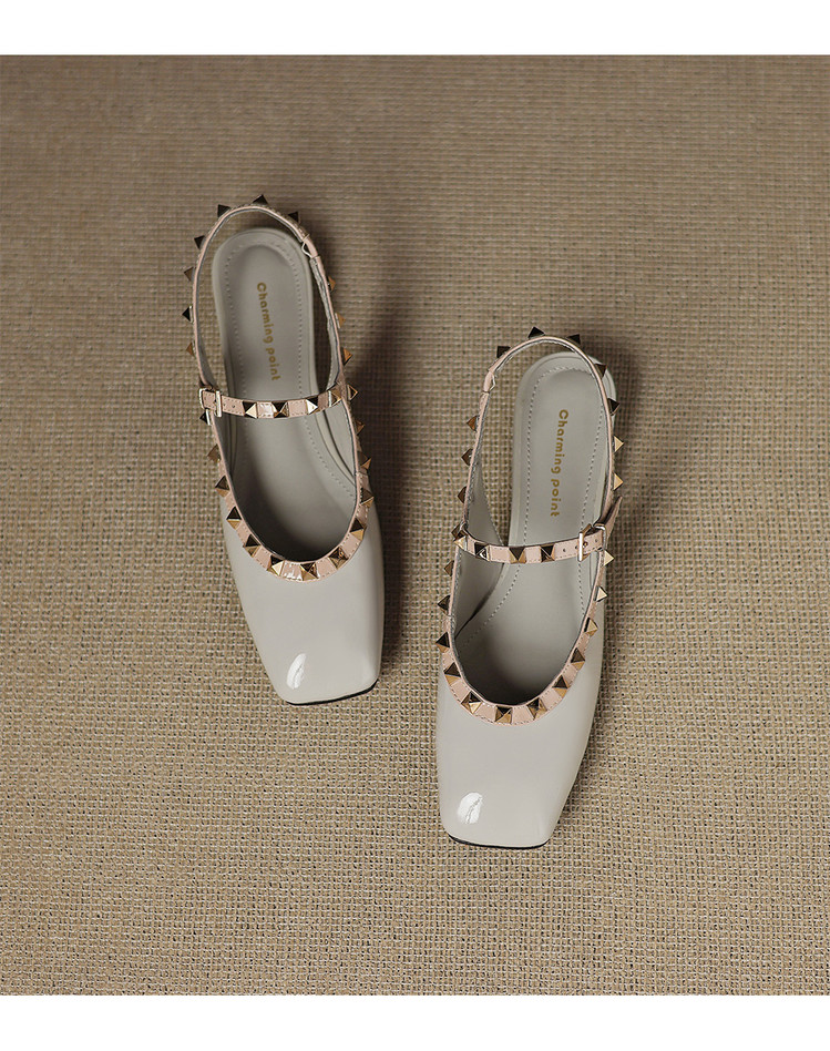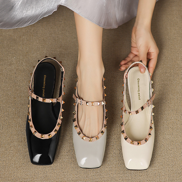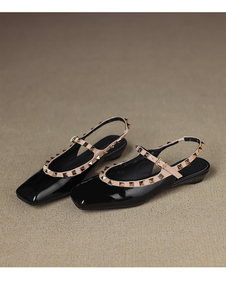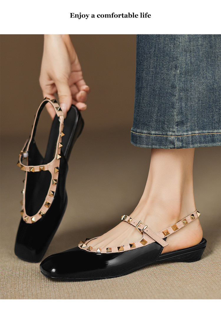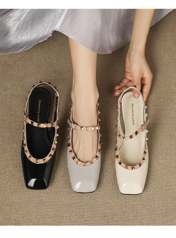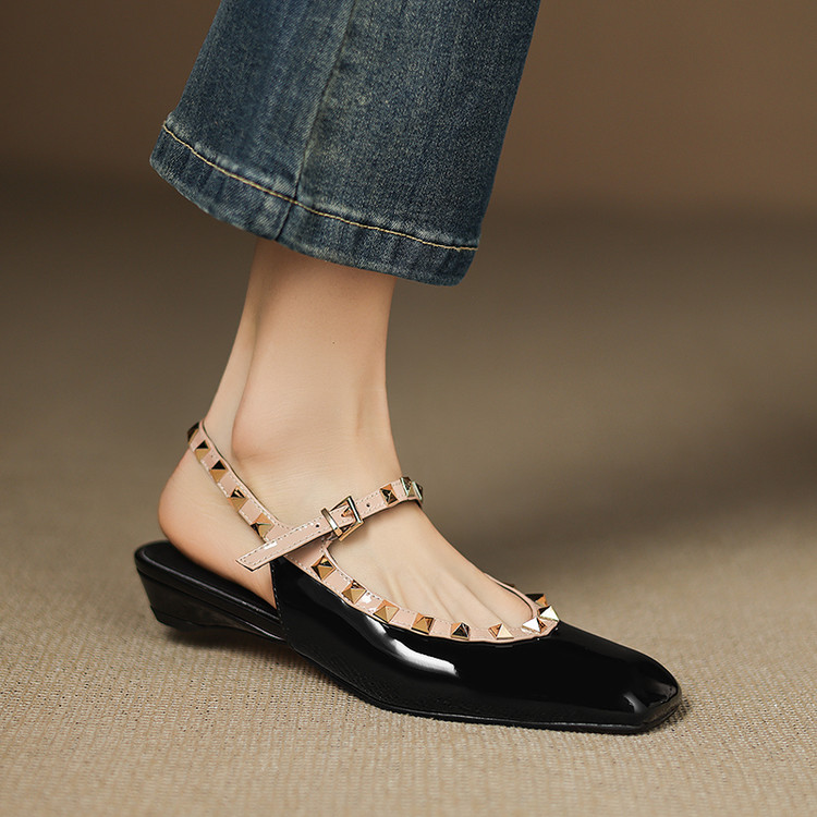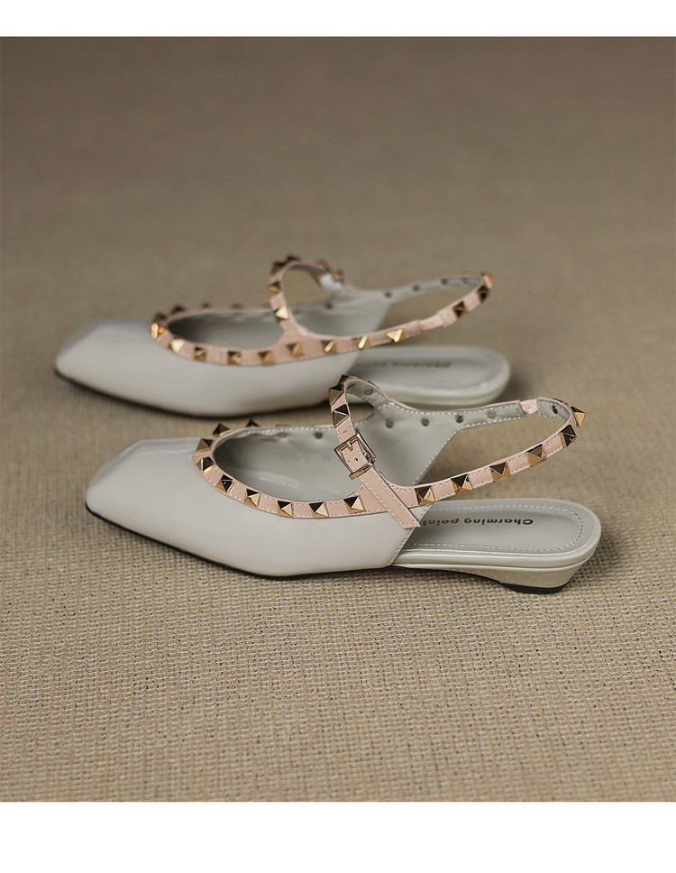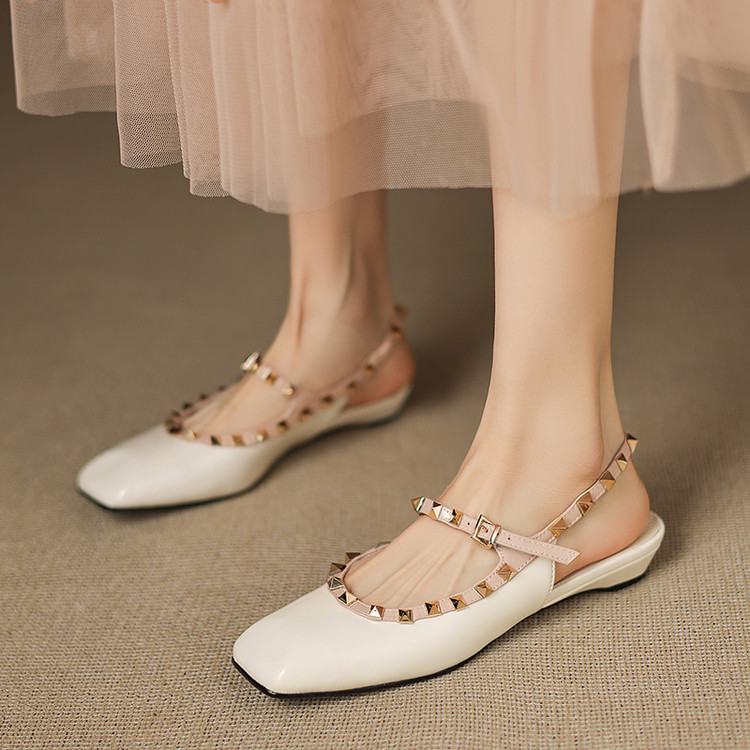 【预售5天】法式气质温柔风铆钉包头浅口方头玛丽珍凉鞋女一字带低跟HTK&F2310-3