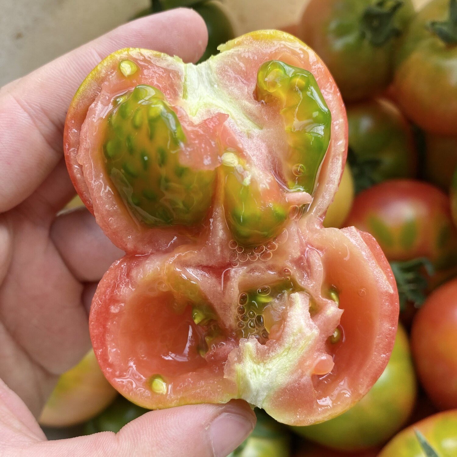 因底部有一小圈绿纹青肩,尤其是绿芯的纹理看起来非常像草莓,故命名为“草莓西红柿”。