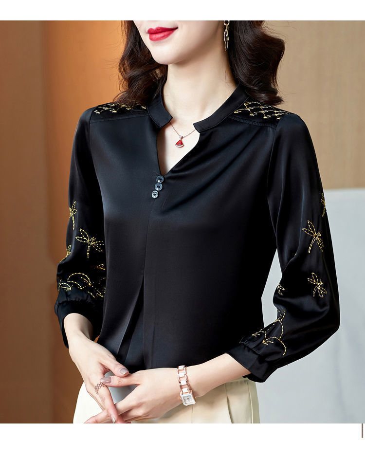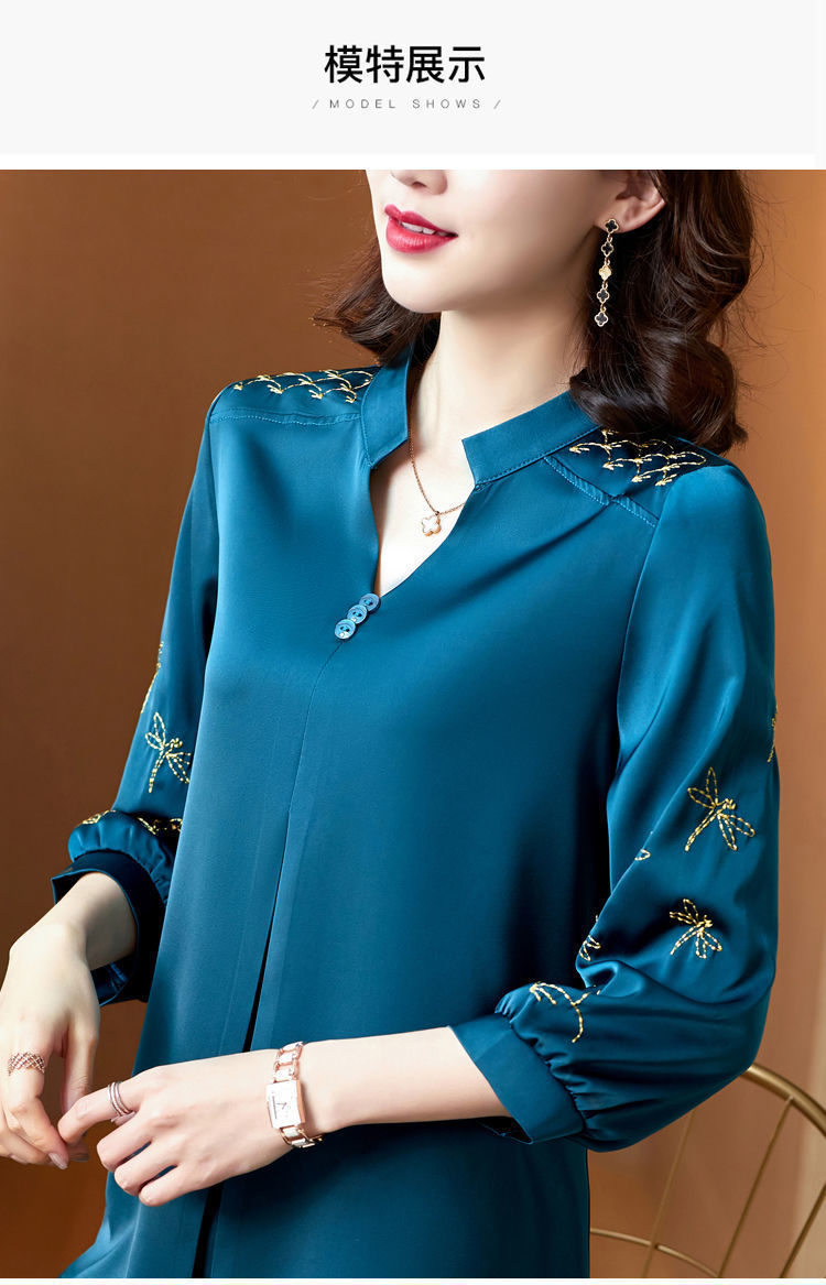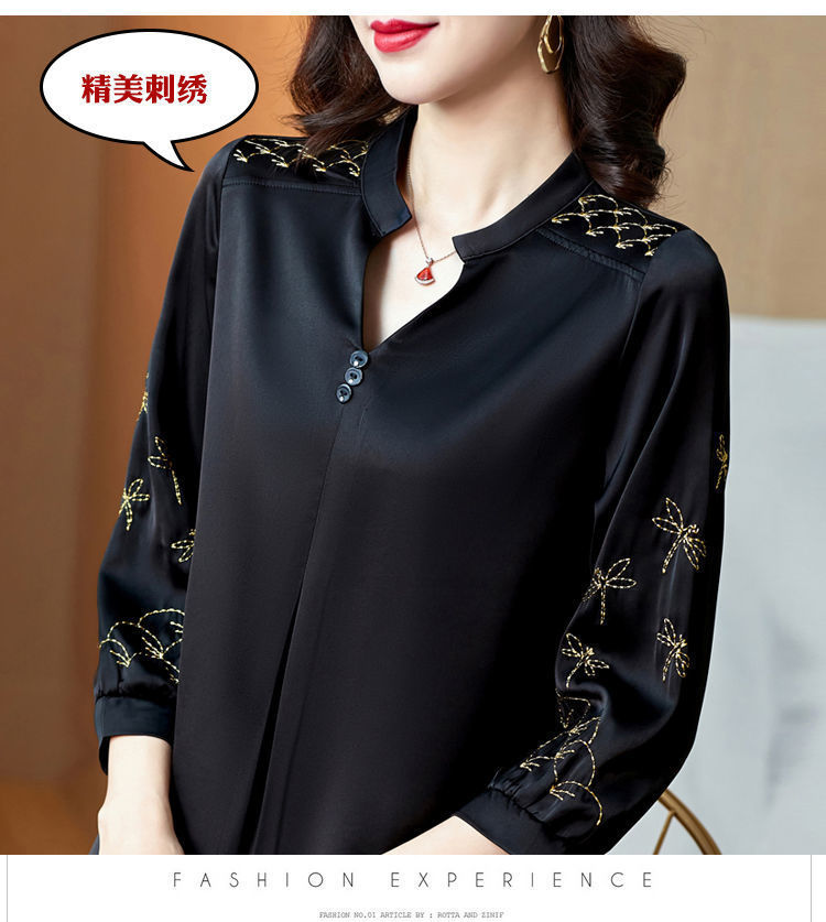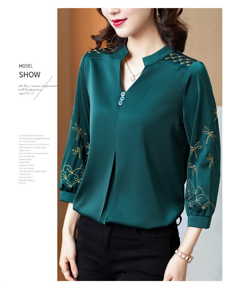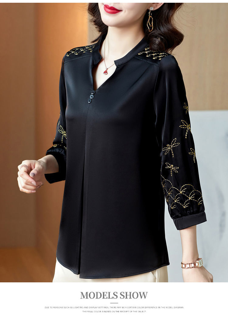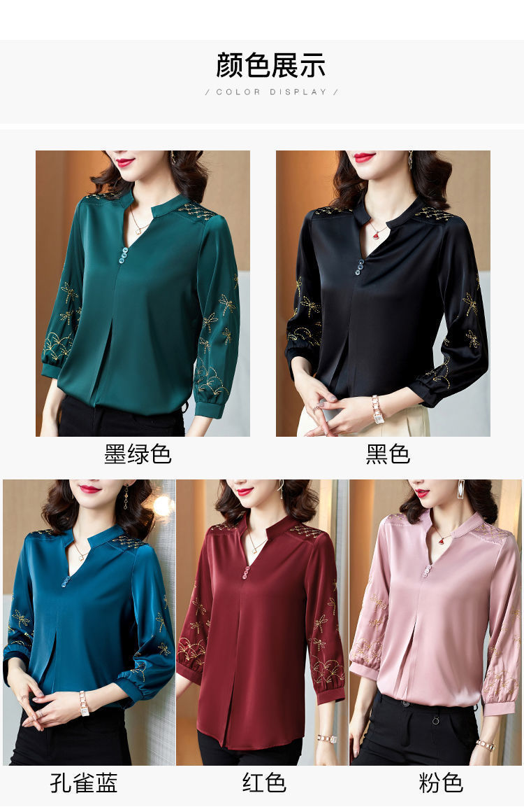 DP4503 2022新款大码宽松仿真丝缎面t恤女V领绣花七分袖衬衫时尚上衣