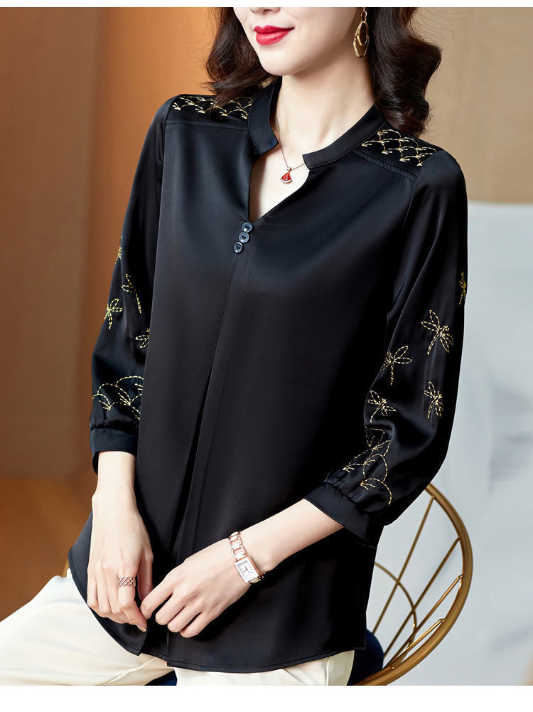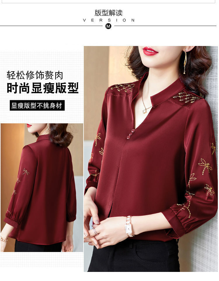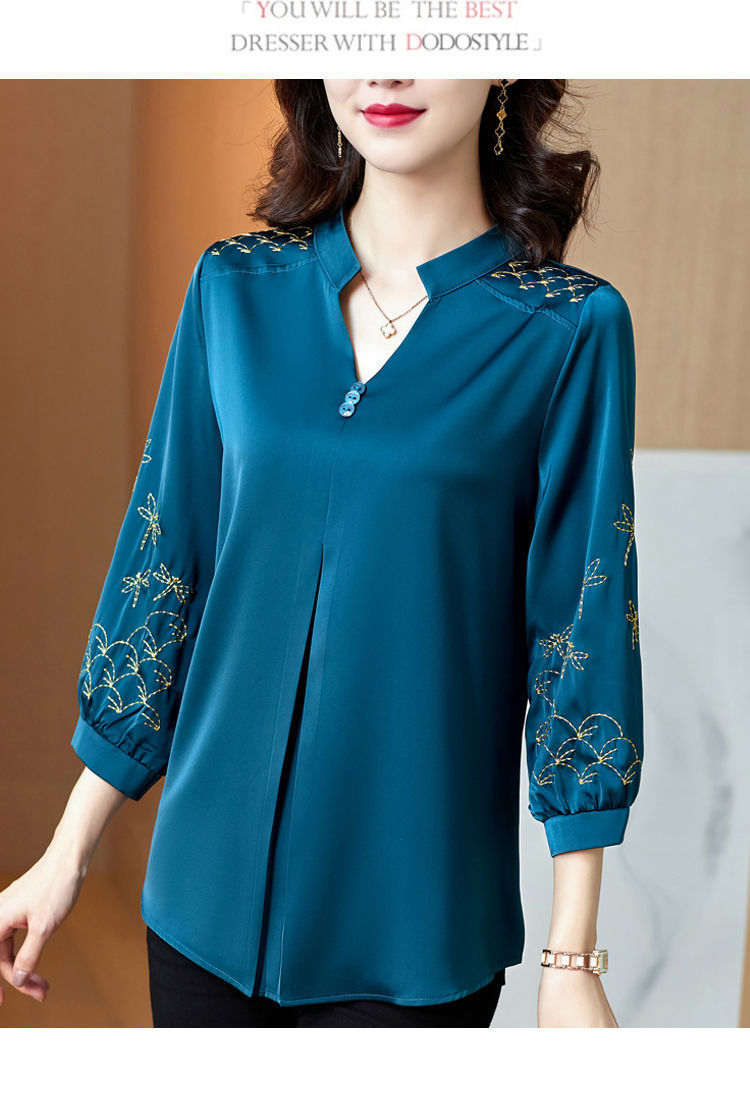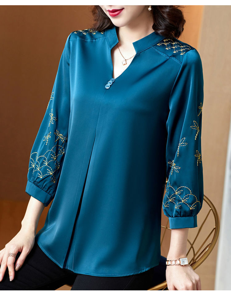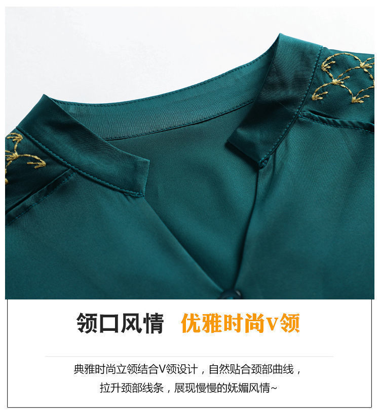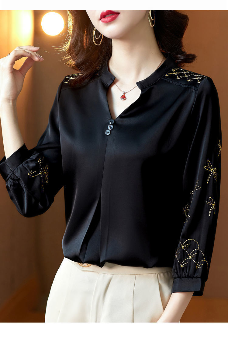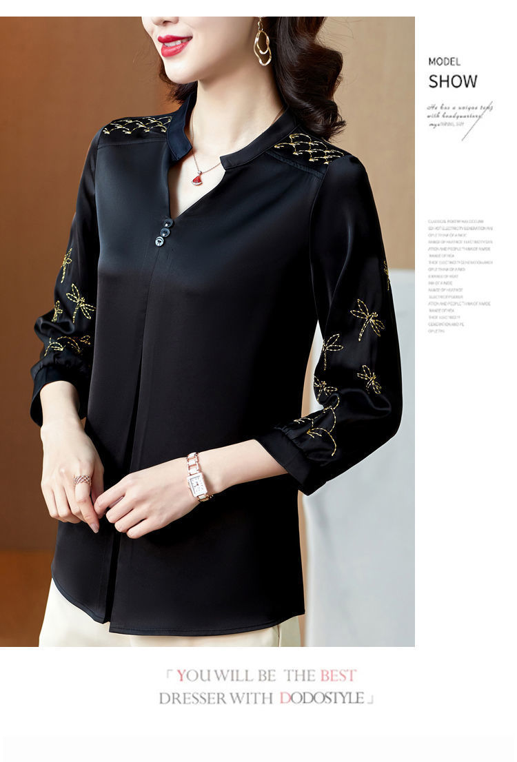 DP4503 2022新款大码宽松仿真丝缎面t恤女V领绣花七分袖衬衫时尚上衣