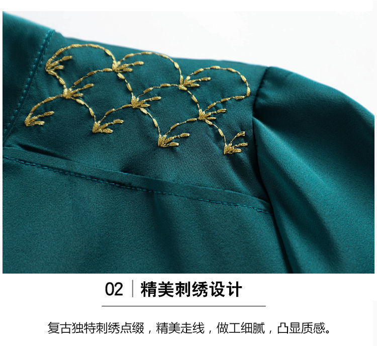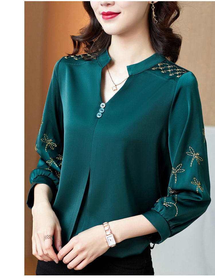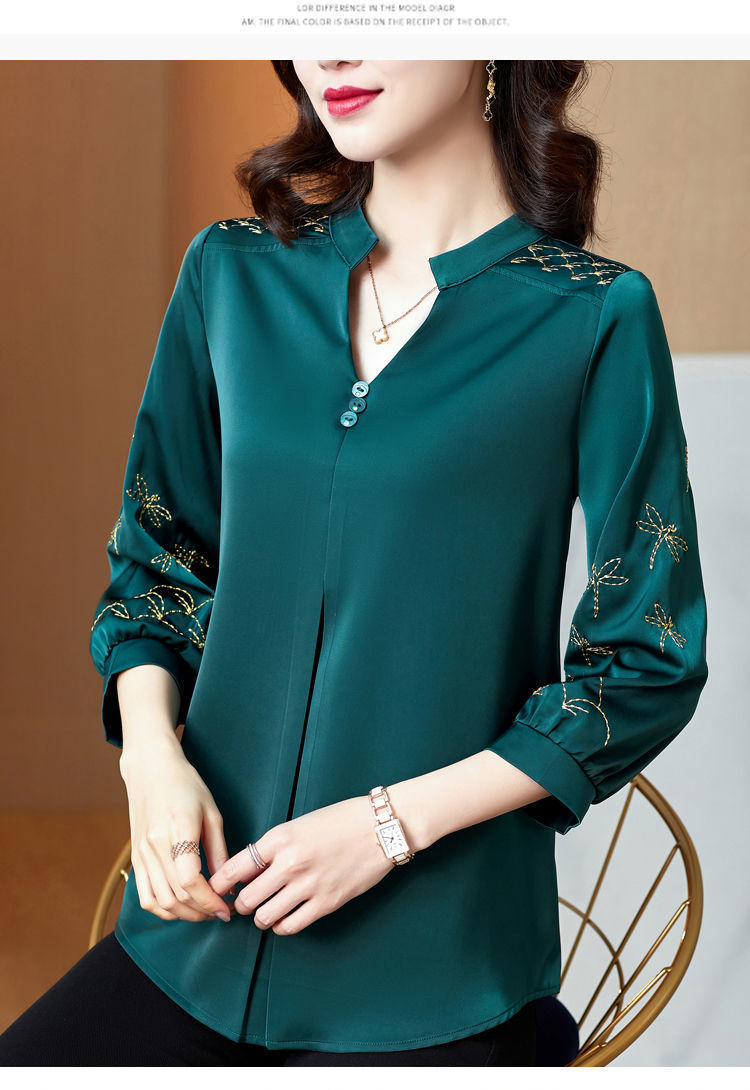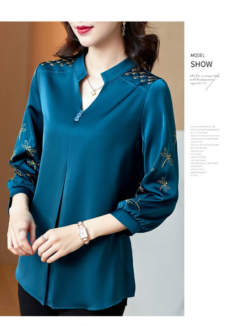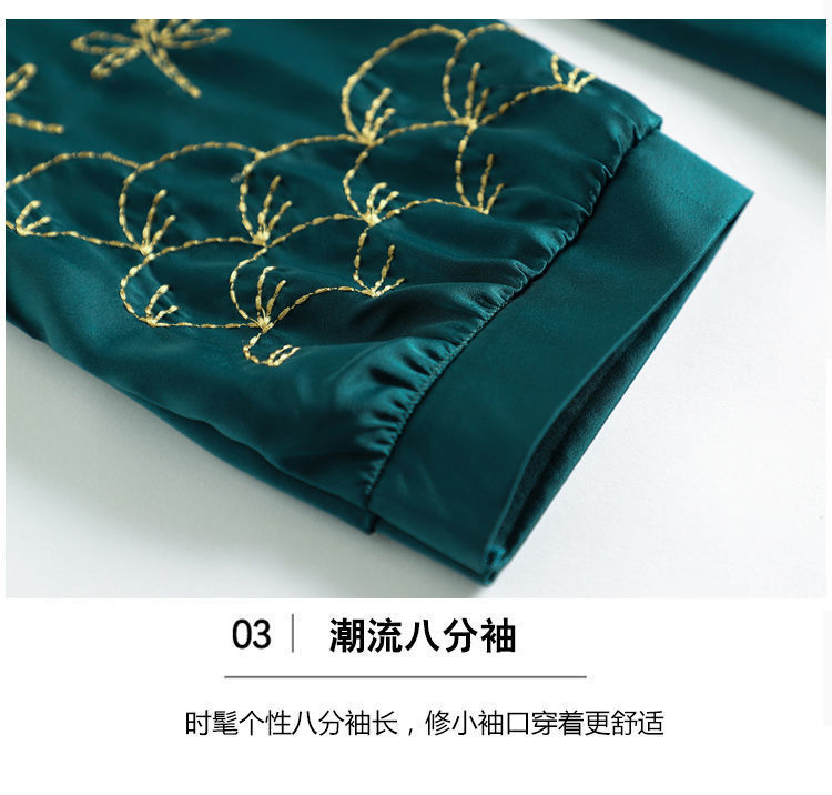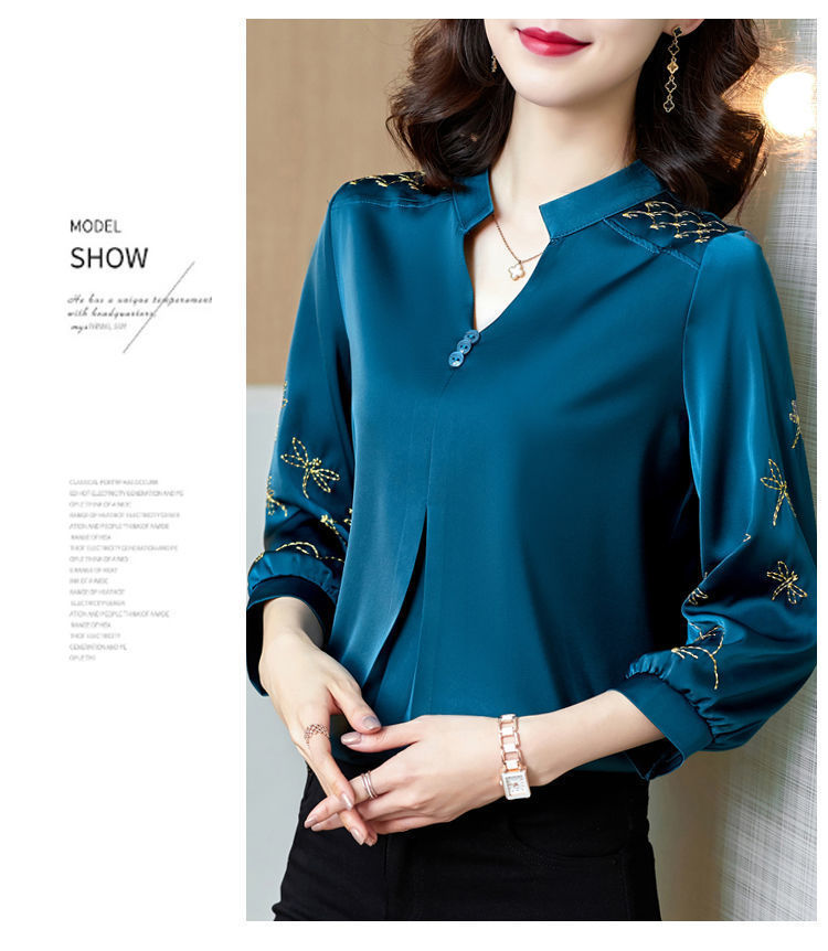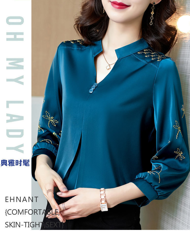 DP4503 2022新款大码宽松仿真丝缎面t恤女V领绣花七分袖衬衫时尚上衣