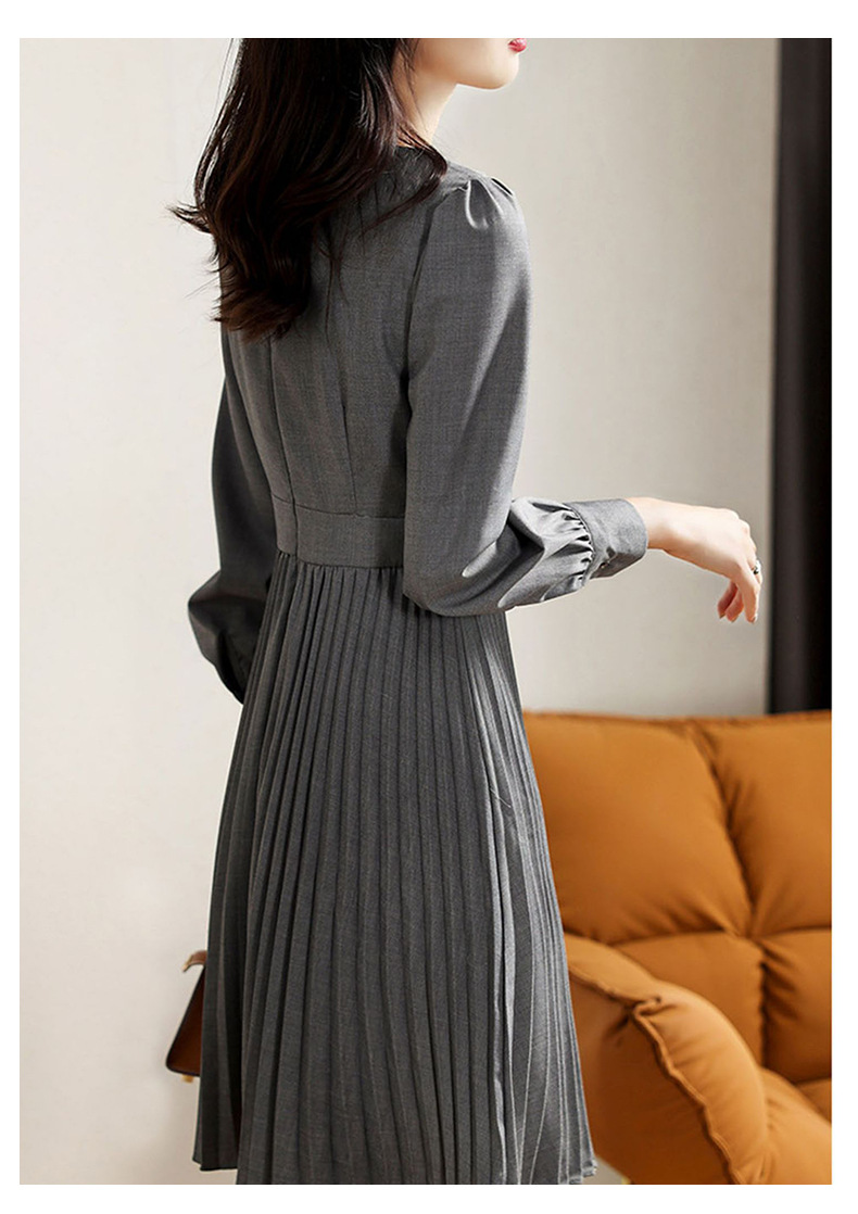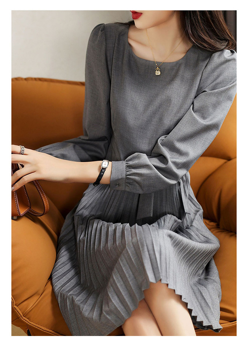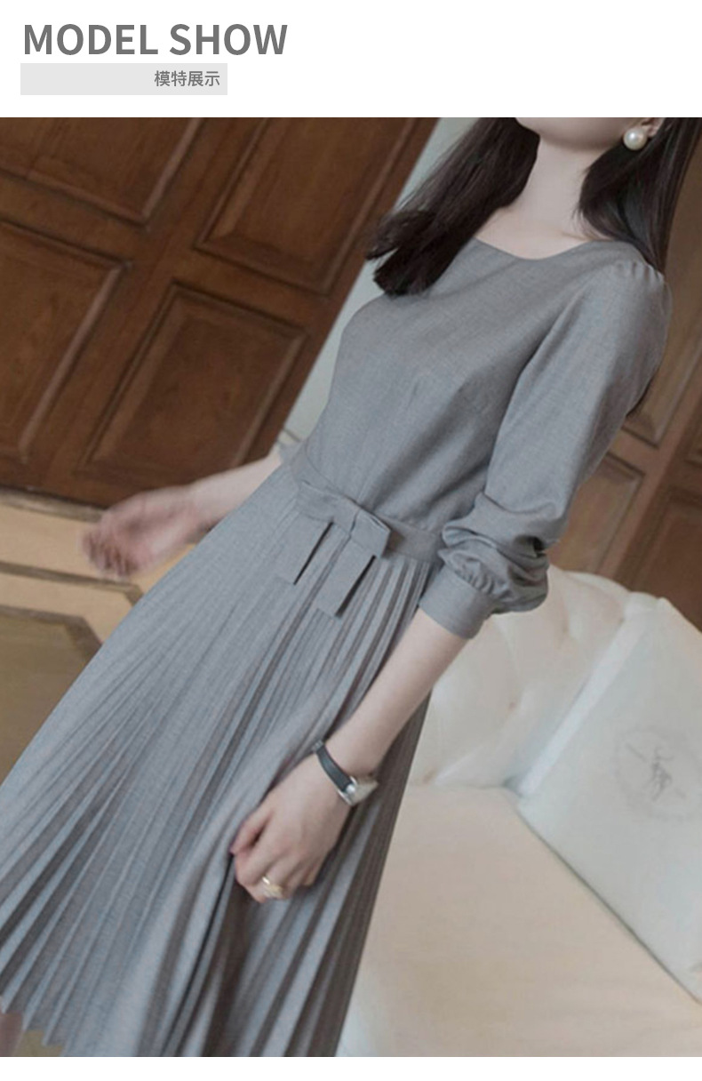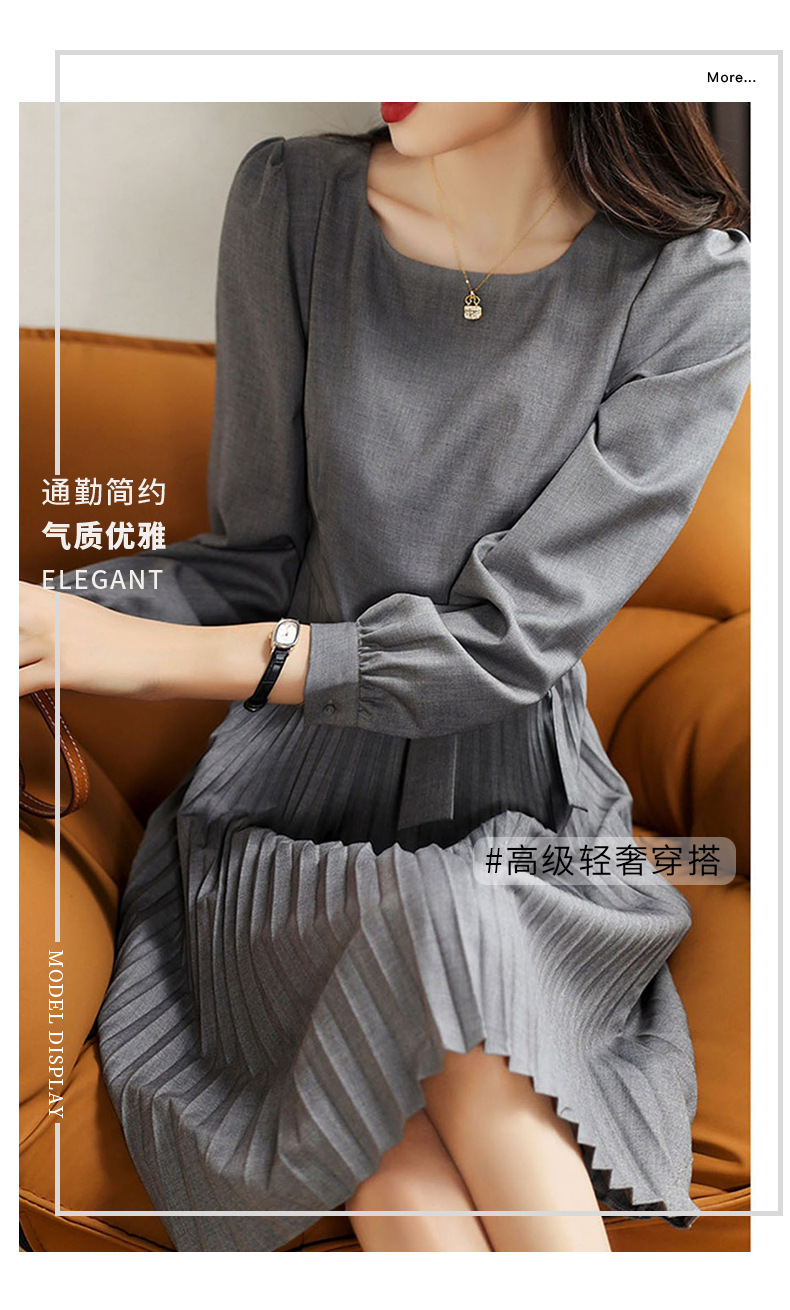 丁摩 秋季新款圆领长袖灰色连衣裙女气质高端女神百褶中裙 5ZF-3251