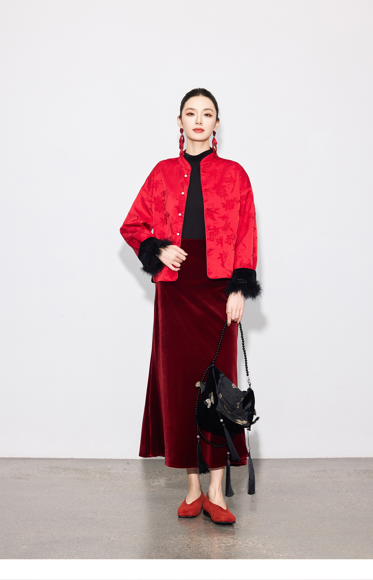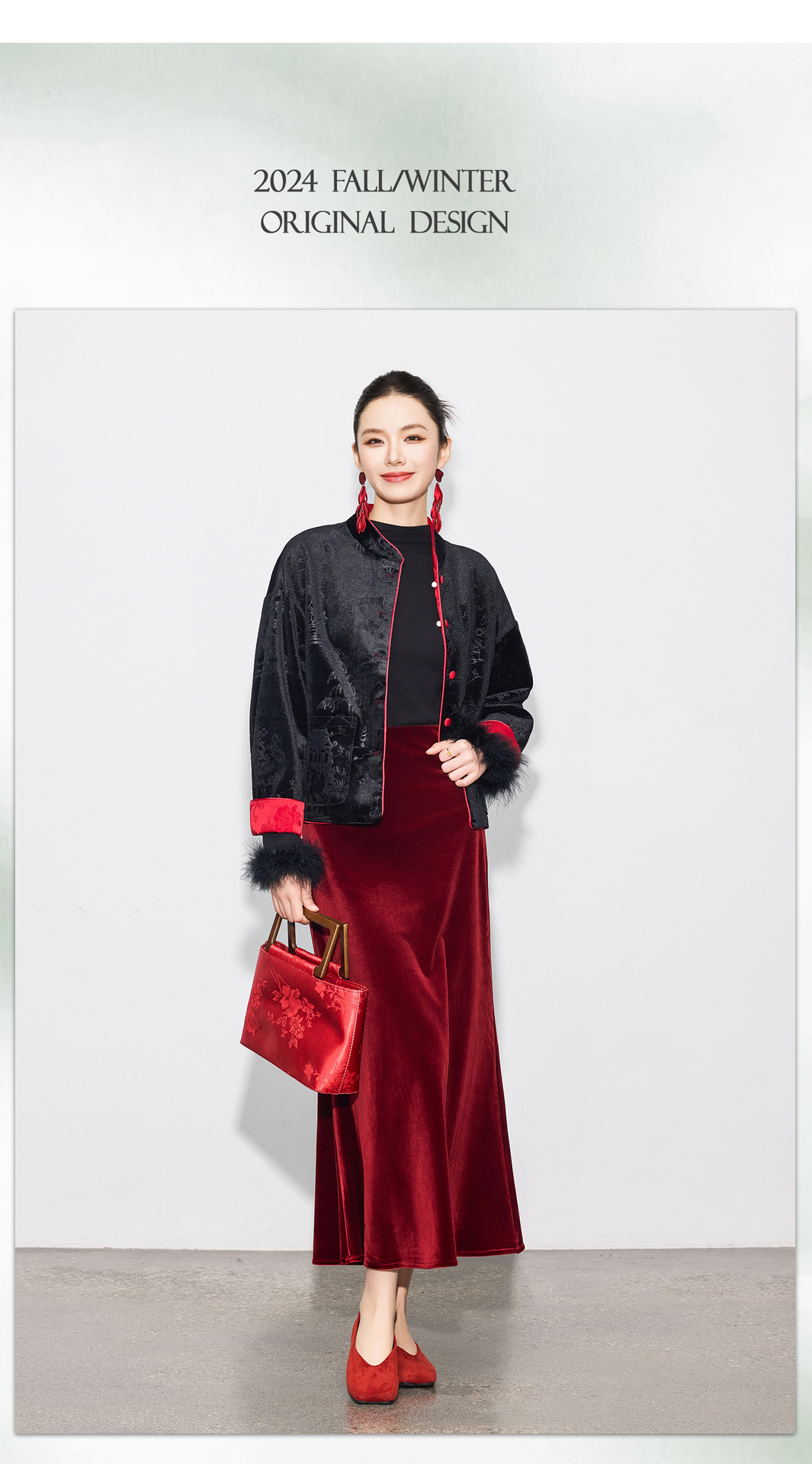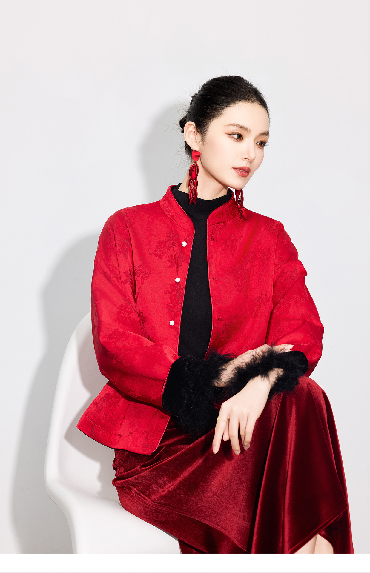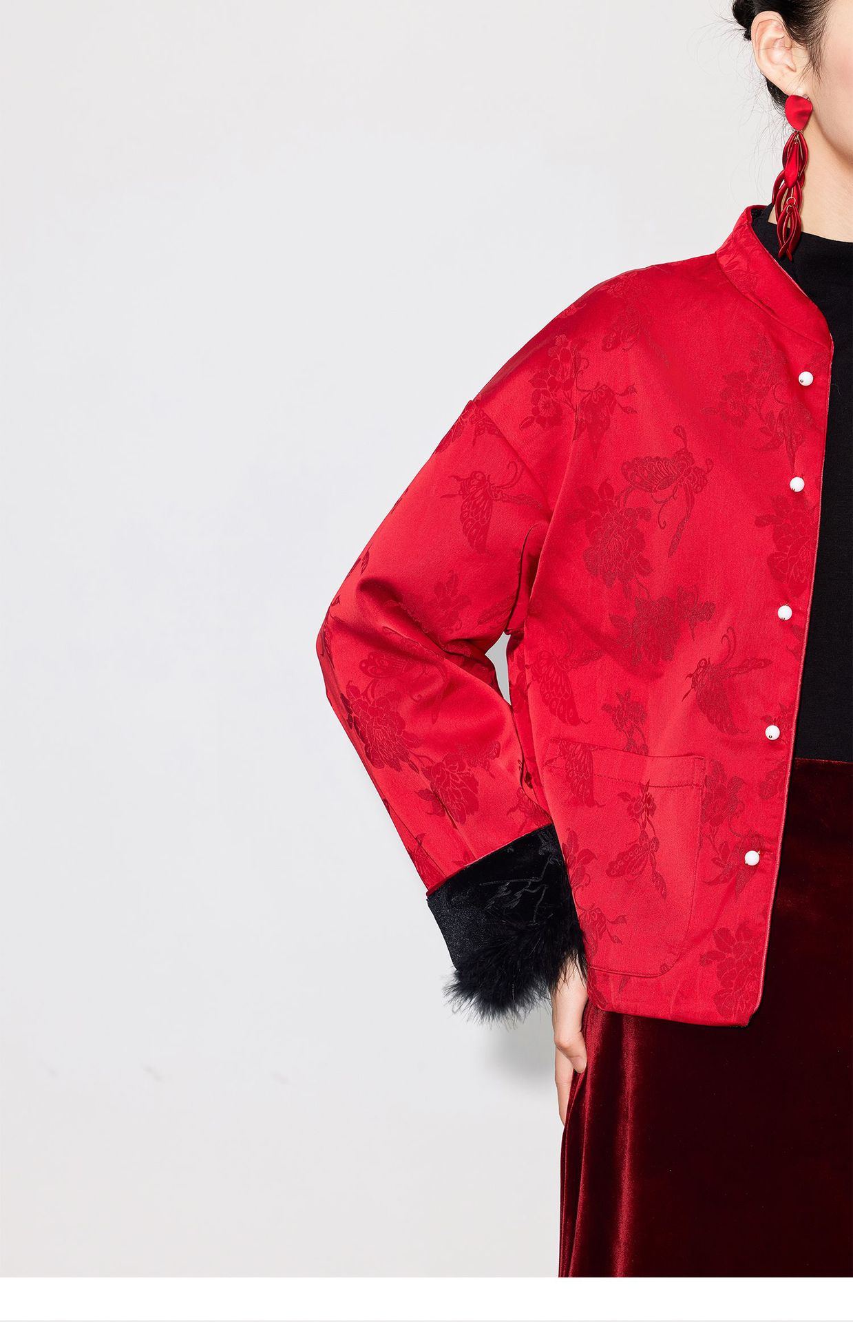 【丁摩】秋季新中式双面穿丝绒提花上衣改良唐装红色外套女5786