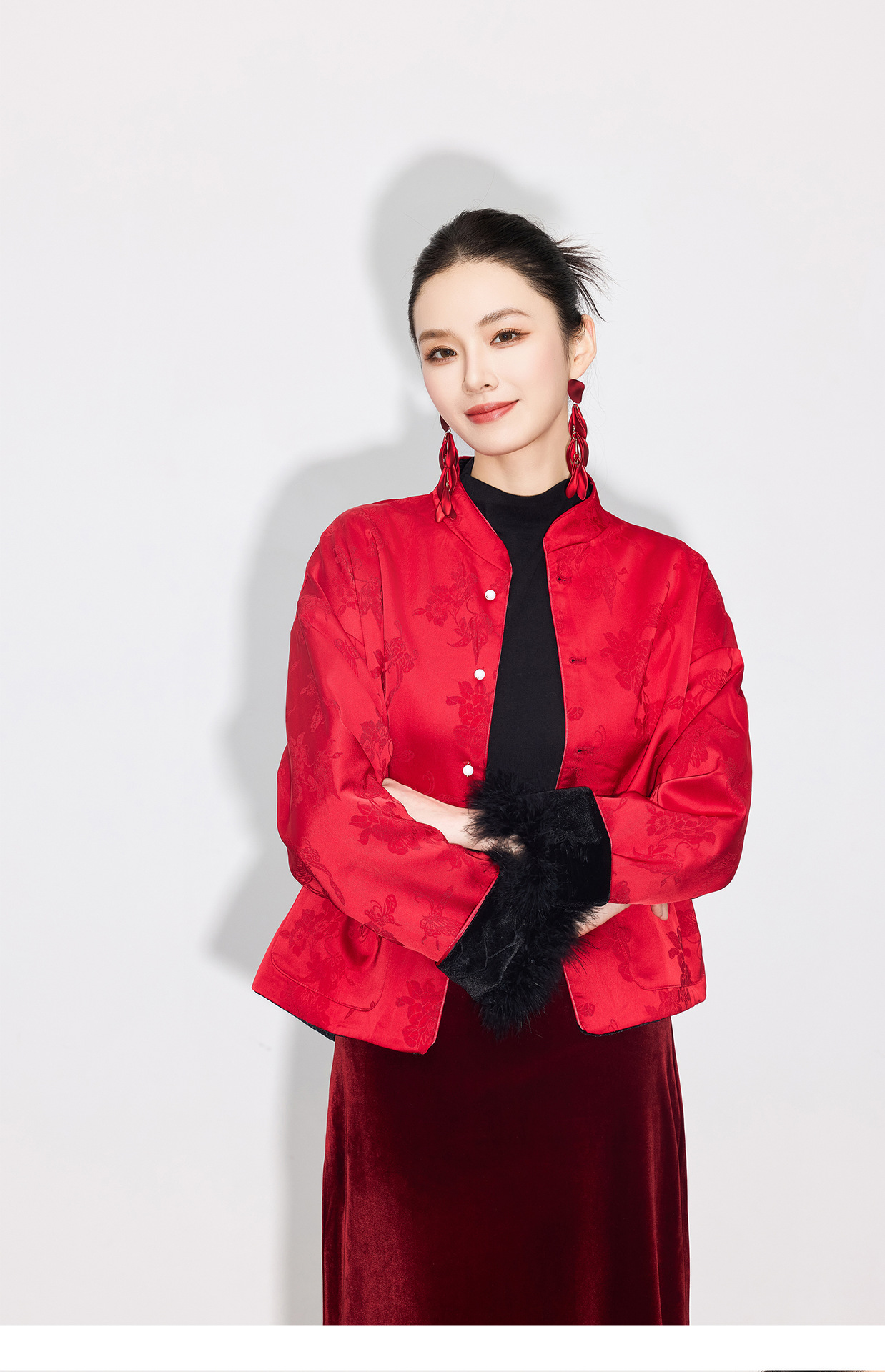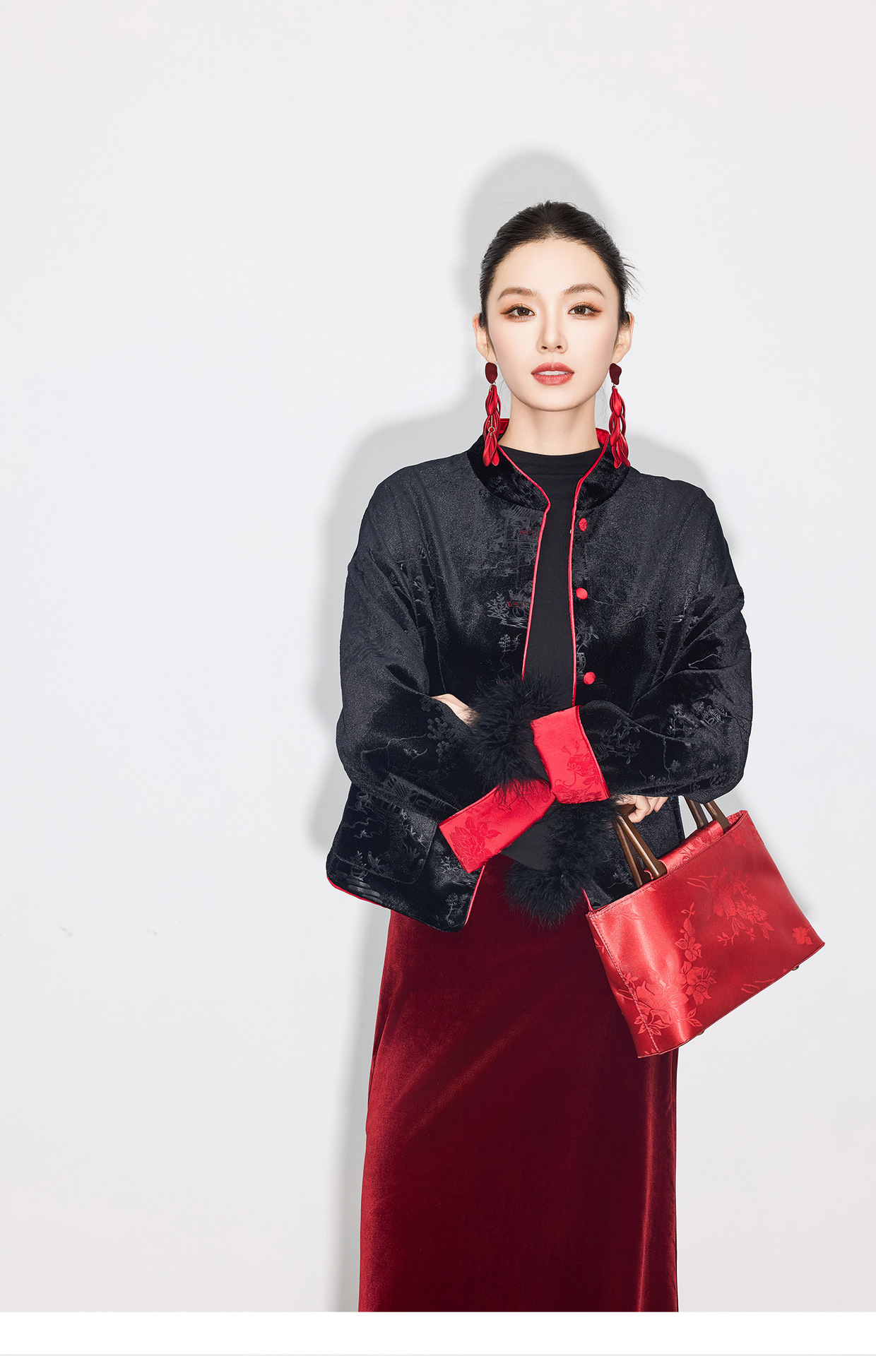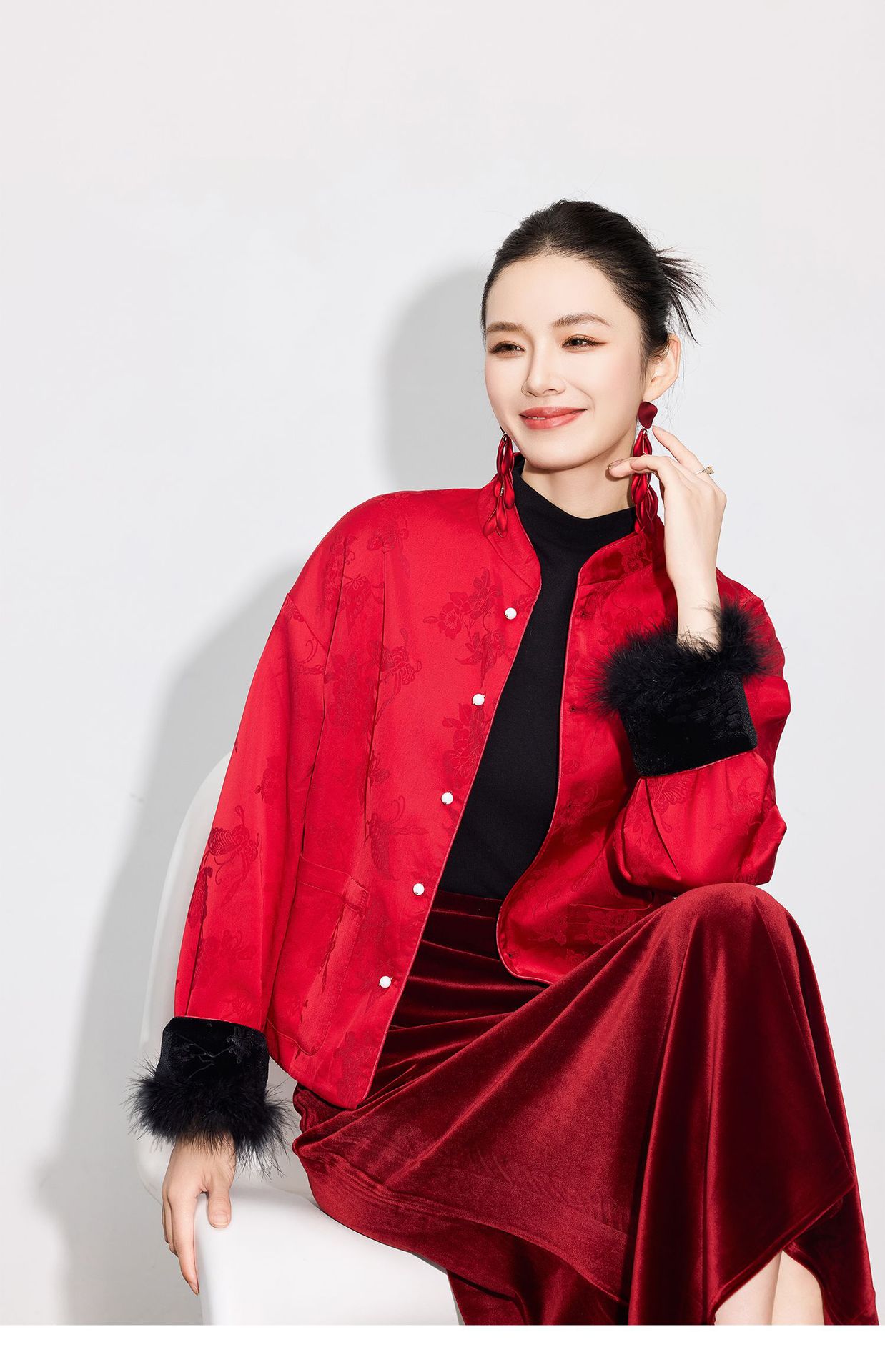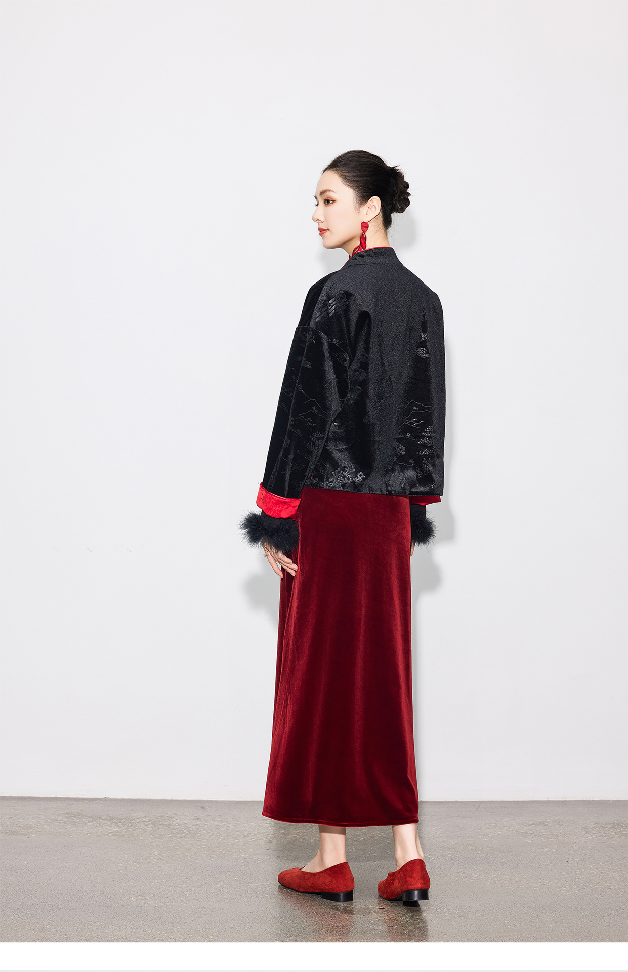 【丁摩】秋季新中式双面穿丝绒提花上衣改良唐装红色外套女5786