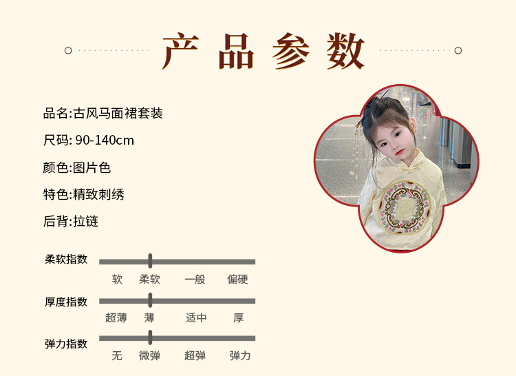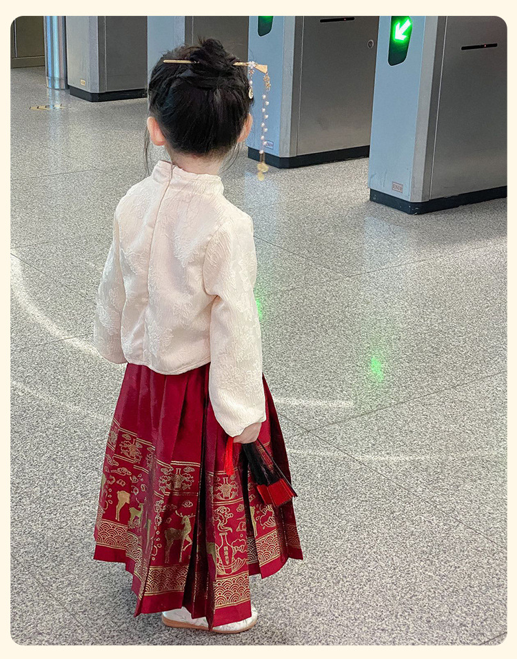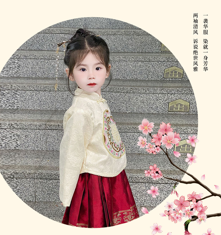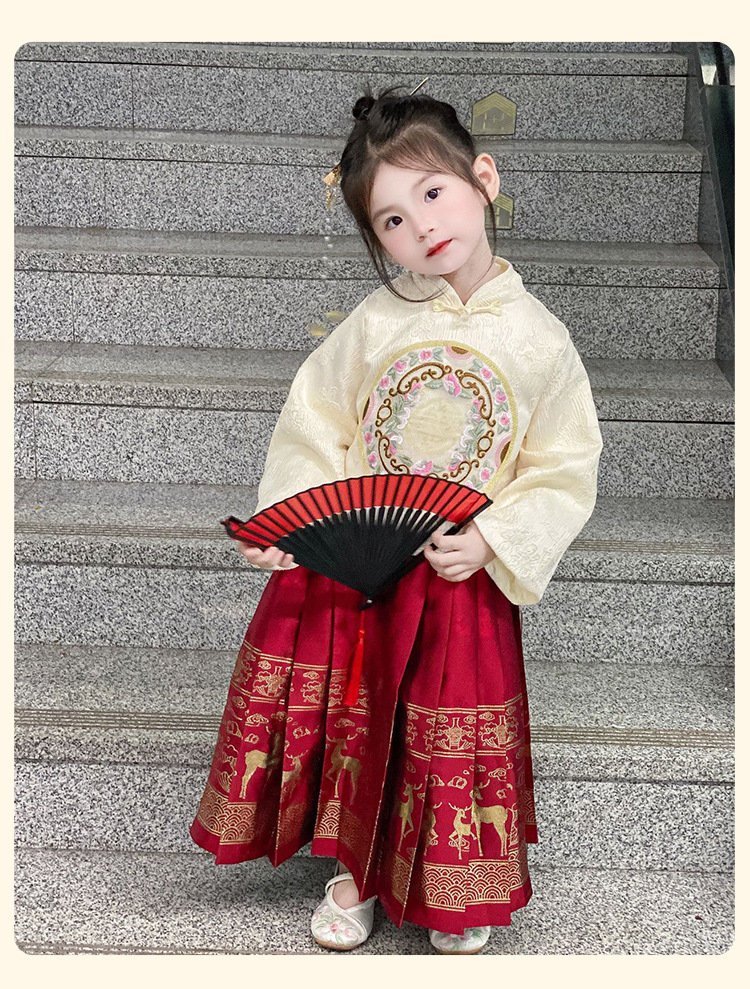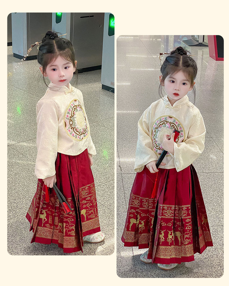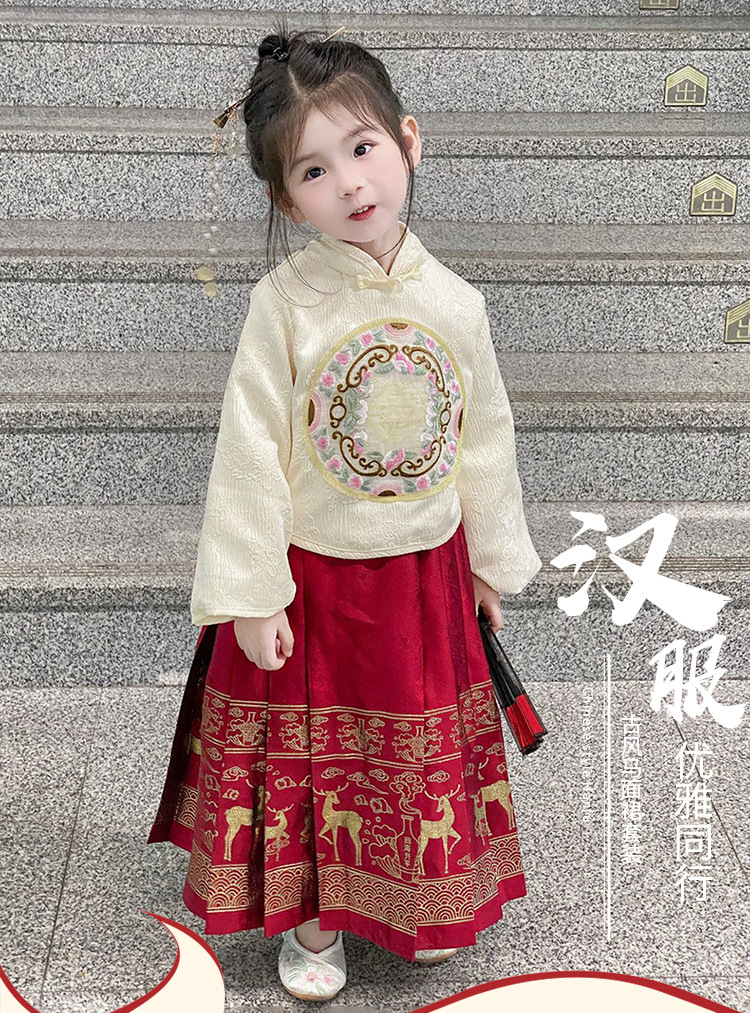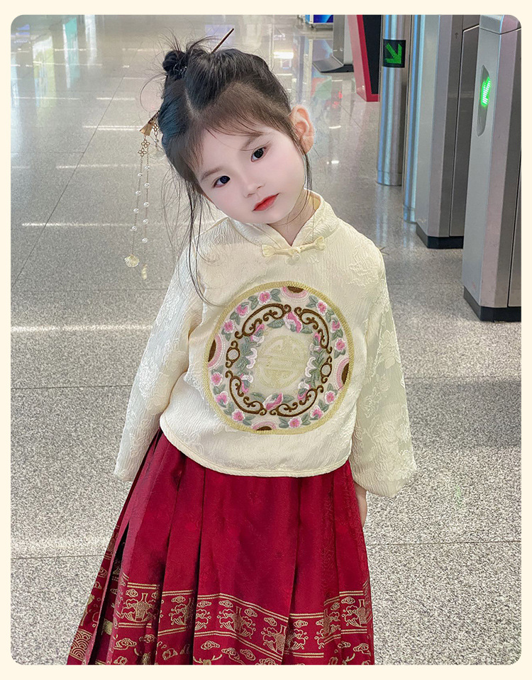 【女童马面裙套装!汉服时尚新美学】秋冬长袖儿童汉服国风,改良唐装女宝宝古装裙子,马面图案在纯净白色中流转,传承经典又融入时尚元素,儿童汉服的复古气息和仙女般的飘逸
