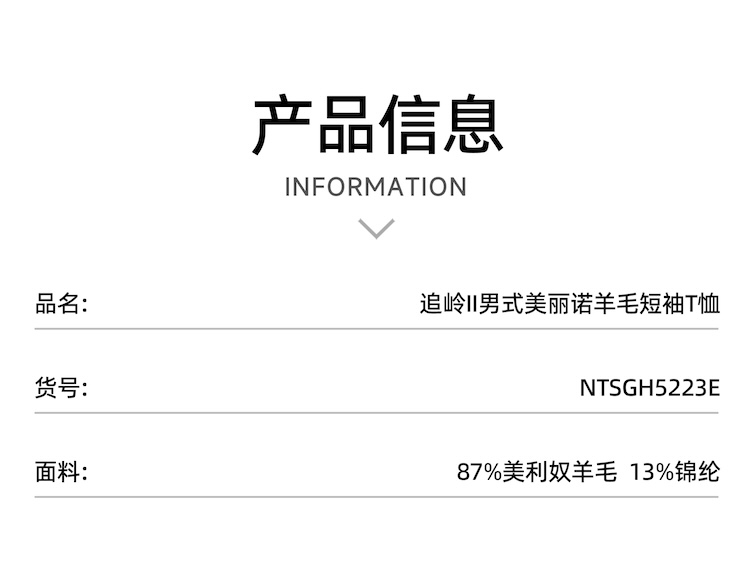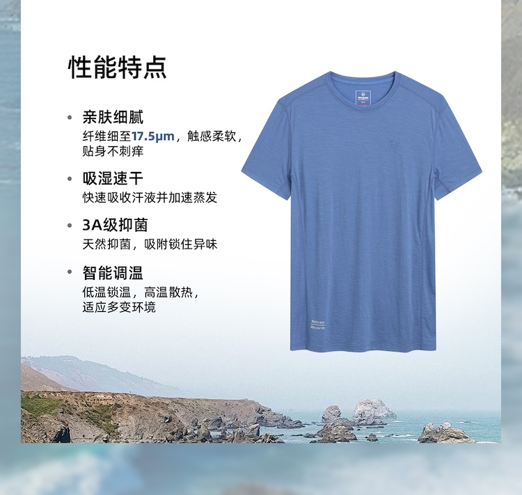 诺诗兰 追岭II男式美丽诺羊毛短袖T恤 贴身舒适不刺痒,吸湿速干特性,柔软弹力剪裁贴合身形,打造全天候舒适穿着体验。 NTSGH5223E