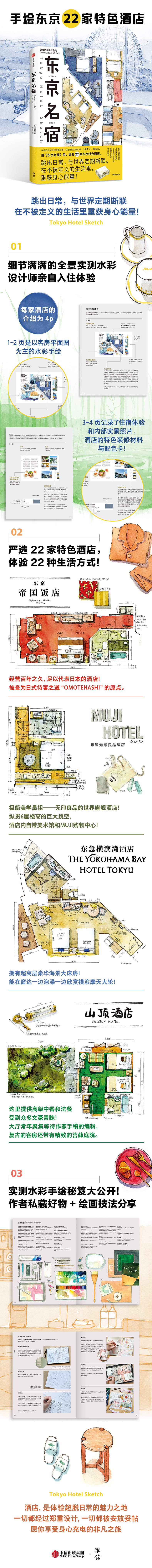 🌟 水彩手绘爱好者入练习宝典!典日系水彩画风——温柔细腻、怀旧治愈。日本著名设计师远藤慧实地测绘,现实与虚构,两种怦然心动的美丽。🌟巡礼日本的特色主题指南!精选22家性质各异、体验不同的东京特色住宿之地:不仅有百年国营酒店、高端精品酒店、小众设计师民宿,甚至还有前沿的睡眠实验室和书店旅舍,甚至包括包括“日本的门面”东京帝国酒店!每一家的餐食、睡眠、旅居体验都事无巨细地画了下来,包括装修特色和色彩搭配!妙的是,每家酒店还有好物品牌荐,非常实用!