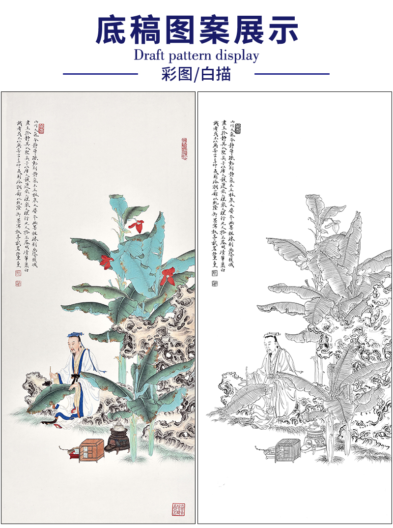 任重山水人物工笔画白描底稿《书蕉图》芭蕉临摹勾线高清打印稿RD47