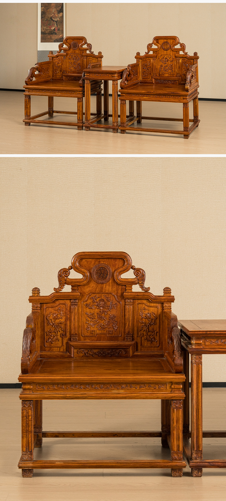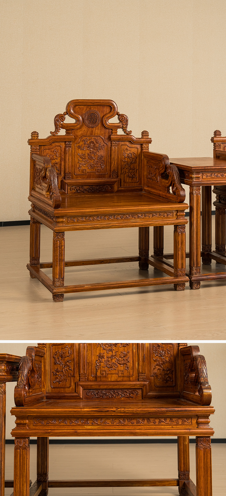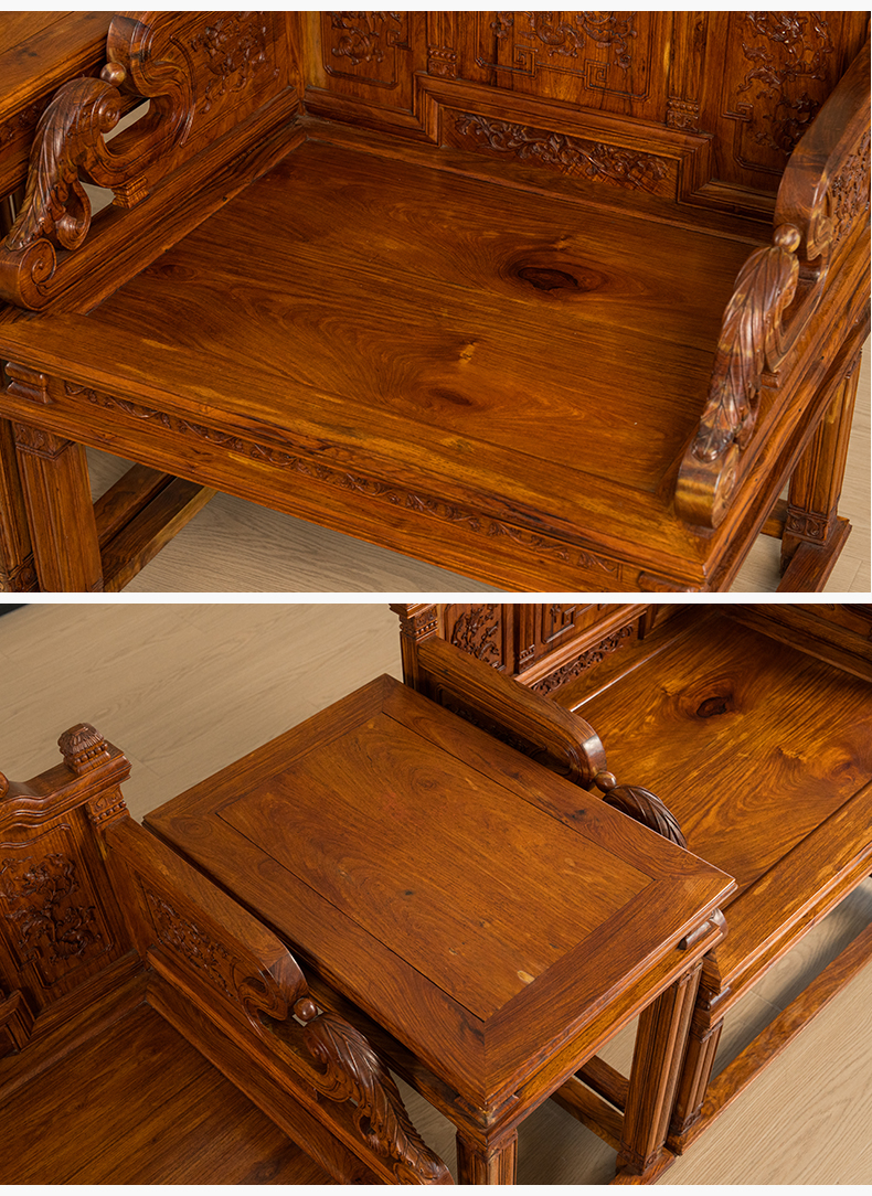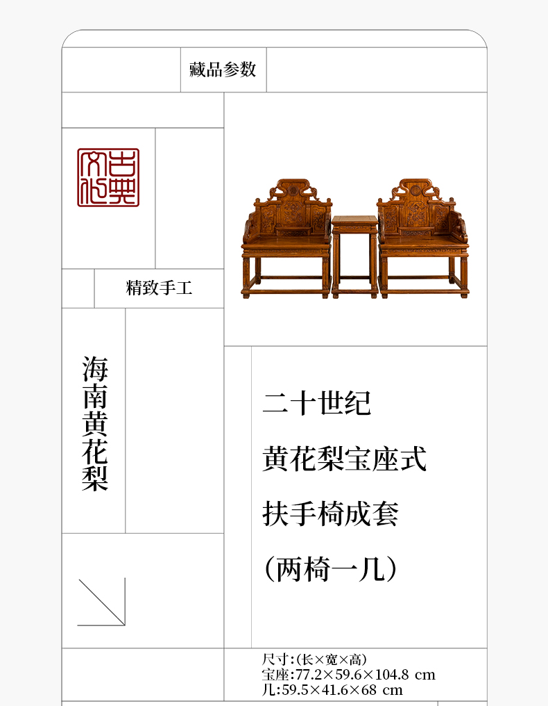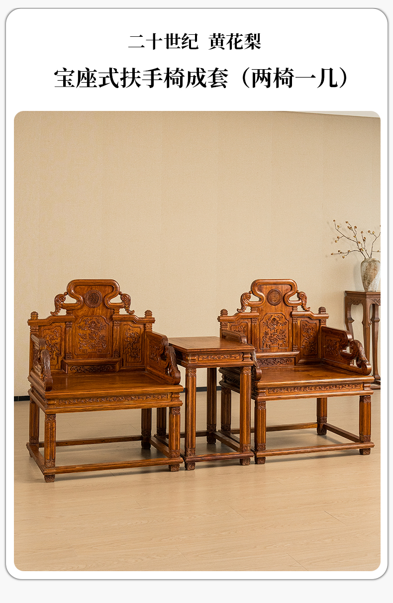 二十世纪 黄花梨宝座式扶手椅成套(两椅一几)
