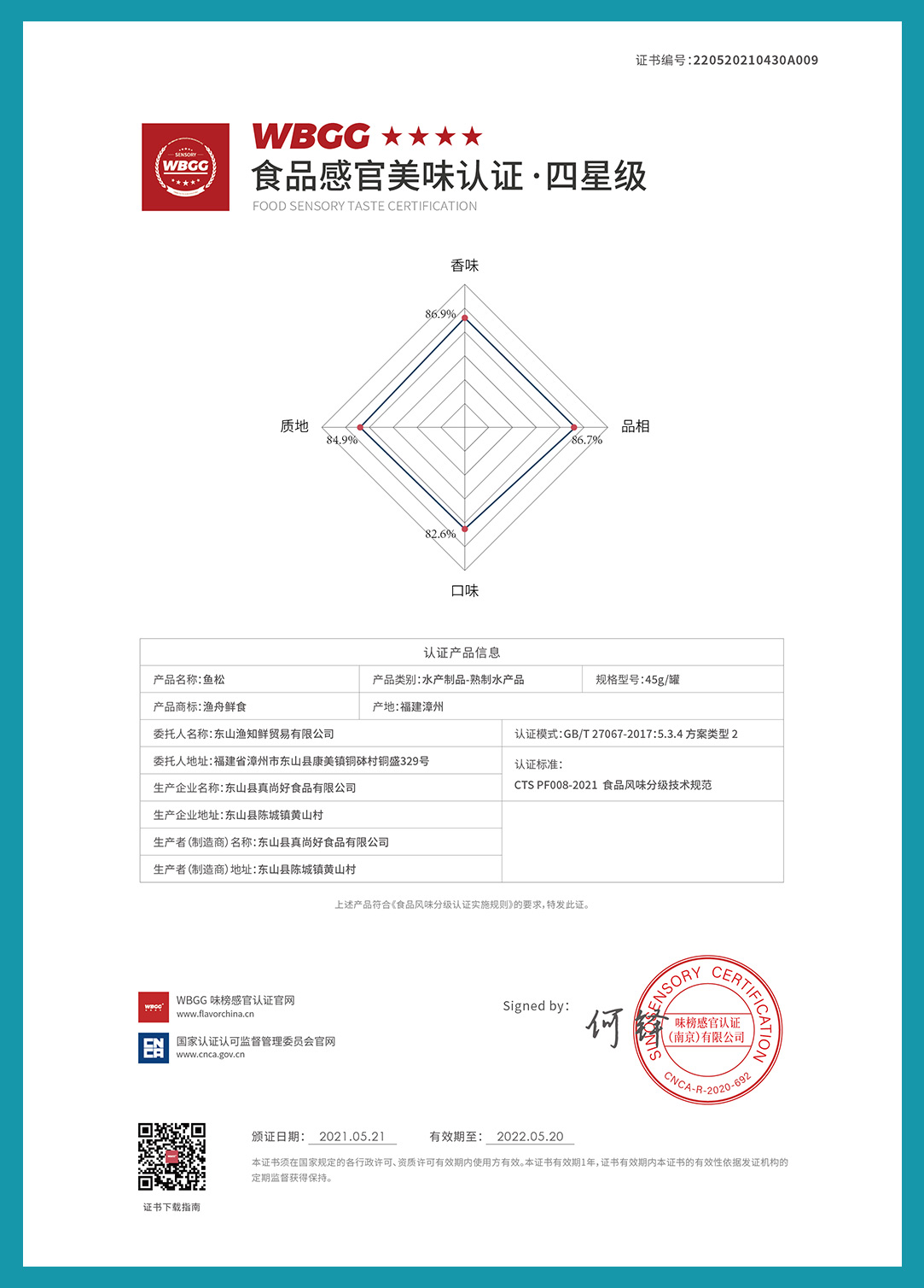 优质食品除了需要优质原料外,更离不开完善的生产工艺。传承百年的古法配方与制作方法,保证了深海鱼松的醇正风味。手工炒制,巨细靡遗的卫生管控,保障了每一口鱼松的安全与健康。目前鱼松已经取得了食品生产许可证,编号为:SC12235062600548。